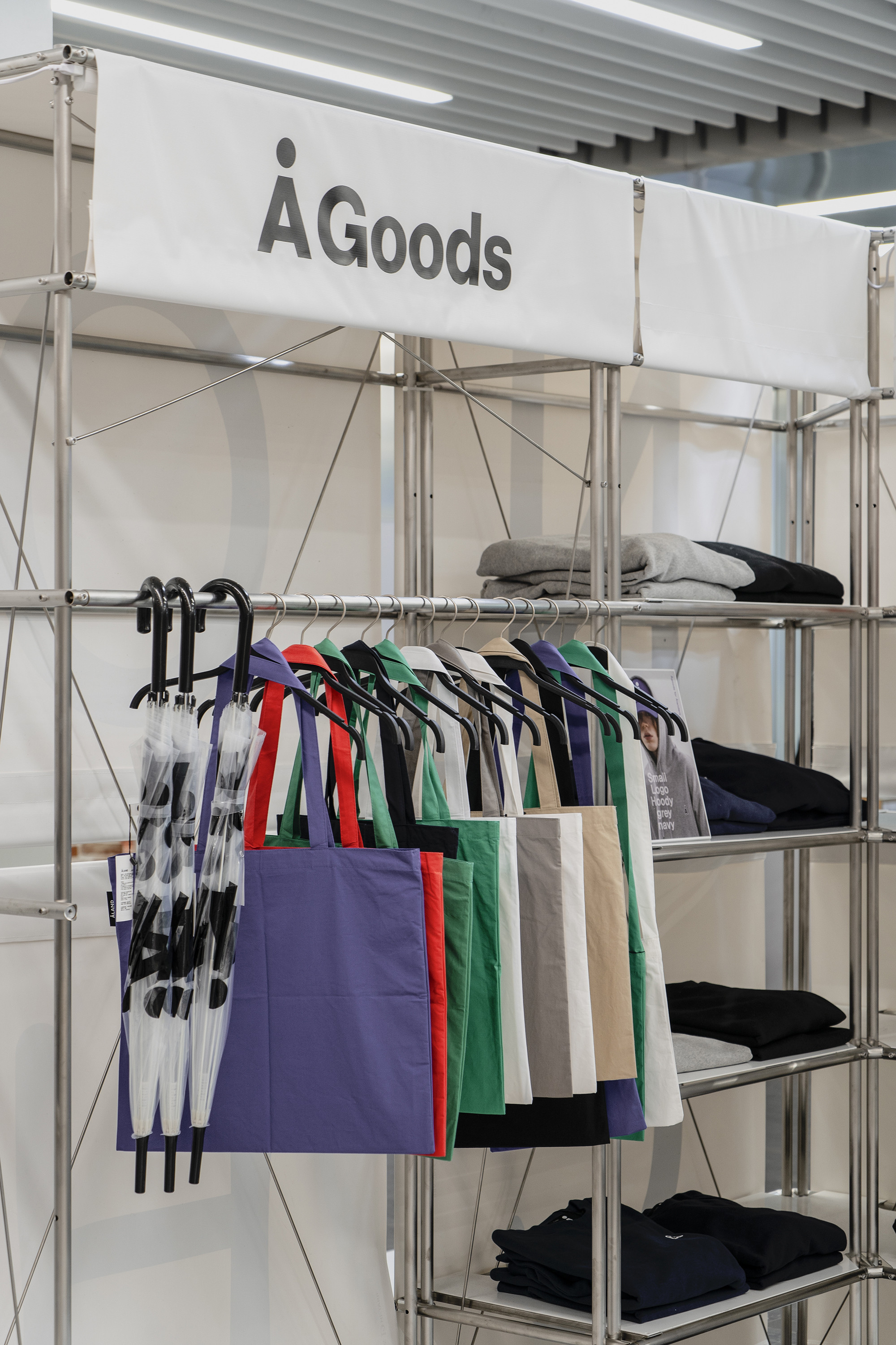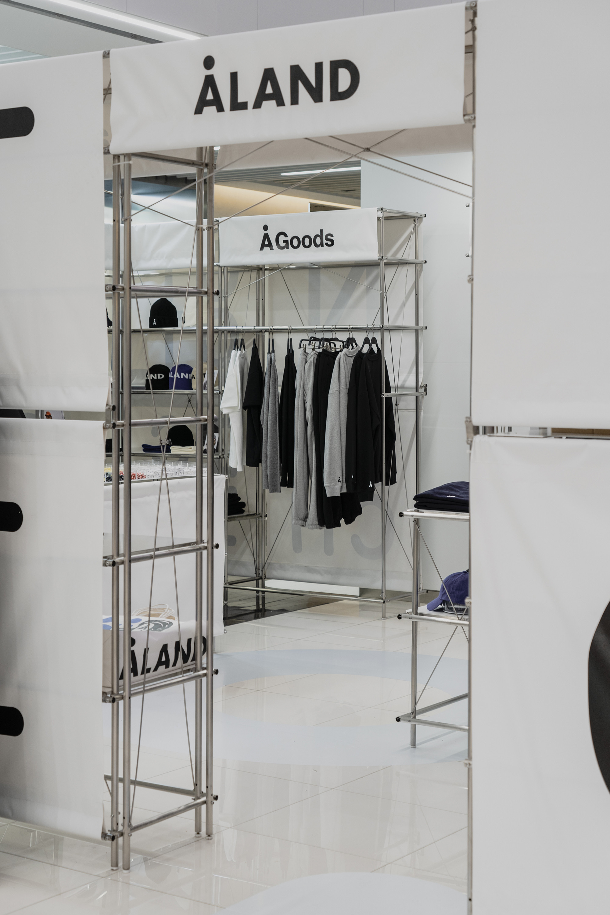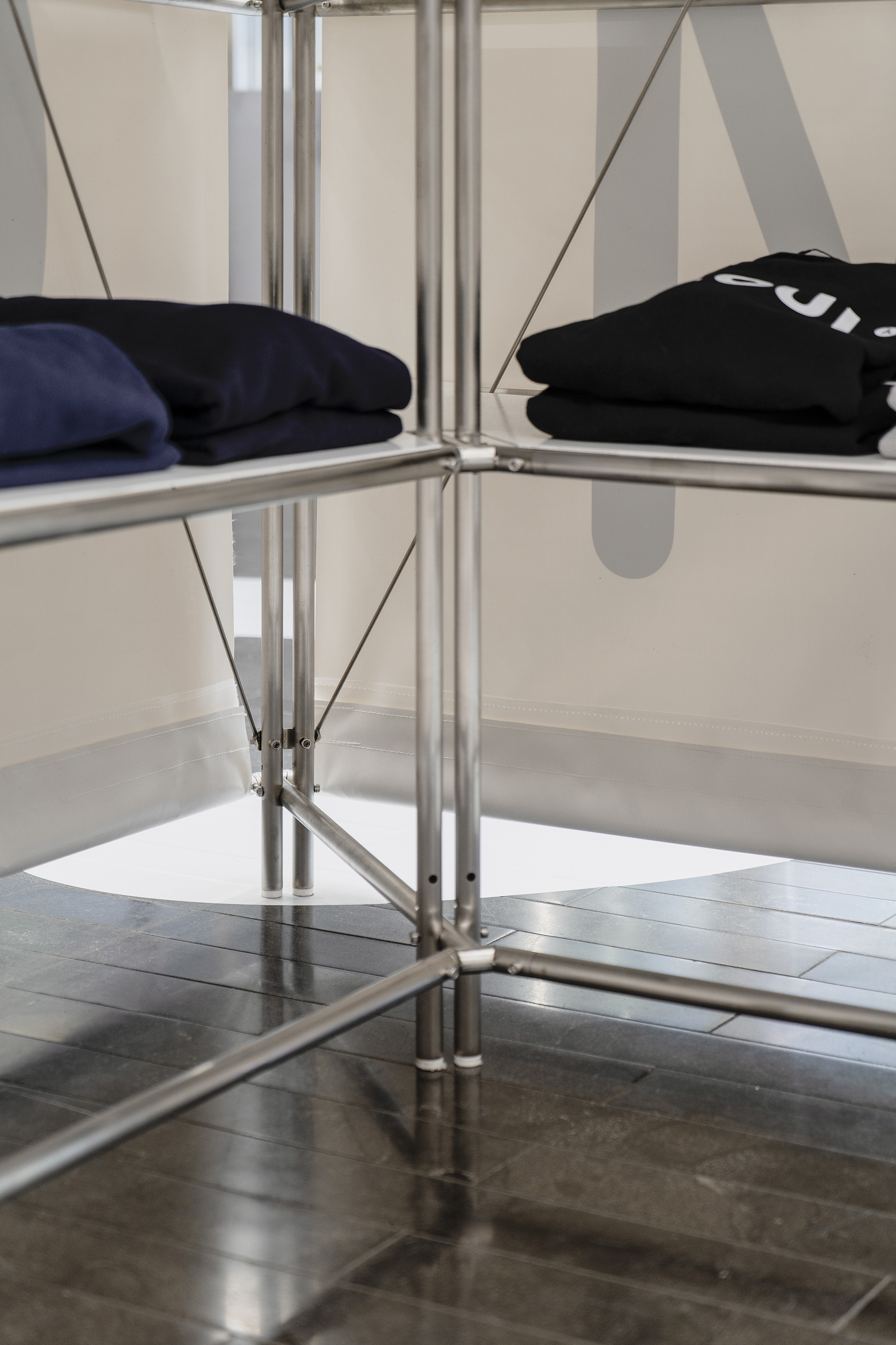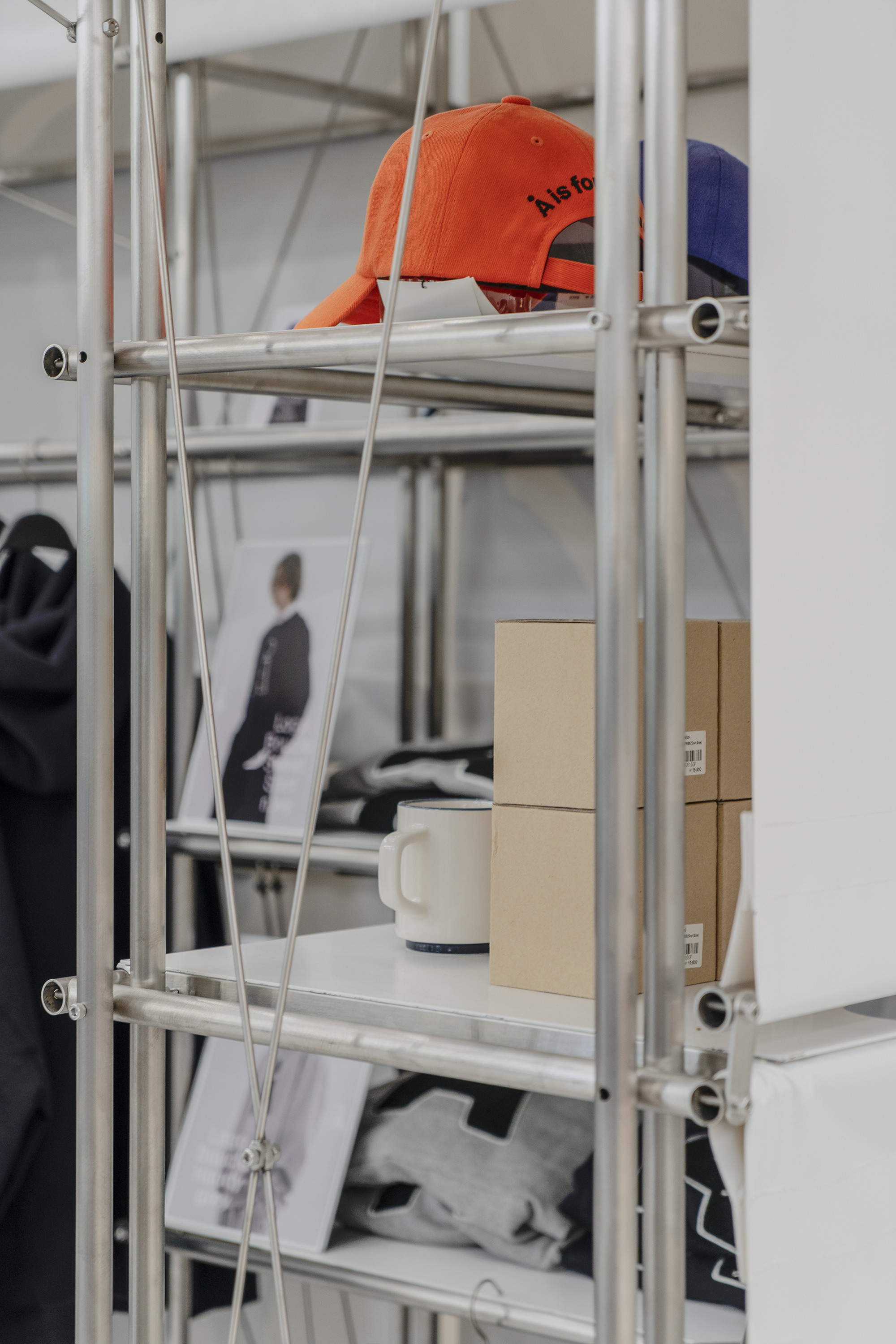 We designed a reusable pop-up store using shelves and hangers with minimal processing. To partition the space, tarpaulin fabric was utilized instead of plywood or gypsum board, enabling it to be reinstalled without disposal or additional materials. The identity of the 'pop-up store' was conveyed through the materiality and exposed hardware.