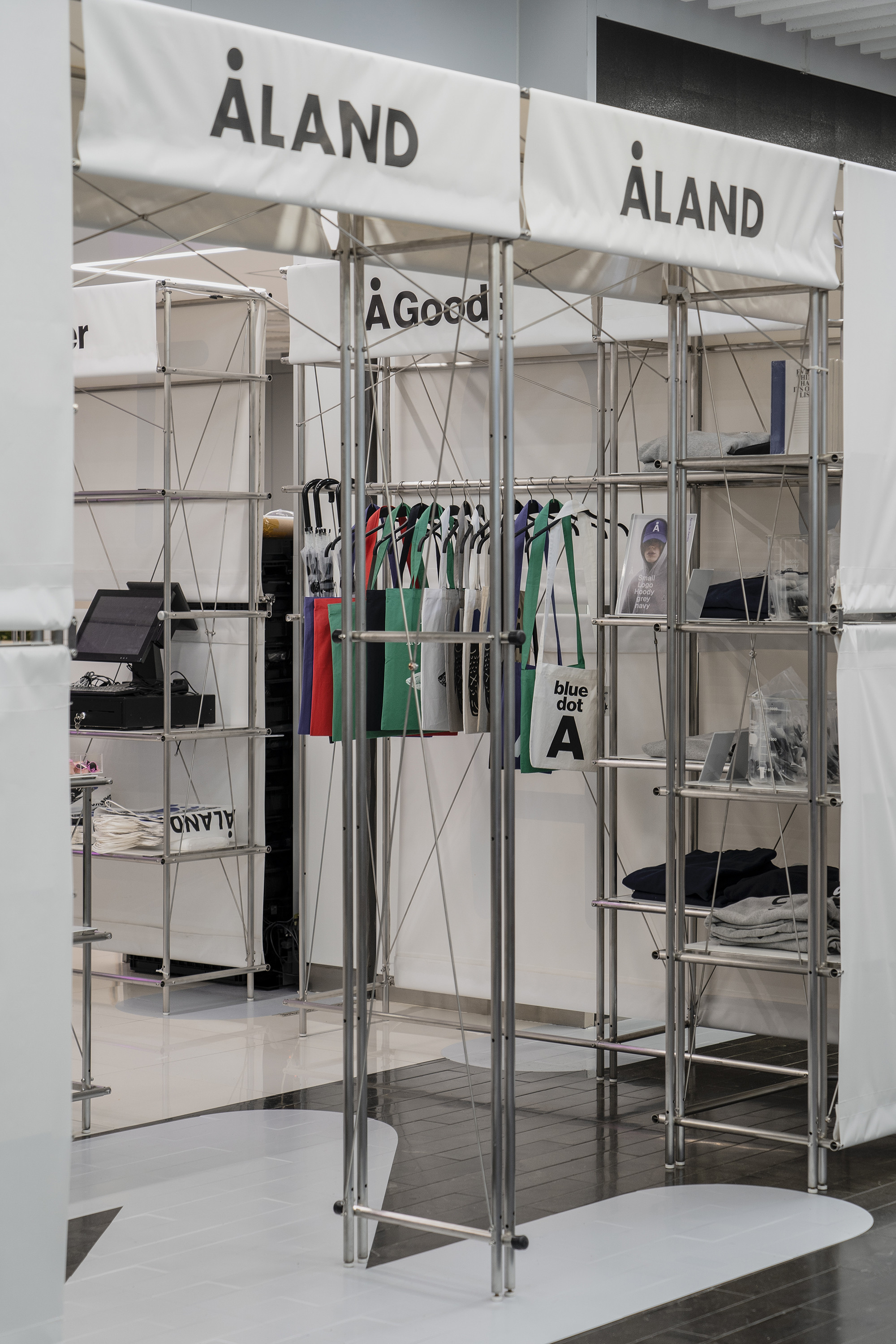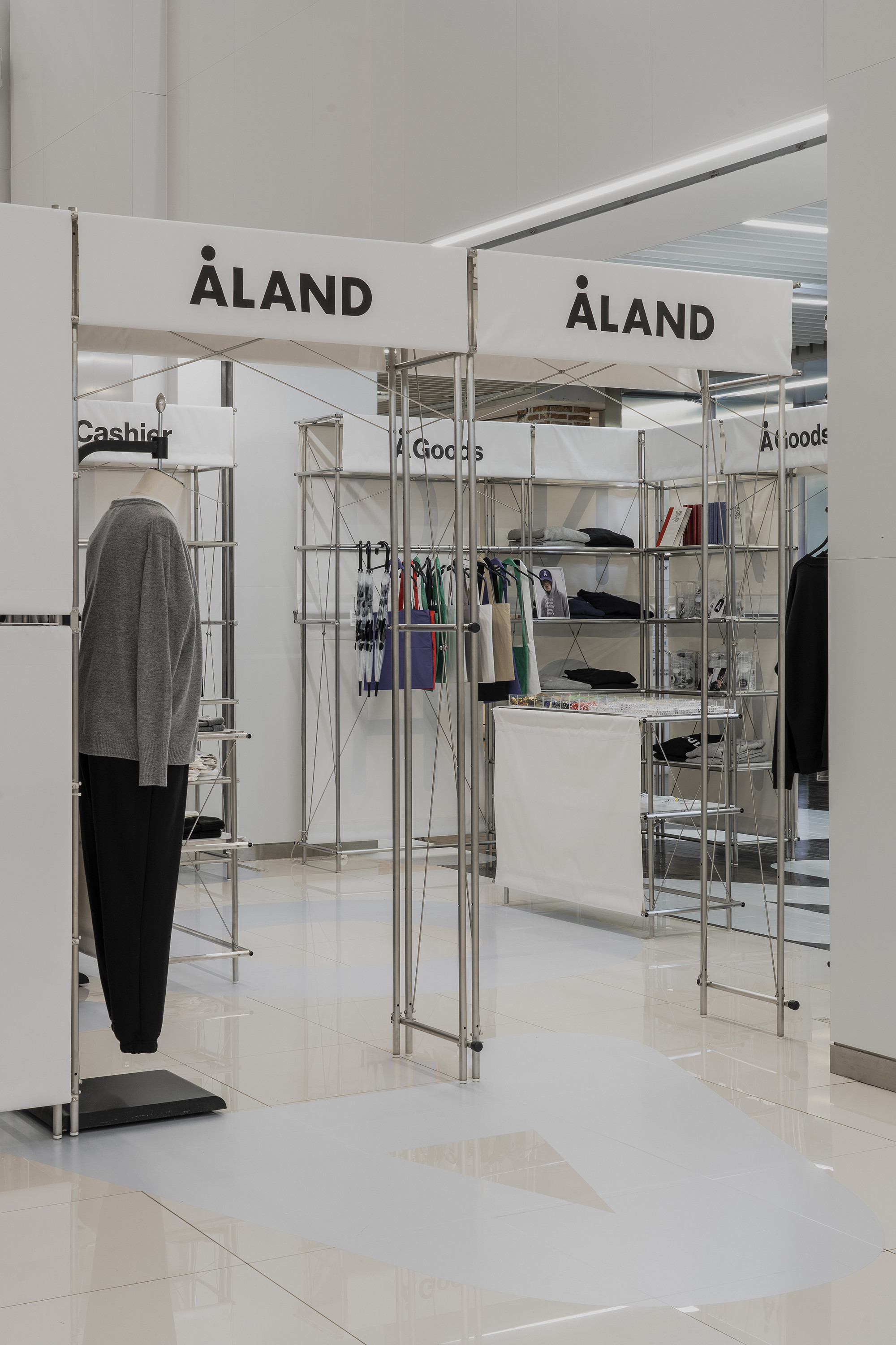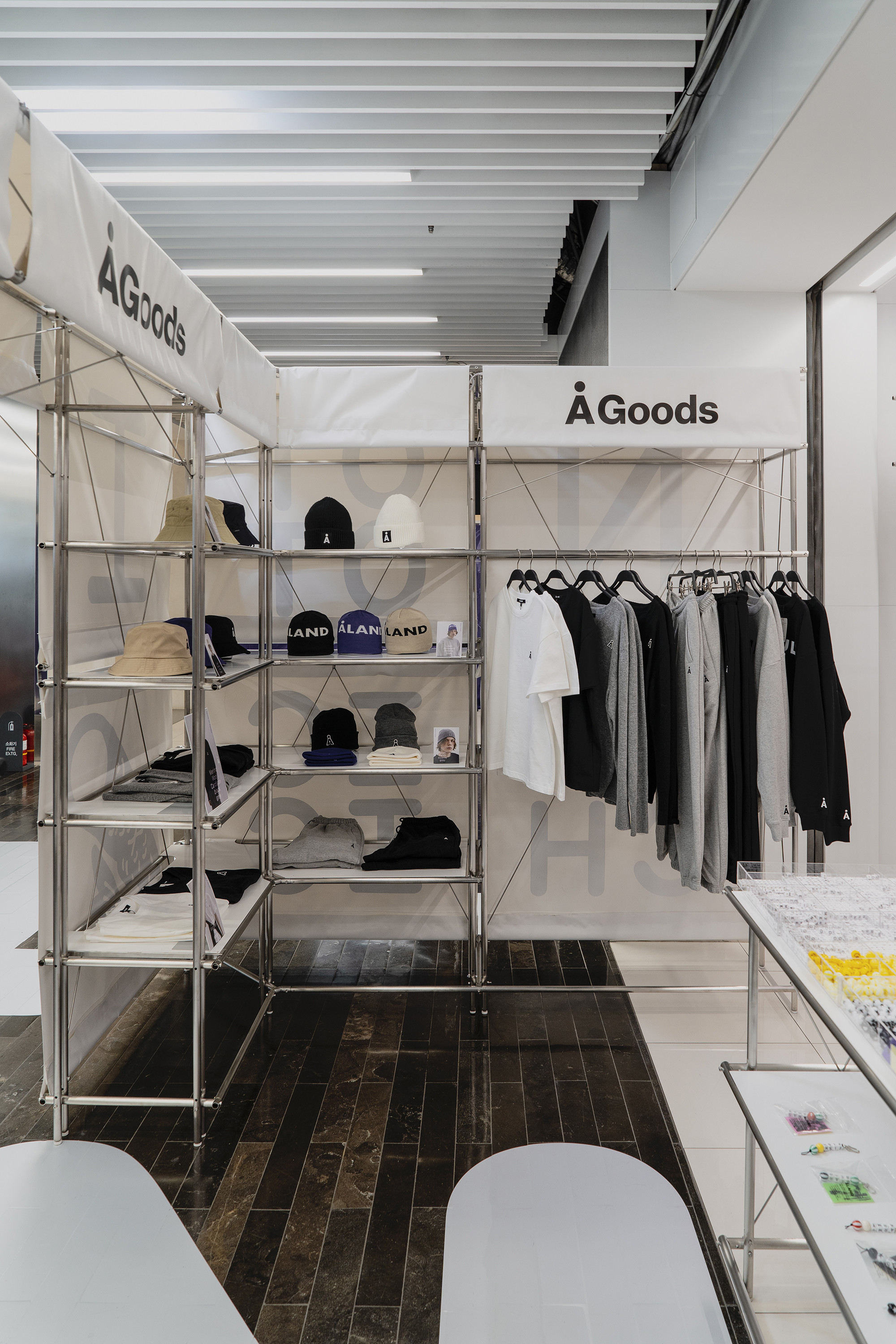 We designed a reusable pop-up store using shelves and hangers with minimal processing. To partition the space, tarpaulin fabric was utilized instead of plywood or gypsum board, enabling it to be reinstalled without disposal or additional materials. The identity of the 'pop-up store' was conveyed through the materiality and exposed hardware.