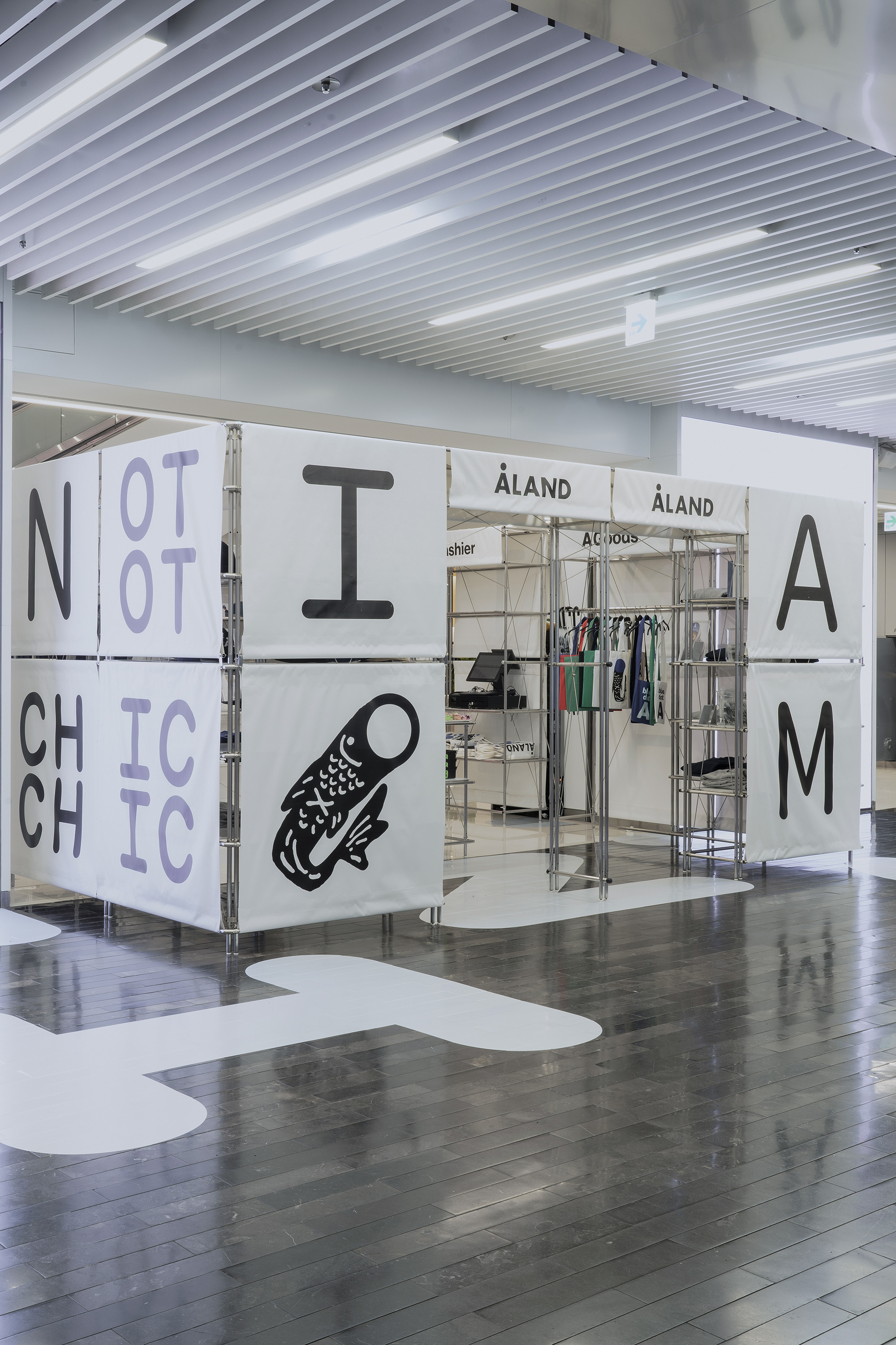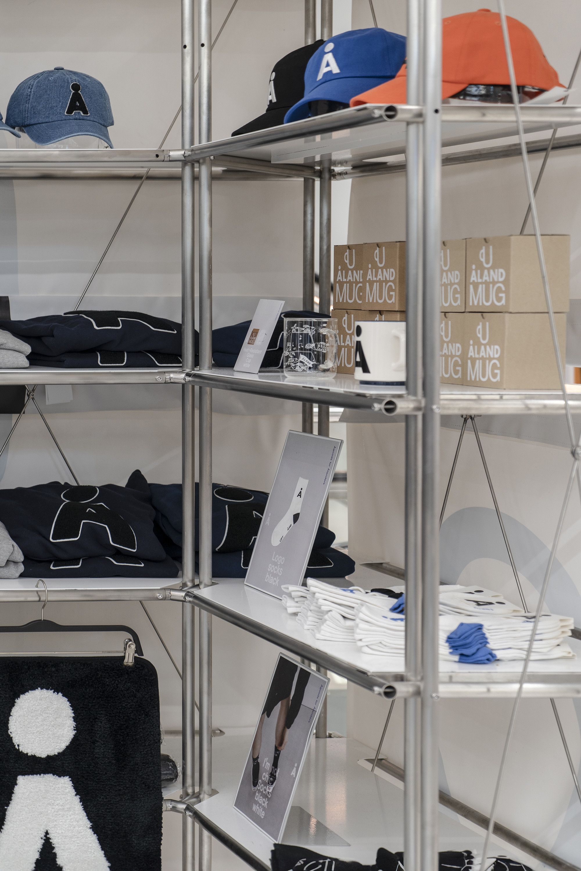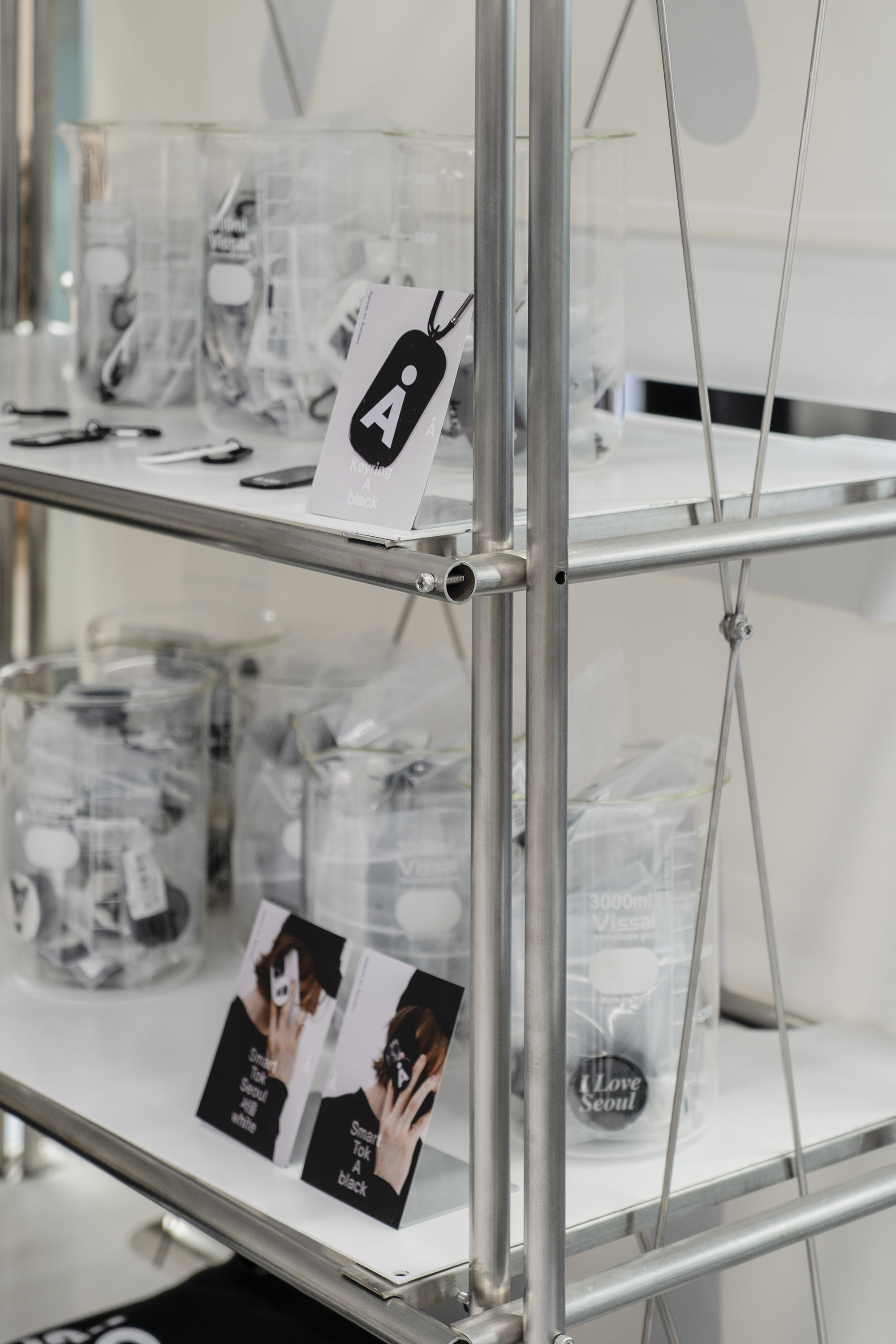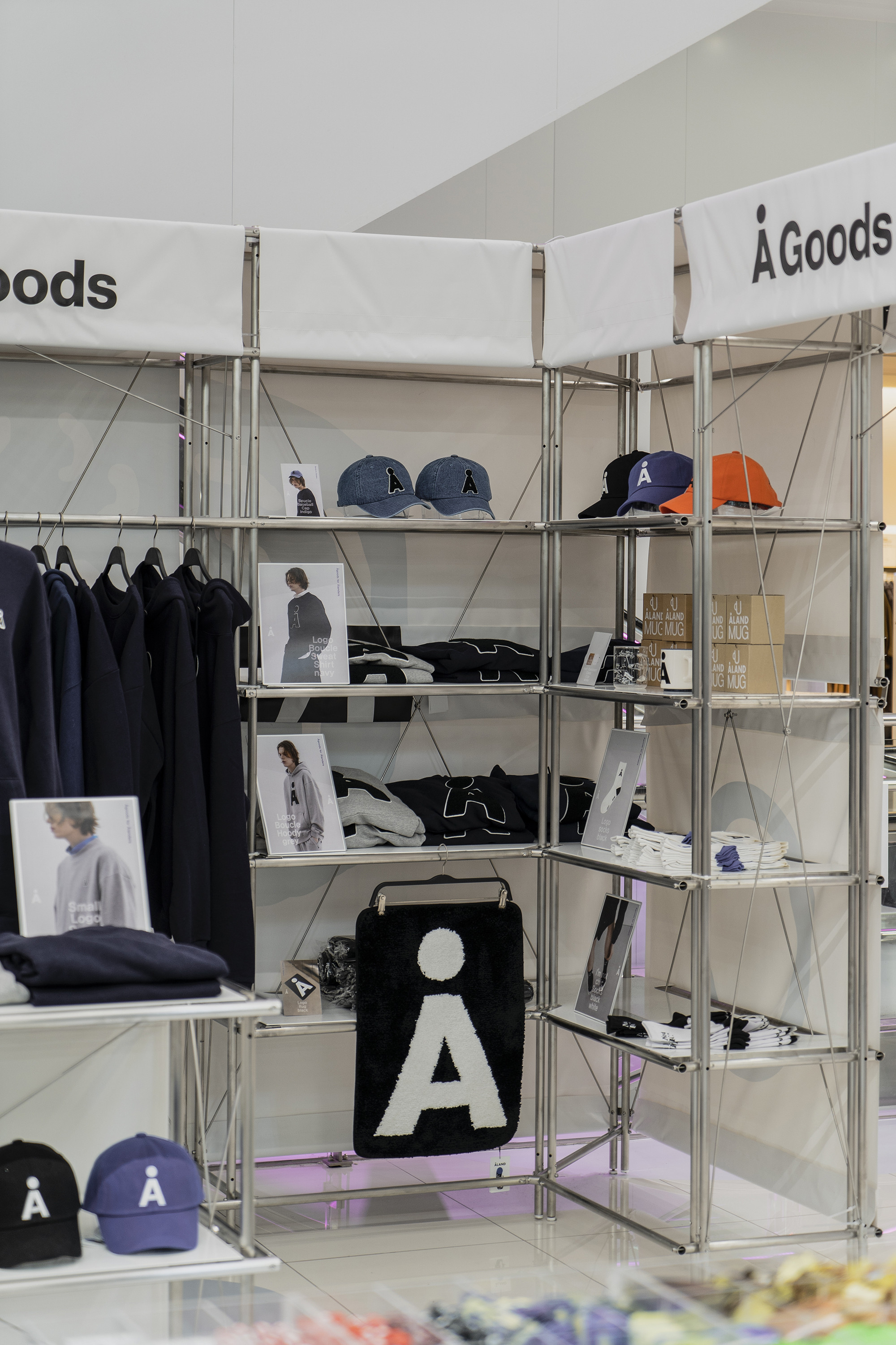 We designed a reusable pop-up store using shelves and hangers with minimal processing. To partition the space, tarpaulin fabric was utilized instead of plywood or gypsum board, enabling it to be reinstalled without disposal or additional materials. The identity of the 'pop-up store' was conveyed through the materiality and exposed hardware.
