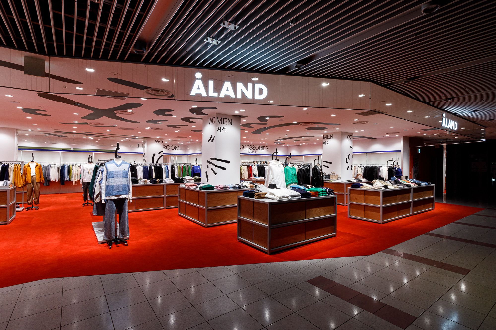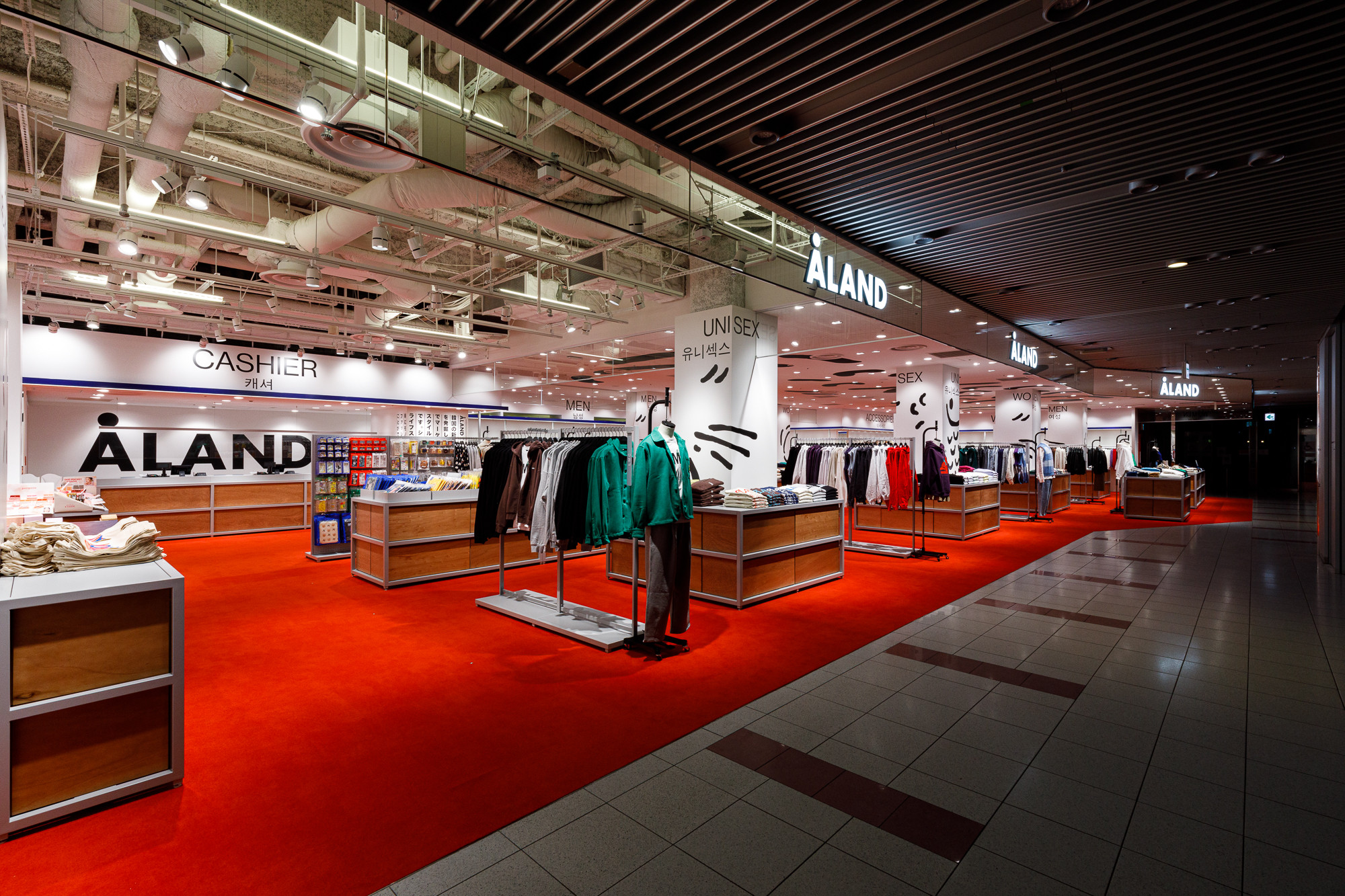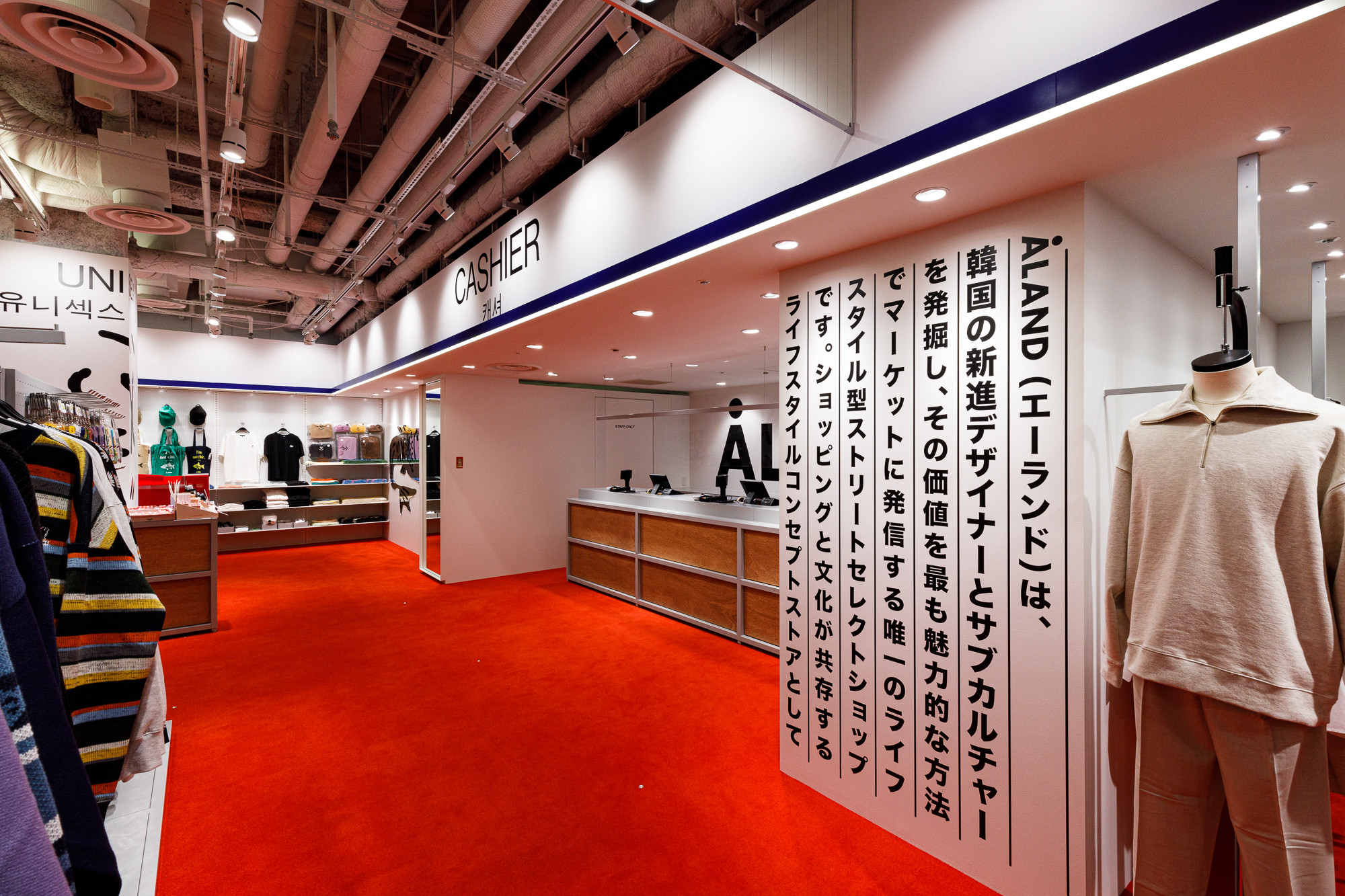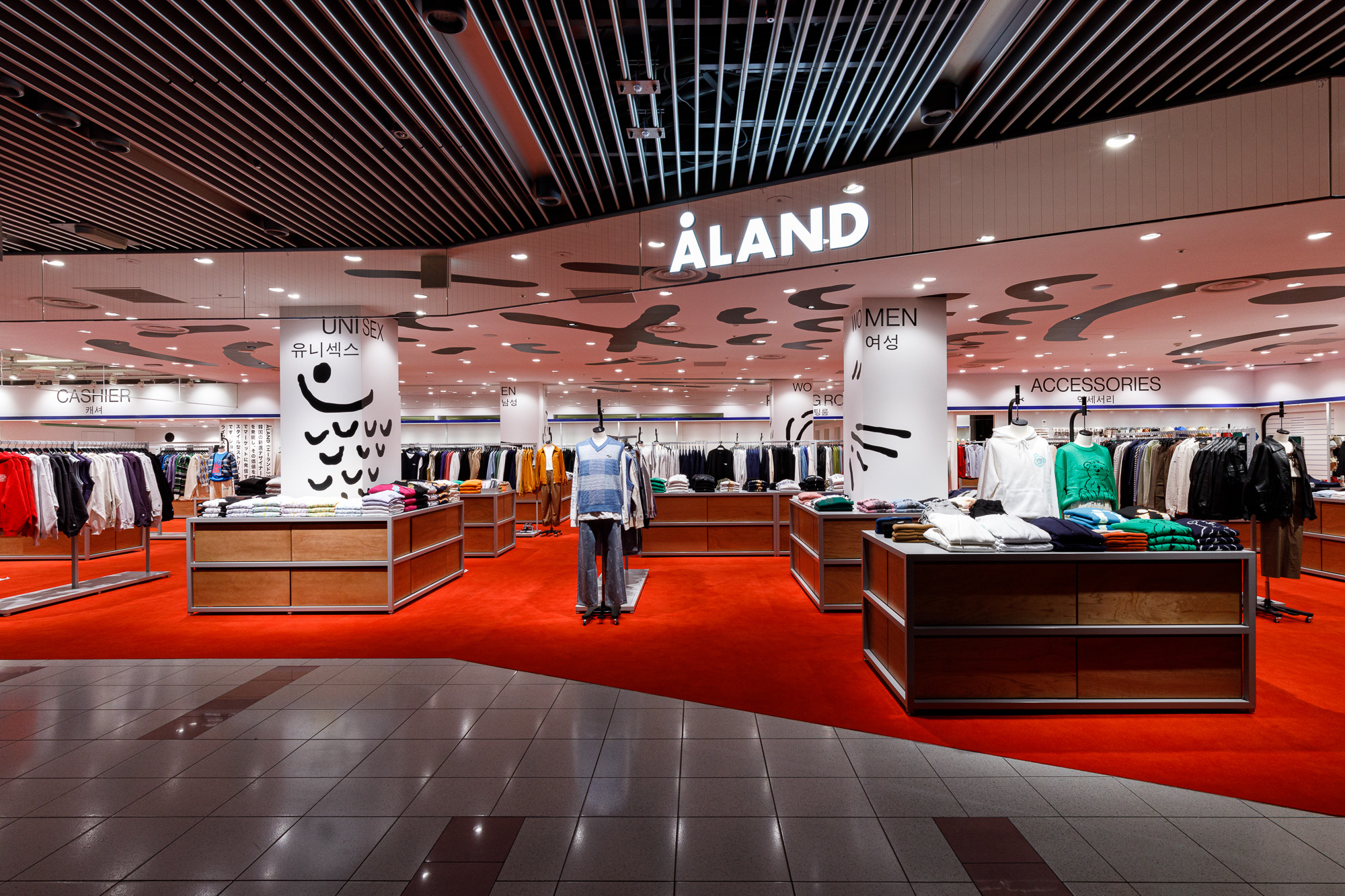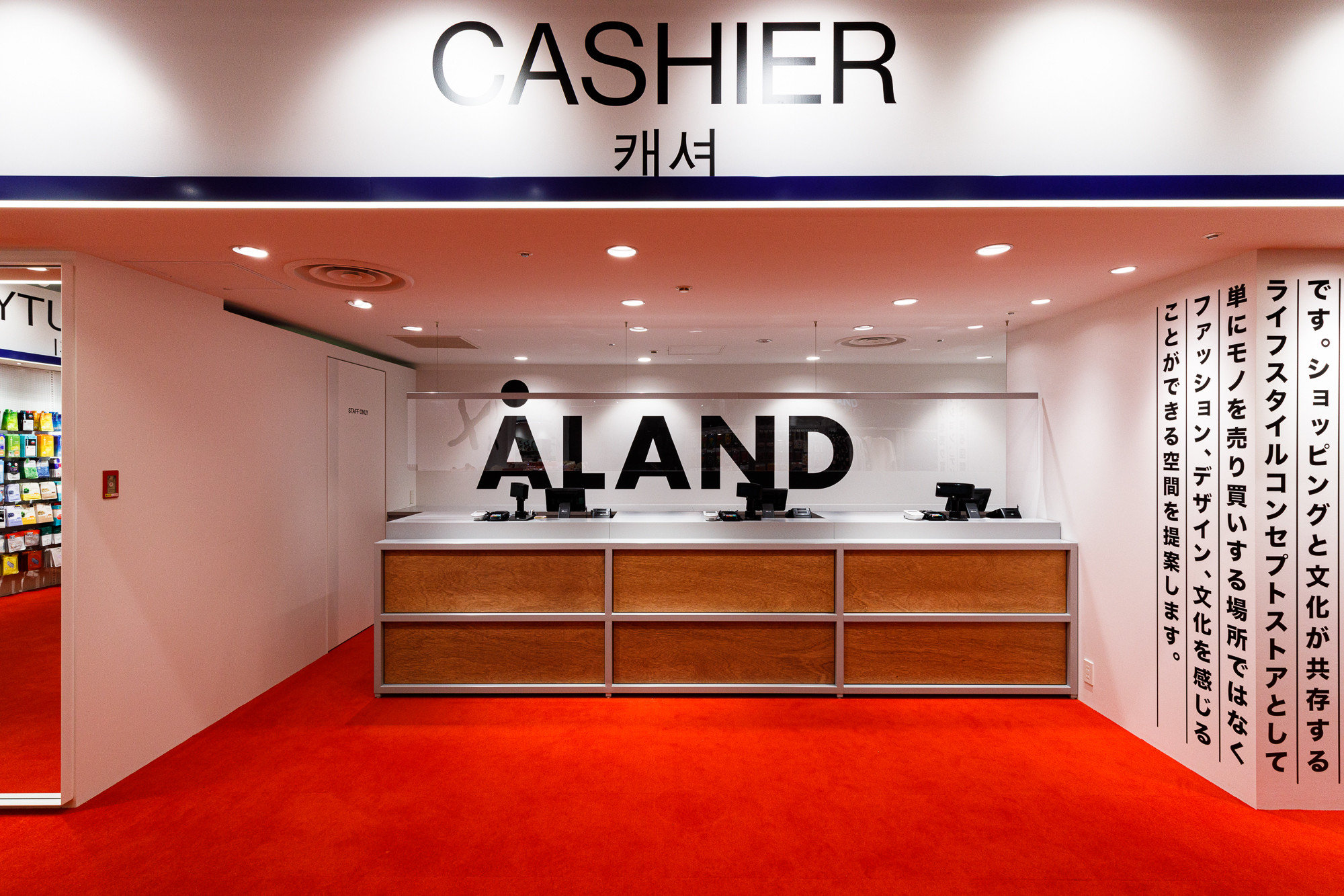 Osaka is situated in the Kansai region, a destination where Koreans seek a more direct experience of Japanese tradition and urban life. Recognizing this, 'ÅLAND' received a request to design the Osaka store from the perspective of Koreans observing Japan. For instance, they utilized the red color from the Japanese national flag as the base for the floor carpet, and incorporated graphics reminiscent of 'Heno Heno Moheji', drawn with a brush, which bear similarities to the fish graphics associated with 'ÅLAND', expressed on the ceiling. The intentional use of Lauan plywood as a furniture material is also a notable design aspect.