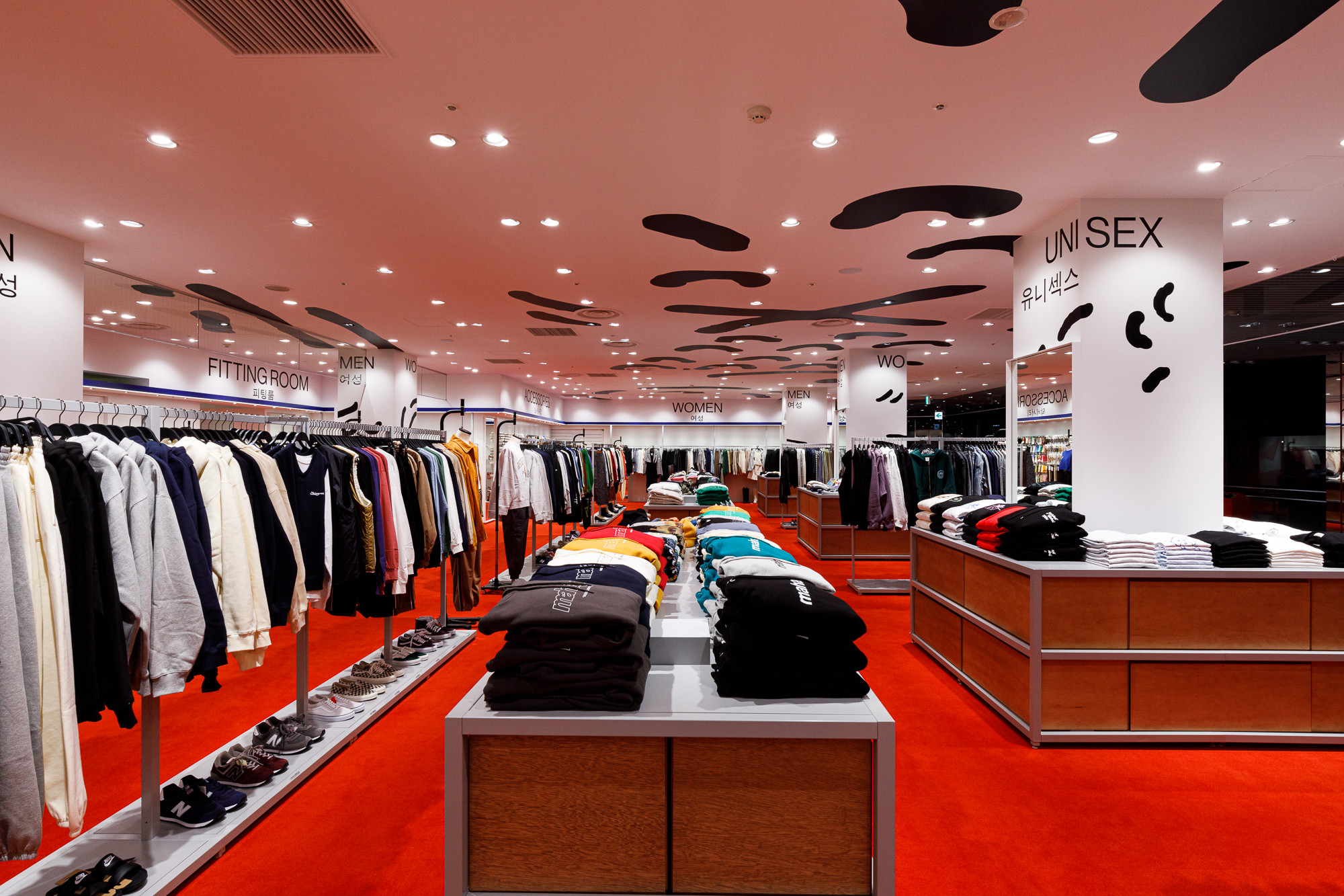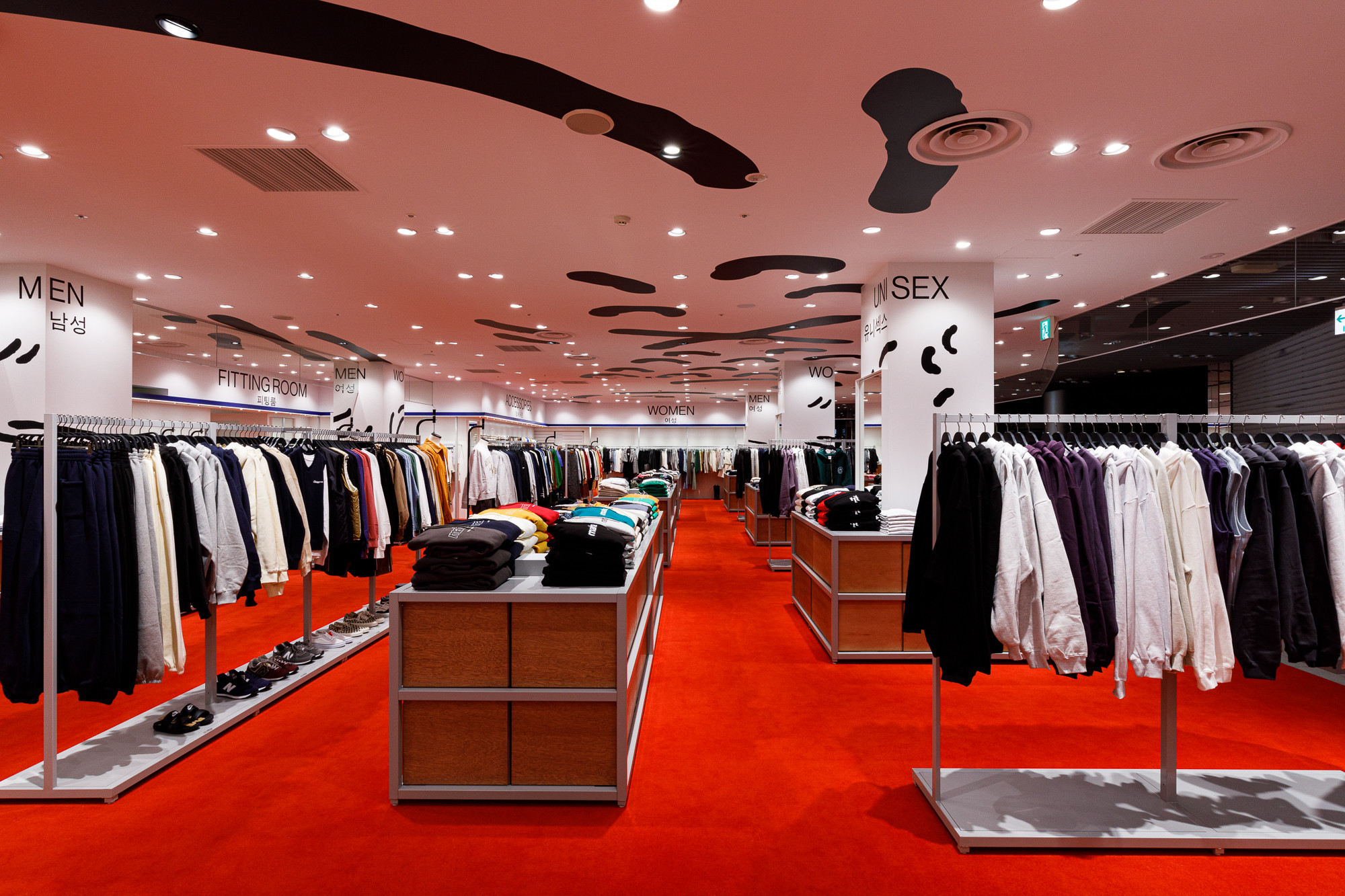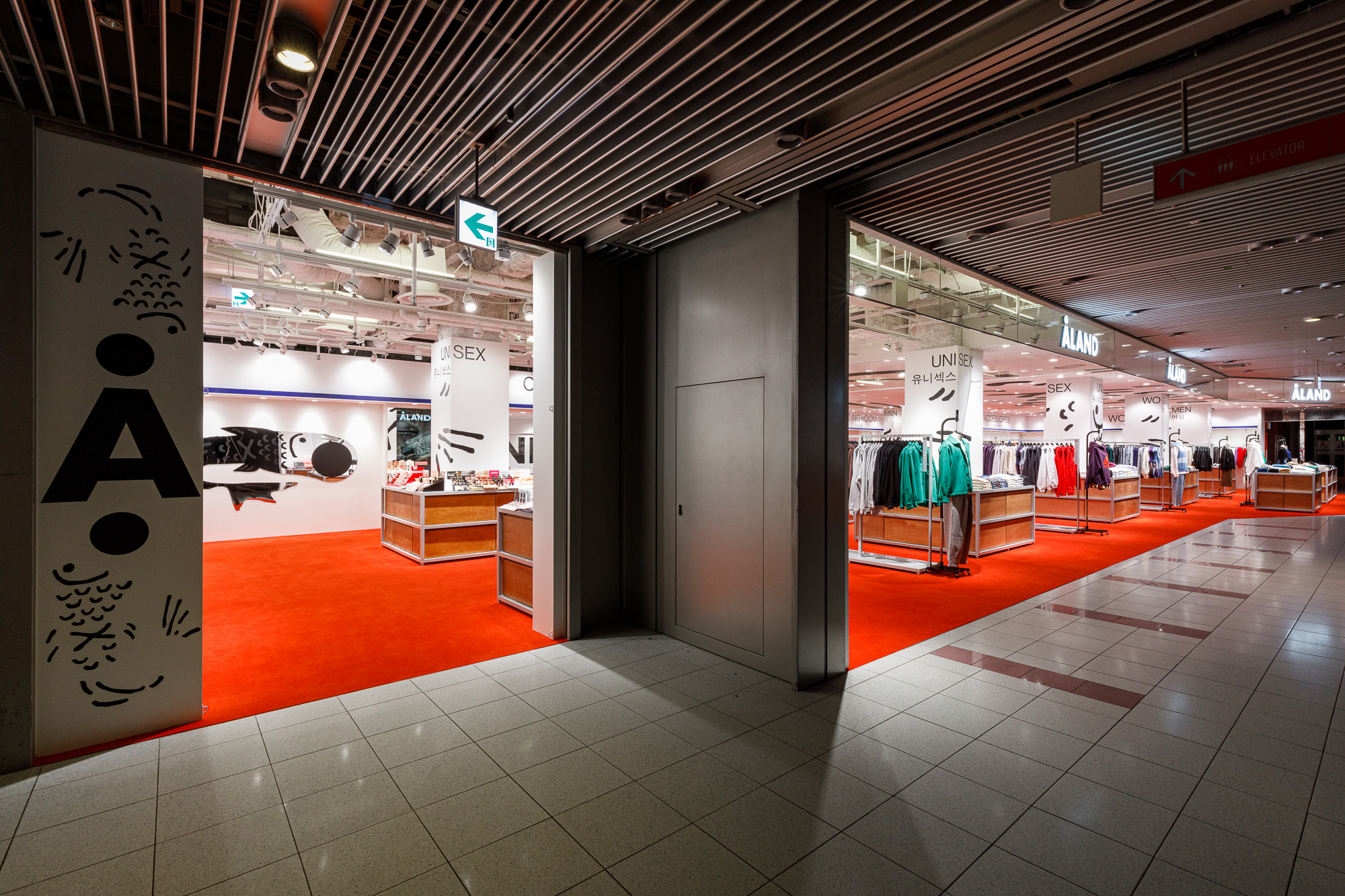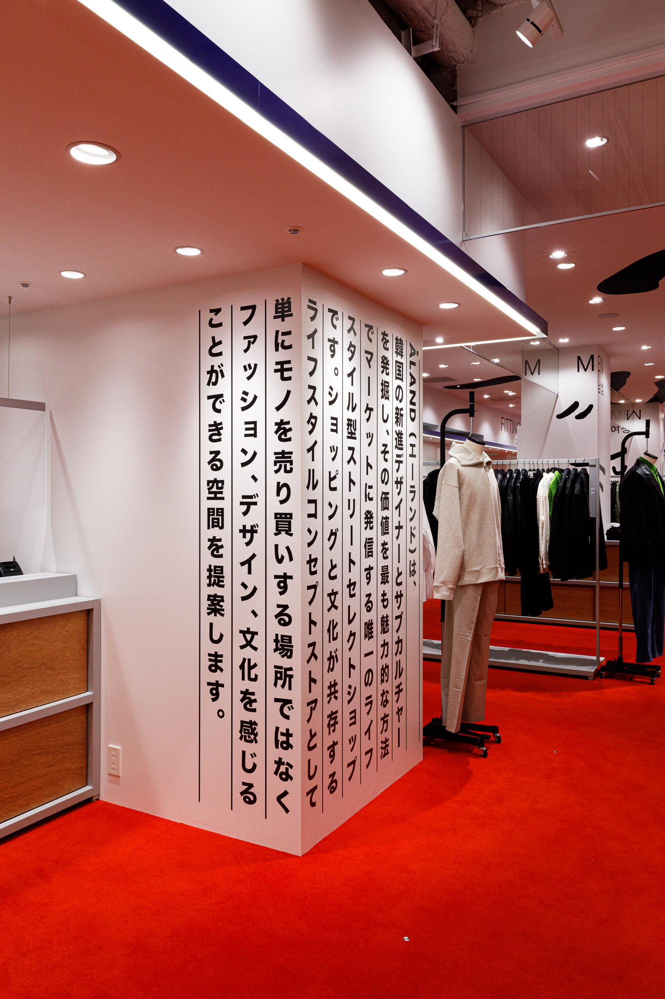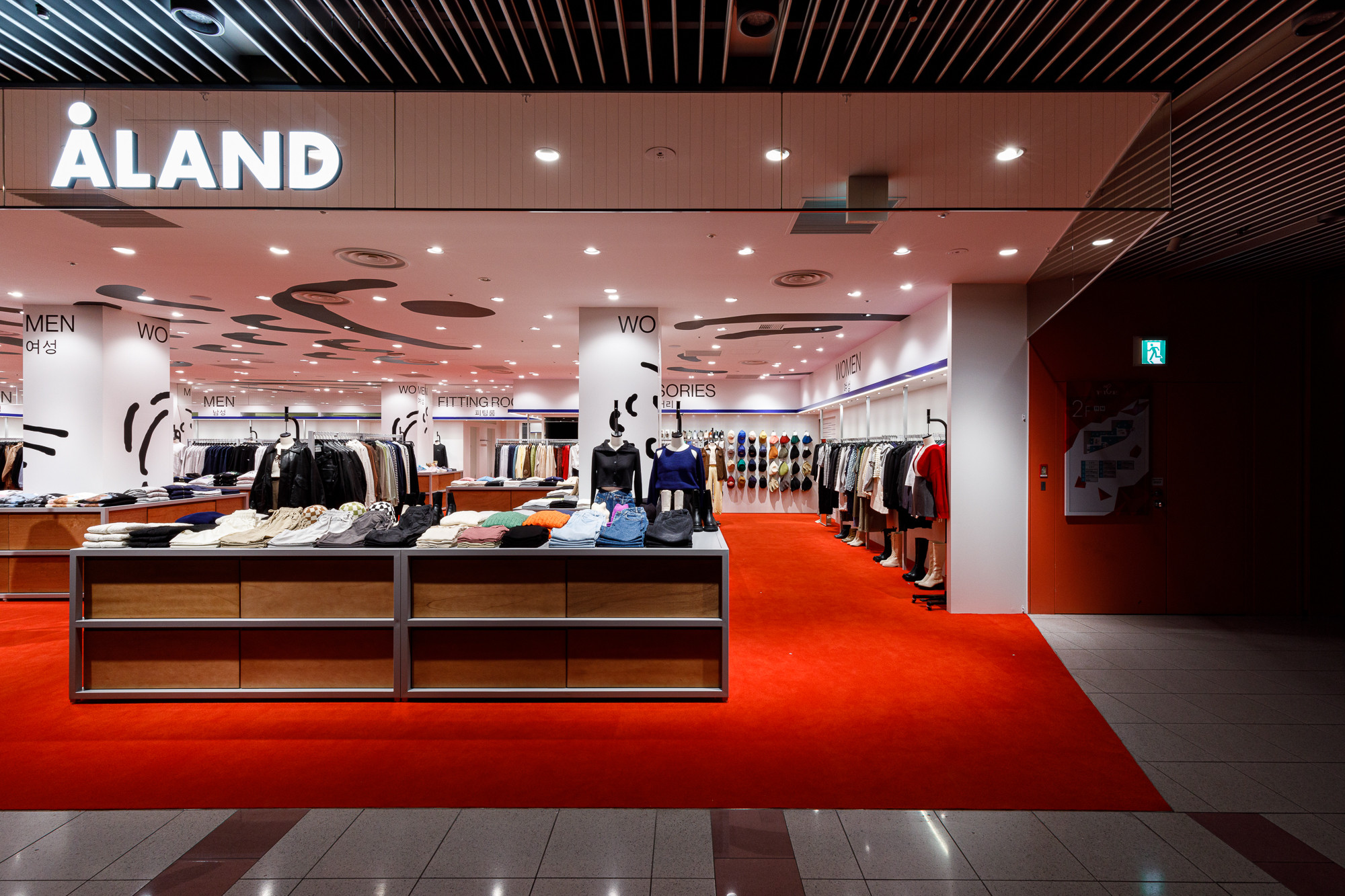 Osaka is situated in the Kansai region, a destination where Koreans seek a more direct experience of Japanese tradition and urban life. Recognizing this, 'ÅLAND' received a request to design the Osaka store from the perspective of Koreans observing Japan. For instance, they utilized the red color from the Japanese national flag as the base for the floor carpet, and incorporated graphics reminiscent of 'Heno Heno Moheji', drawn with a brush, which bear similarities to the fish graphics associated with 'ÅLAND', expressed on the ceiling. The intentional use of Lauan plywood as a furniture material is also a notable design aspect.