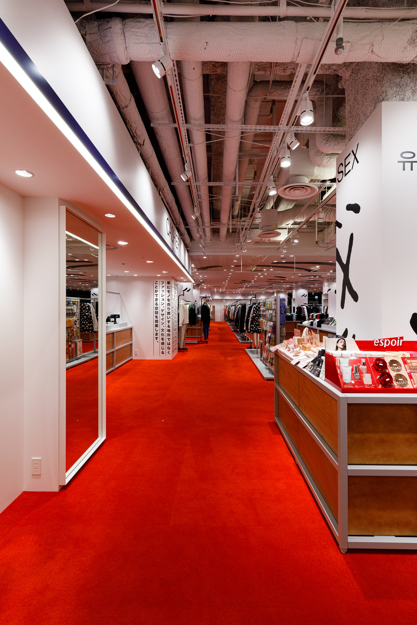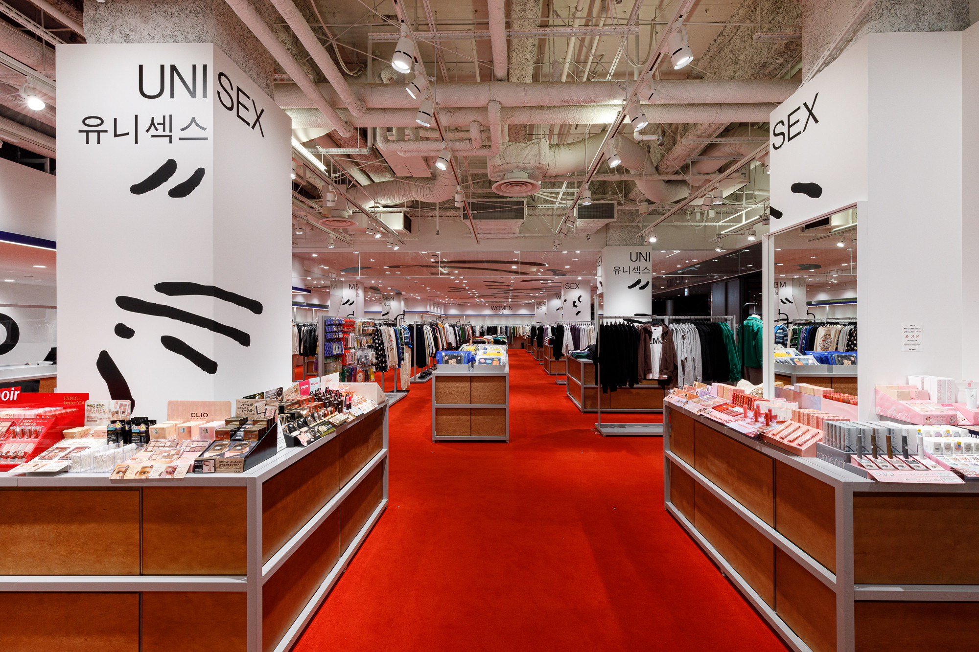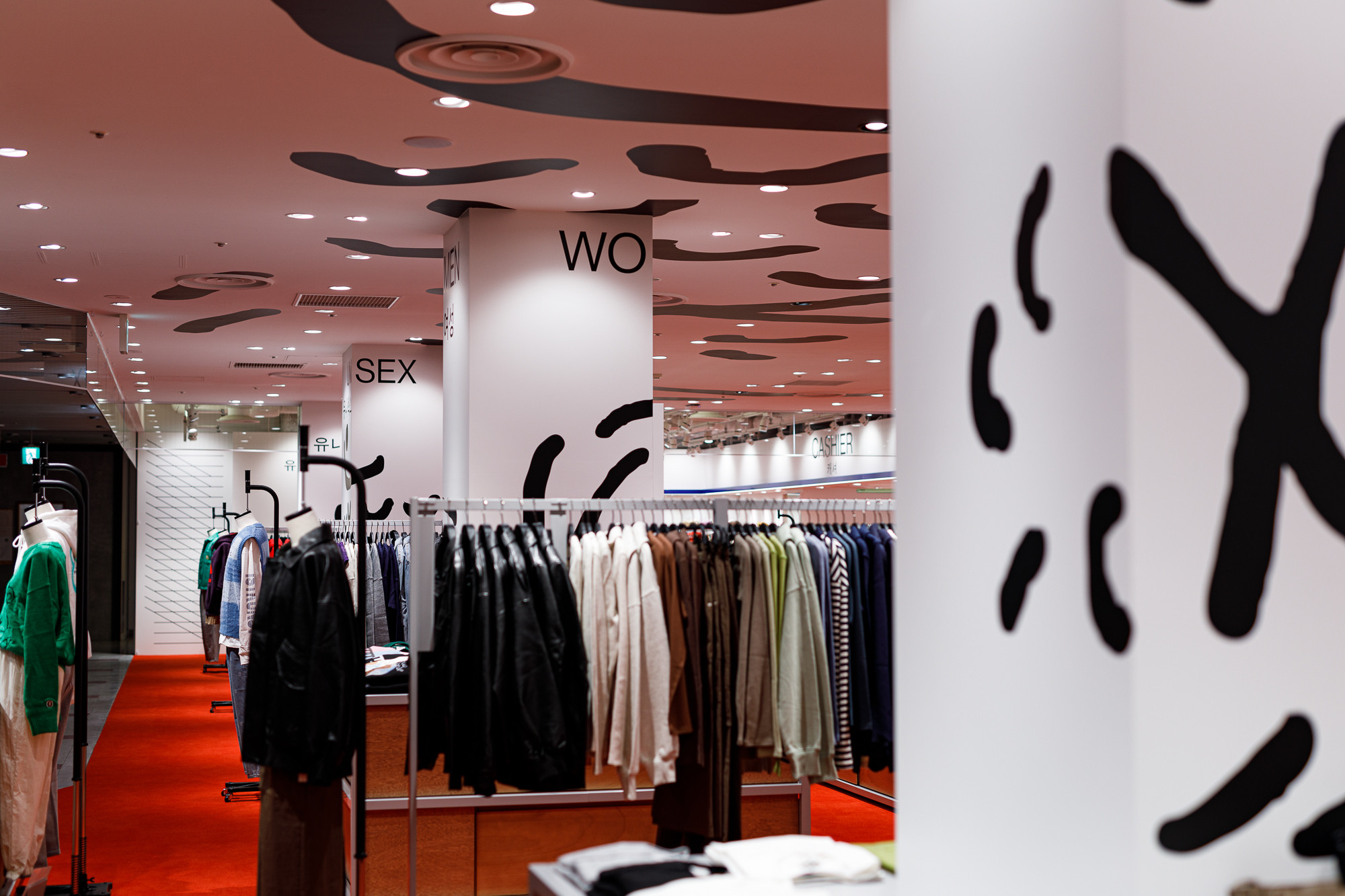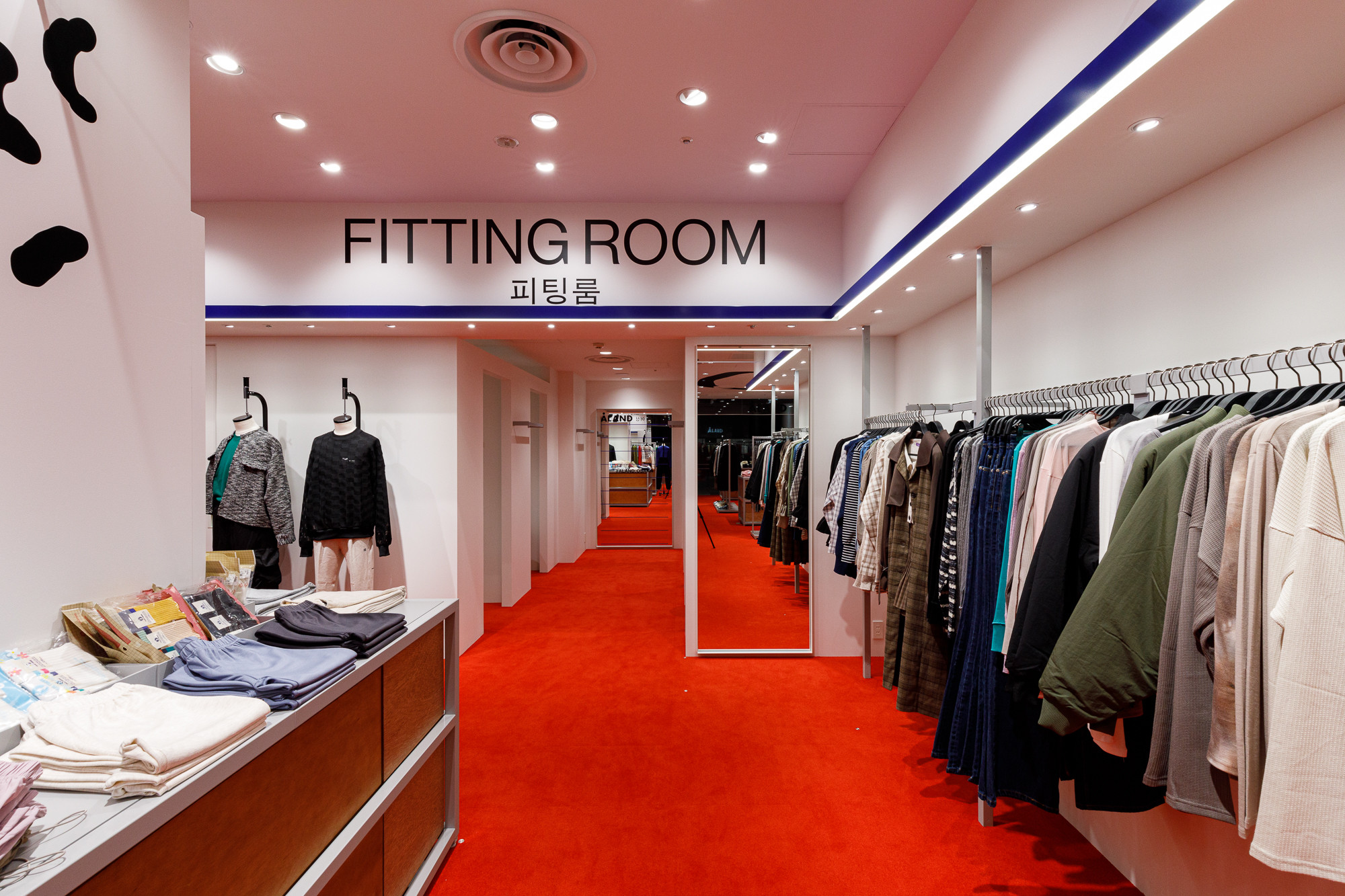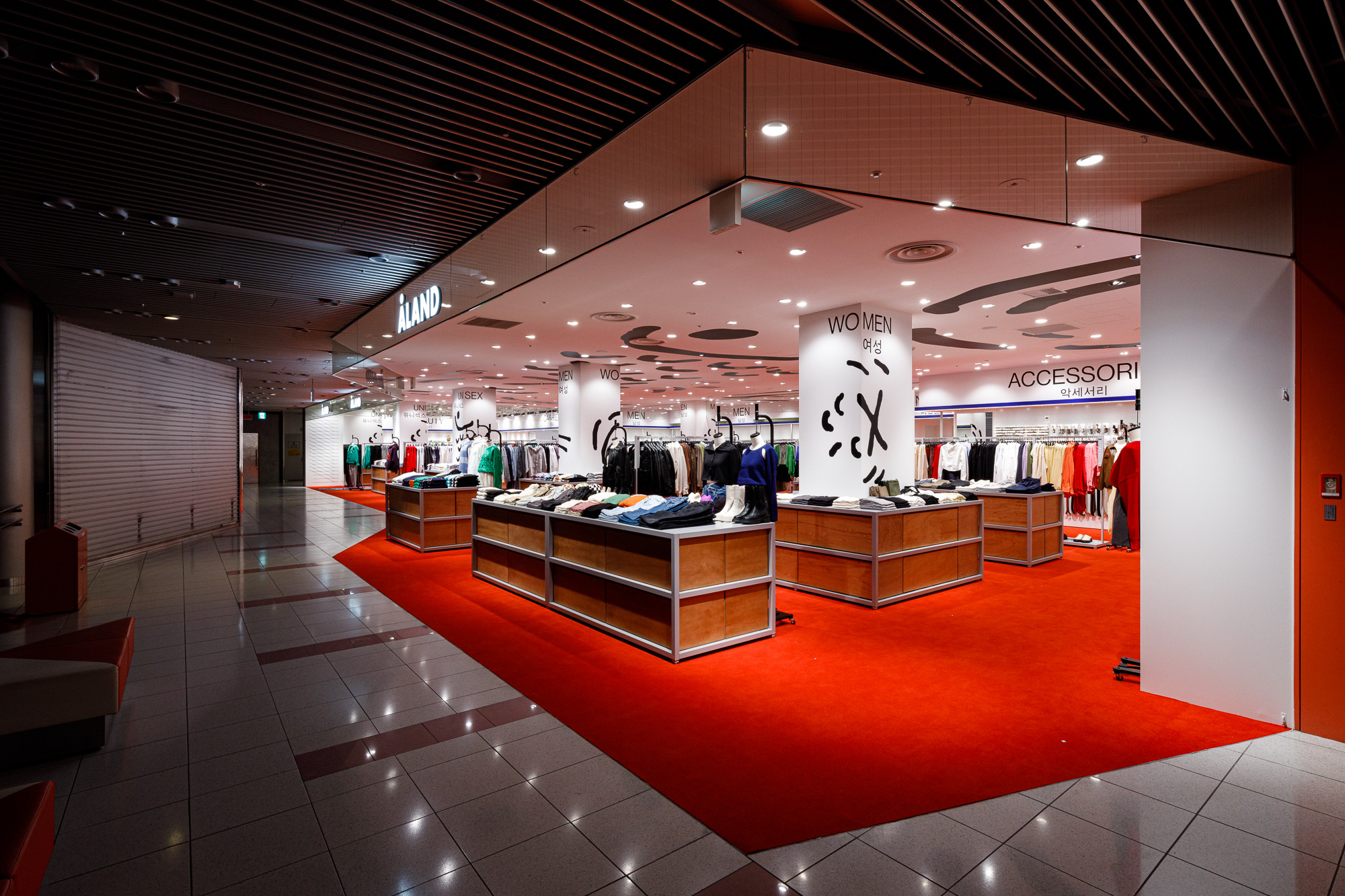 Osaka is situated in the Kansai region, a destination where Koreans seek a more direct experience of Japanese tradition and urban life. Recognizing this, 'ÅLAND' received a request to design the Osaka store from the perspective of Koreans observing Japan. For instance, they utilized the red color from the Japanese national flag as the base for the floor carpet, and incorporated graphics reminiscent of 'Heno Heno Moheji', drawn with a brush, which bear similarities to the fish graphics associated with 'ÅLAND', expressed on the ceiling. The intentional use of Lauan plywood as a furniture material is also a notable design aspect.