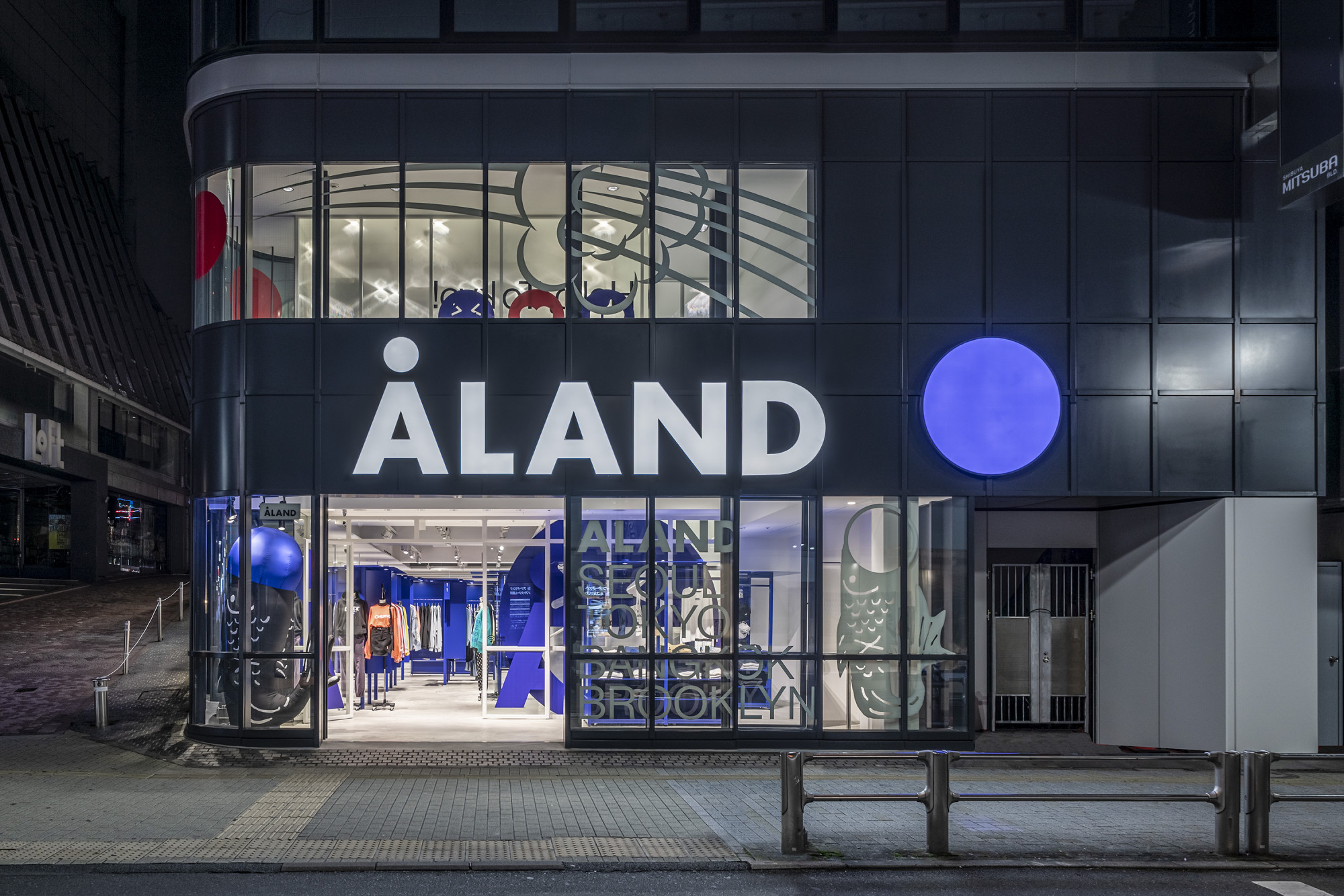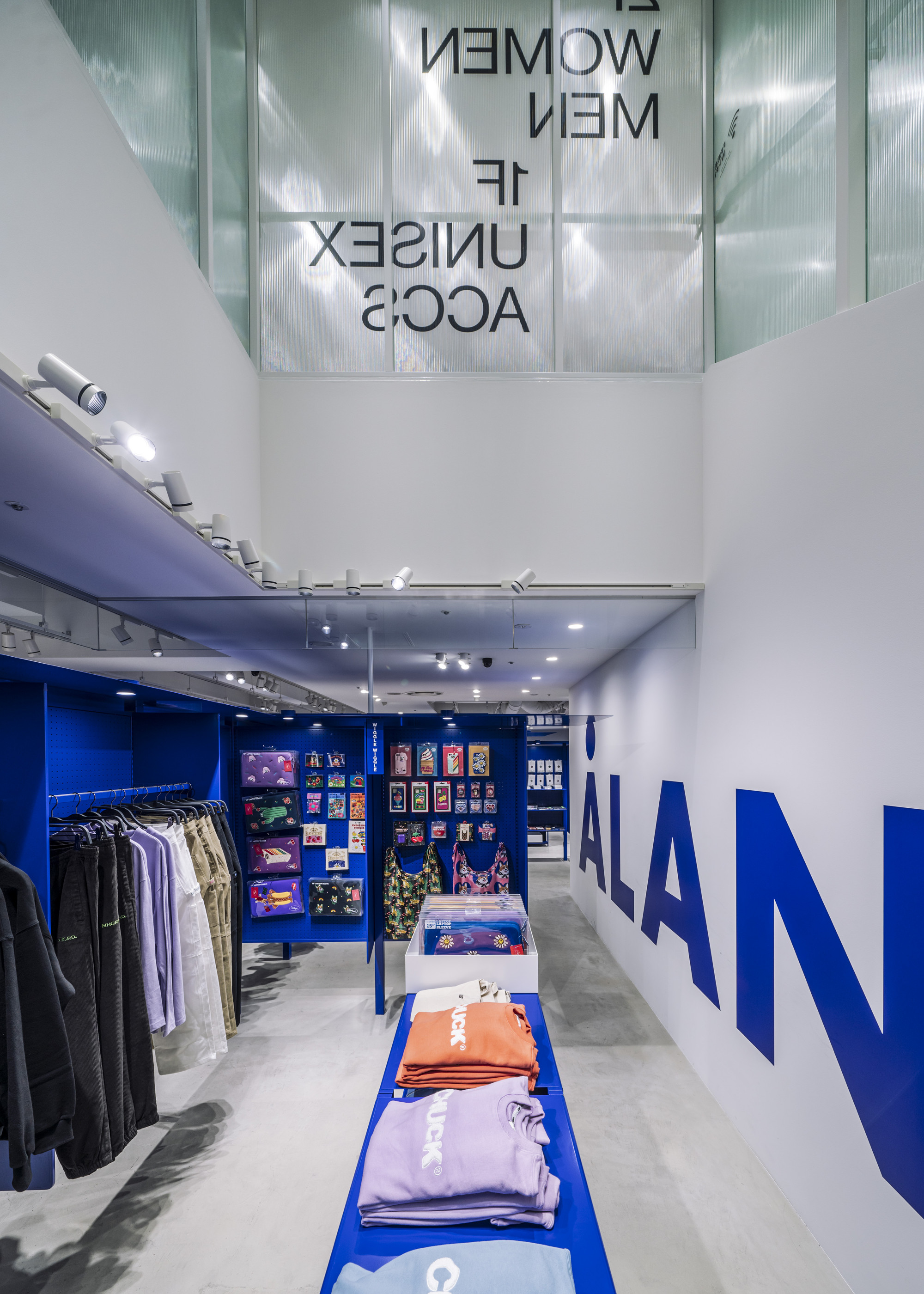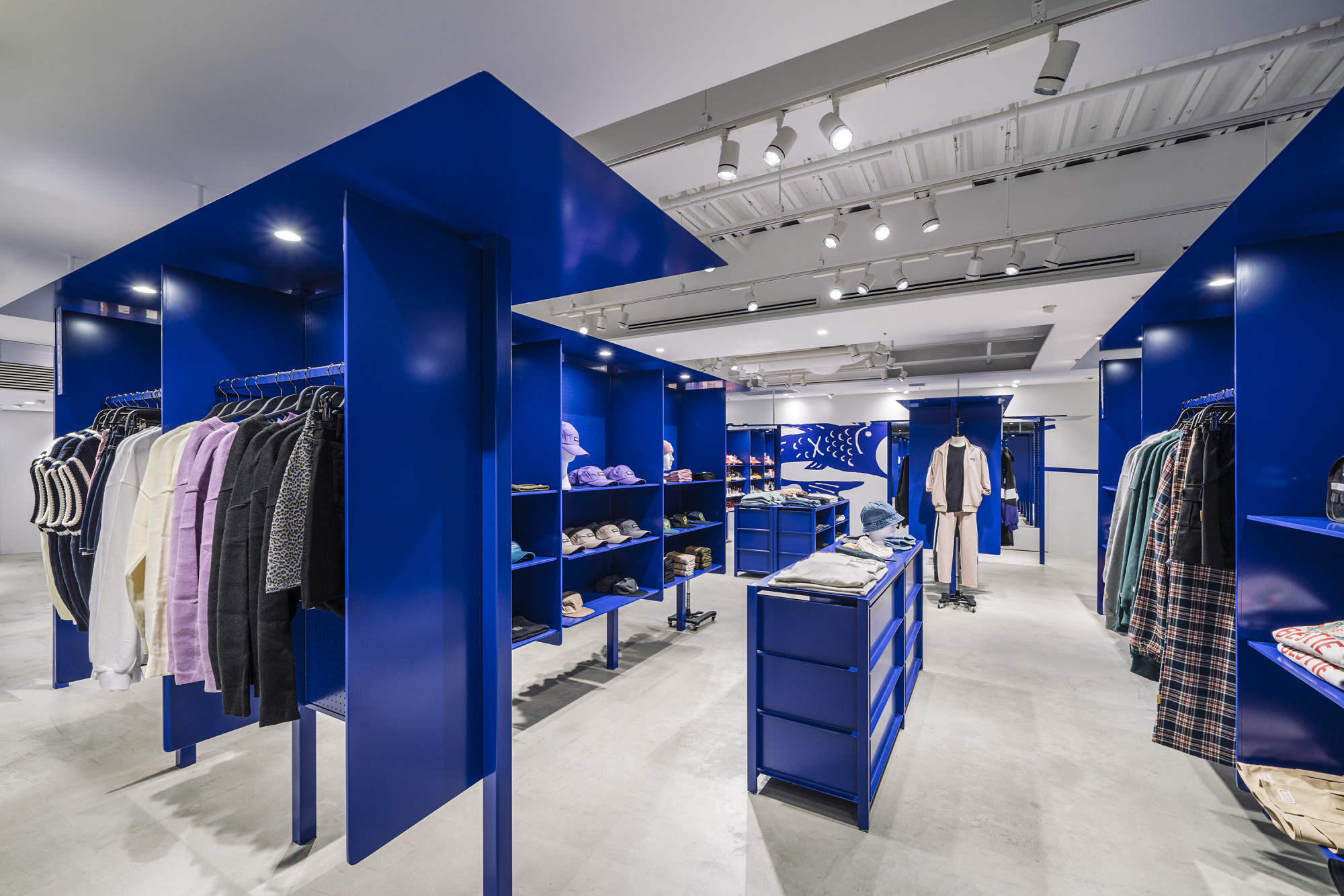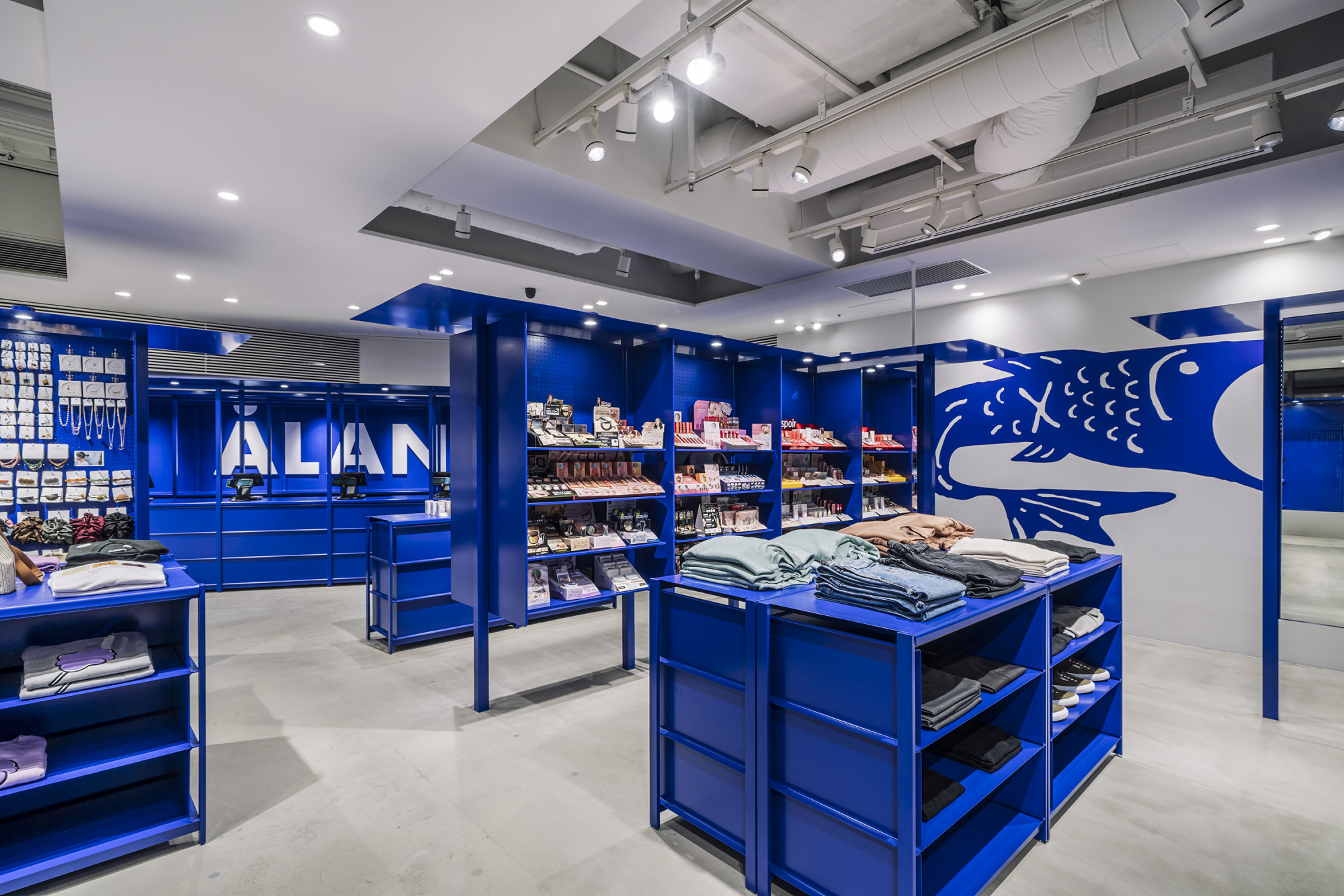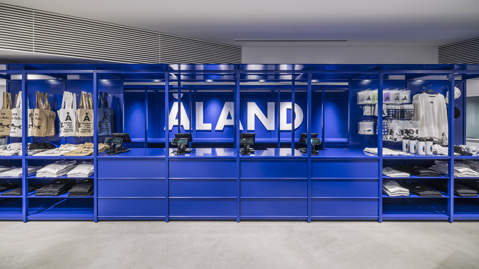 We designed the first branch of ÅLAND, a designer concept shop representing Korea, in Tokyo Shibuya. ÅLAND requested a unique design that sets it apart from typical stores, as it was opening its store one block behind the Shibuya scramble intersection. They specifically emphasized the need for a giant hanger for clothes, an enjoyable browsing experience, and an overwhelming atmosphere within the space. According to surveys conducted for the Japanese market, Japanese individuals enjoying trips to Korea appreciate the distinct atmosphere of Seoul's streets compared to those of Japan. They particularly admire the winding streets and the protruding eaves of Korean houses and villas converted into numerous Road Shops, which are street-side stores. This insight naturally led us to envision the protruding eaves of roofs and the outer walls of buildings. We combined these elements to create the space, curating narrow or wide pathways resembling alleyways as requested by ÅLAND. We designed the space using ÅLAND's key colors, vivid blue and bright shades of gray and white. All structures were designed to share specific sizes, enabling modular assembly and disassembly. This flexibility allows for rearranging the layout by assembling or disassembling furniture as needed to alter the flow of the space.