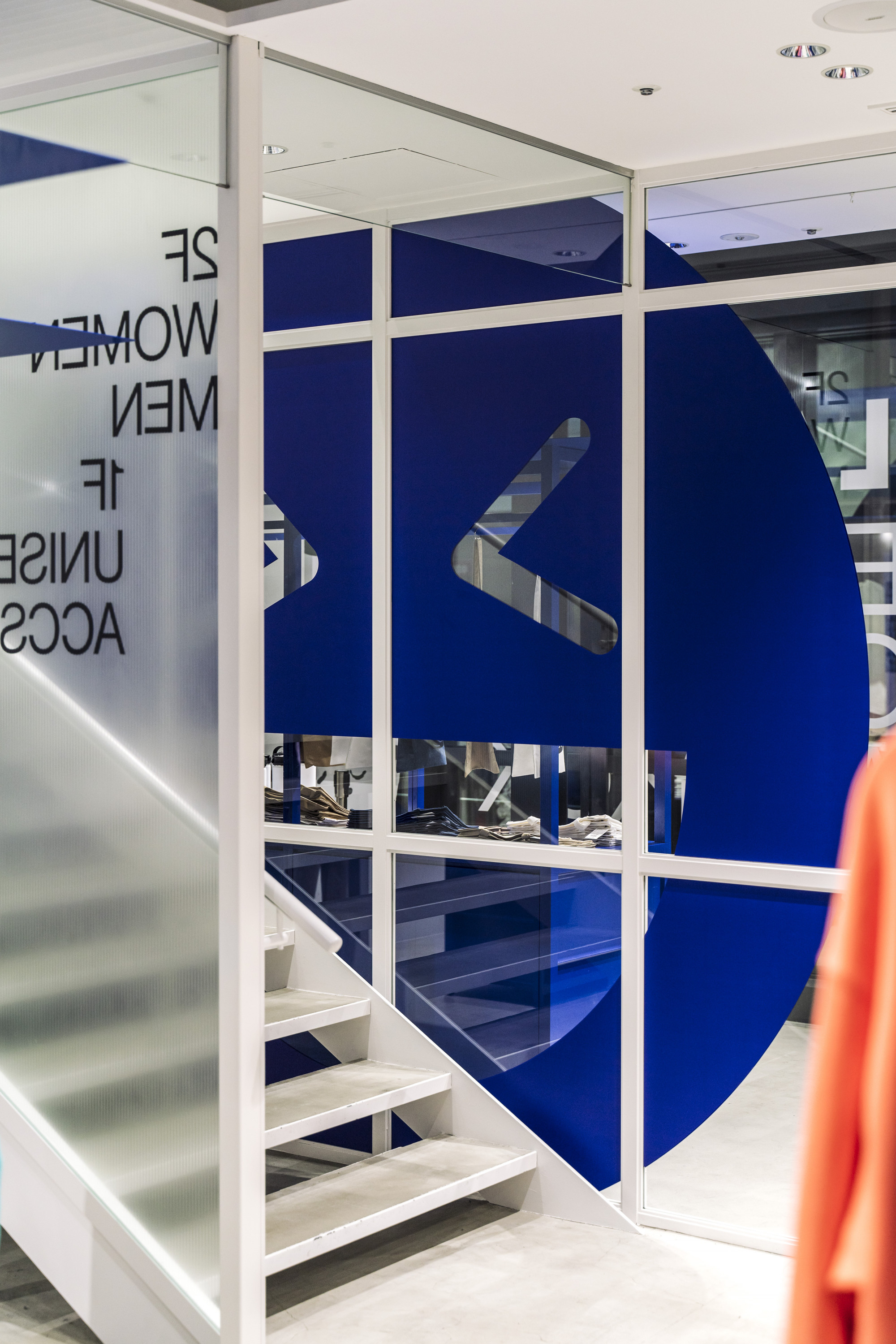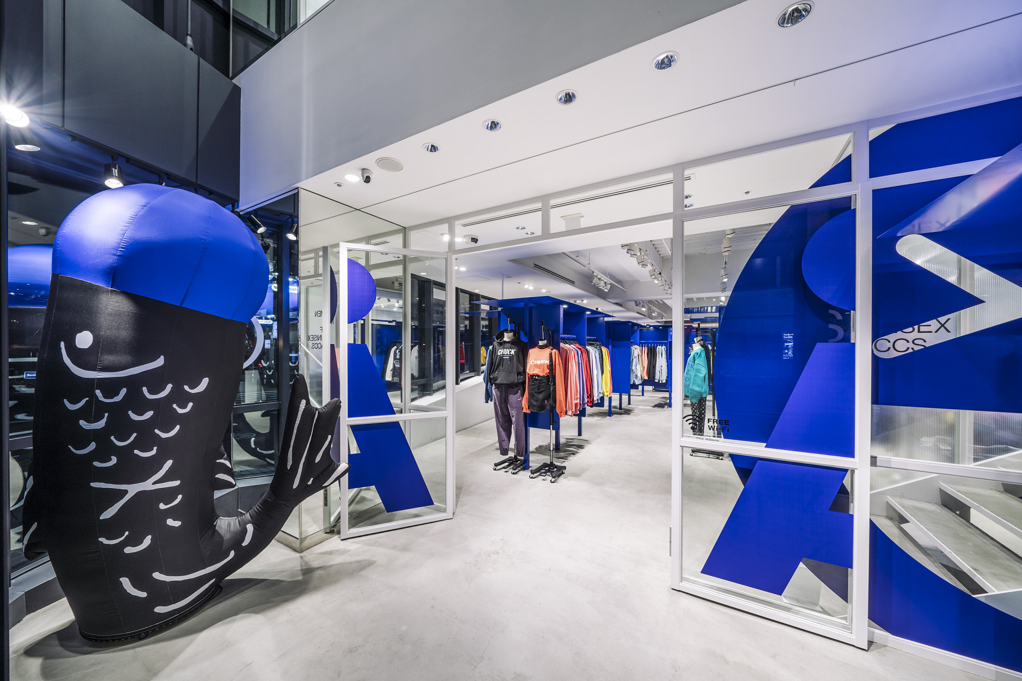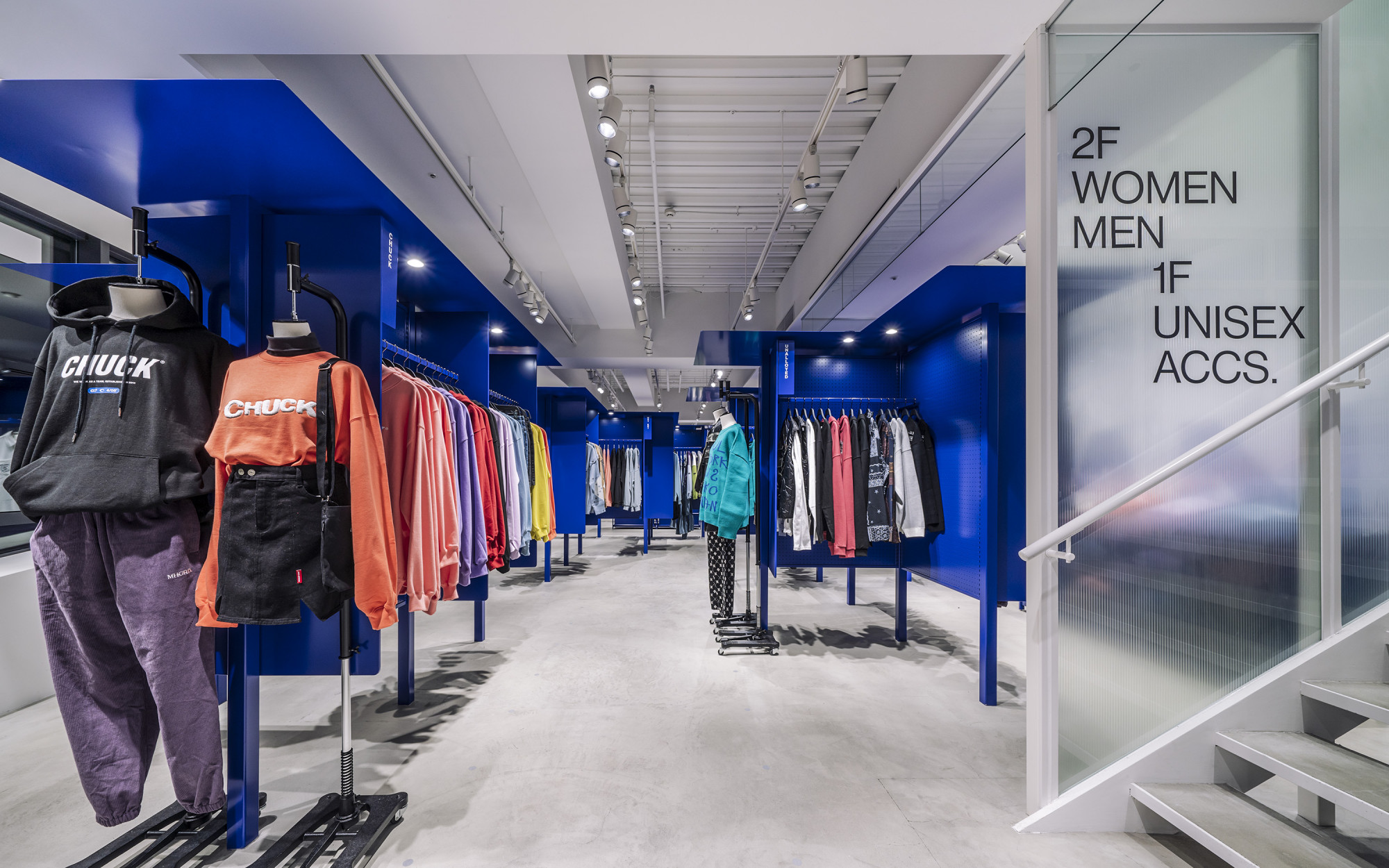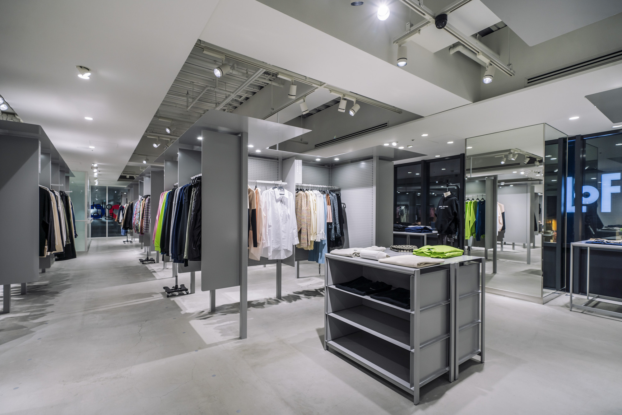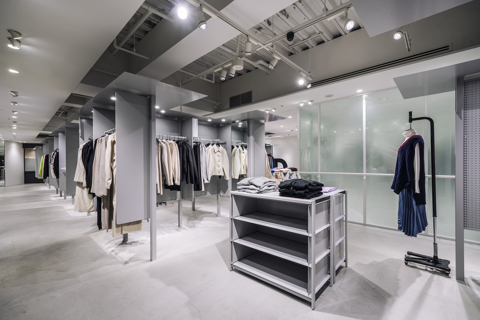 We designed the first branch of ÅLAND, a designer concept shop representing Korea, in Tokyo Shibuya. ÅLAND requested a unique design that sets it apart from typical stores, as it was opening its store one block behind the Shibuya scramble intersection. They specifically emphasized the need for a giant hanger for clothes, an enjoyable browsing experience, and an overwhelming atmosphere within the space. According to surveys conducted for the Japanese market, Japanese individuals enjoying trips to Korea appreciate the distinct atmosphere of Seoul's streets compared to those of Japan. They particularly admire the winding streets and the protruding eaves of Korean houses and villas converted into numerous Road Shops, which are street-side stores. This insight naturally led us to envision the protruding eaves of roofs and the outer walls of buildings. We combined these elements to create the space, curating narrow or wide pathways resembling alleyways as requested by ÅLAND. We designed the space using ÅLAND's key colors, vivid blue and bright shades of gray and white. All structures were designed to share specific sizes, enabling modular assembly and disassembly. This flexibility allows for rearranging the layout by assembling or disassembling furniture as needed to alter the flow of the space.
