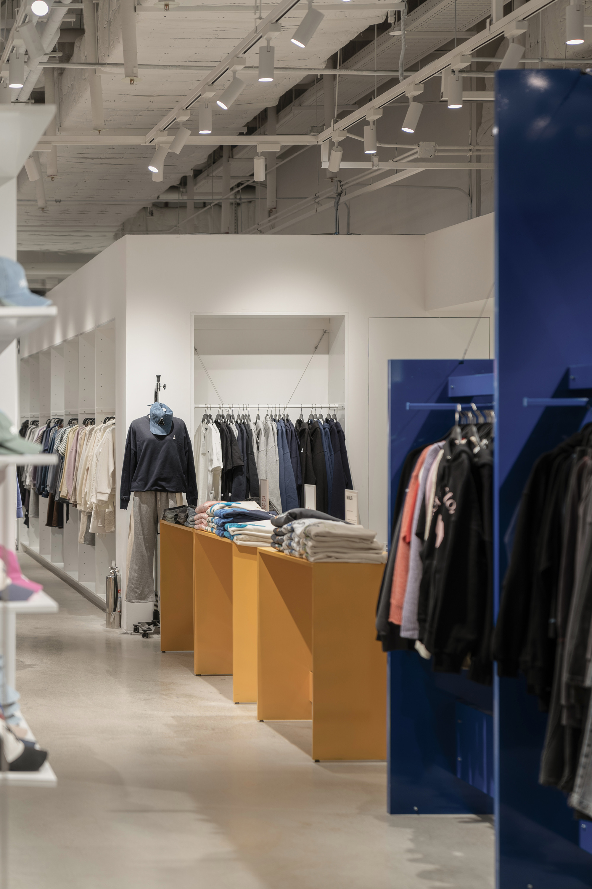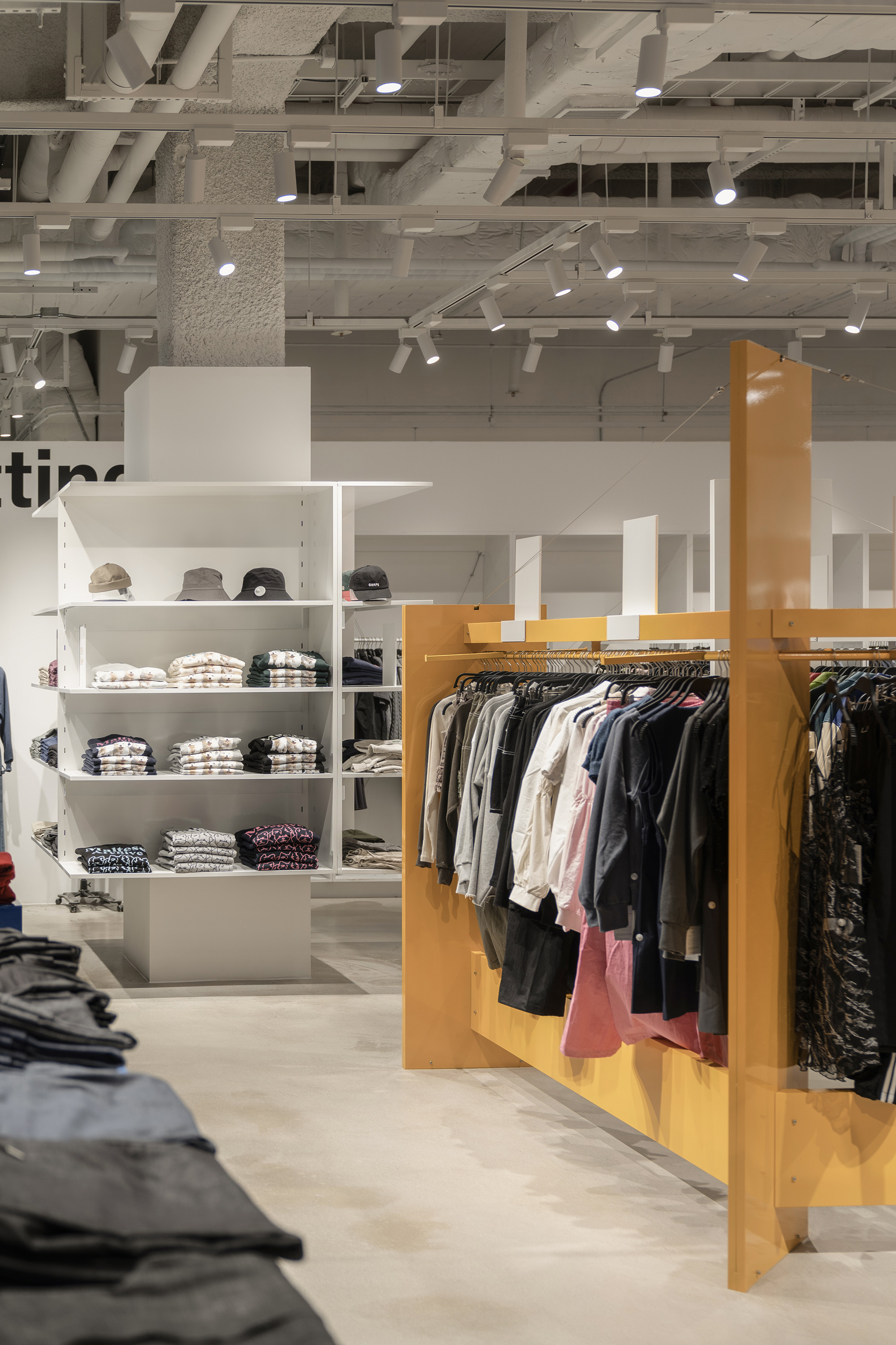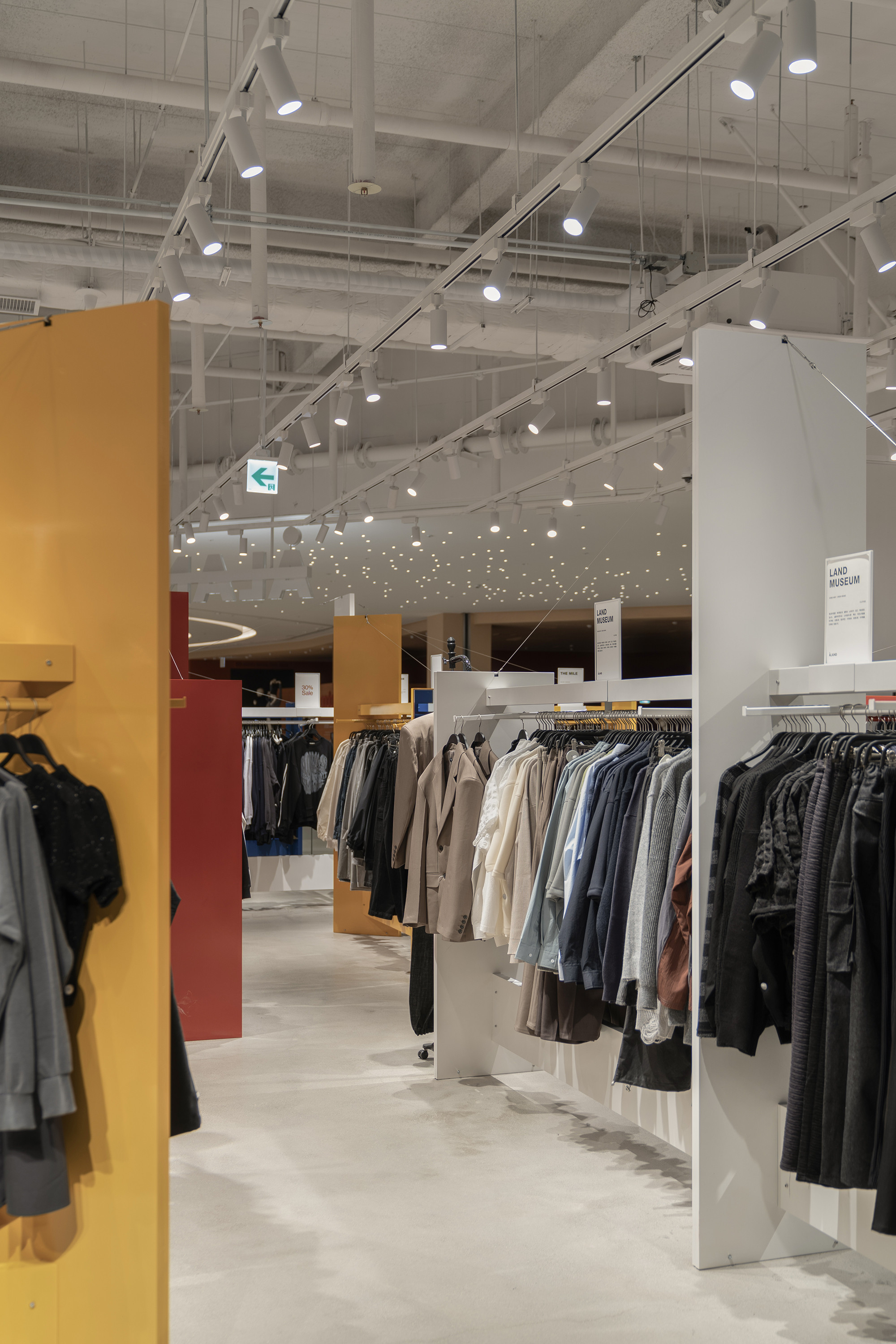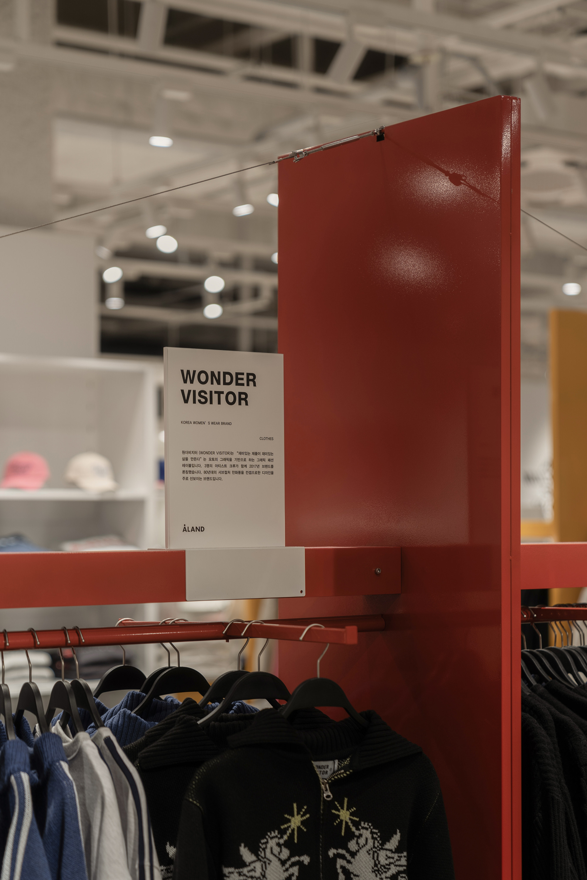 In 2024, we took on the design of the ÅLAND space at the newly opened Starfield Suwon branch. The layout of the space within Starfield presented challenges, particularly in achieving both a sense of spaciousness and effective product display capabilities. To address this, we opted for a design that combined planes and lines to create a sense of depth and openness. Utilizing lines reminiscent of clothes hangers and suspending them at a height of 1700mm, we incorporated planes to serve as supportive structures. However, the repetitive nature of planes and lines could potentially lead to visual monotony compared to other design forms. To counteract this, we deliberately twisted the arrangement of all elements, setting each plane and line at a minimum angle of 45 degrees to introduce variation and maintain visual interest.