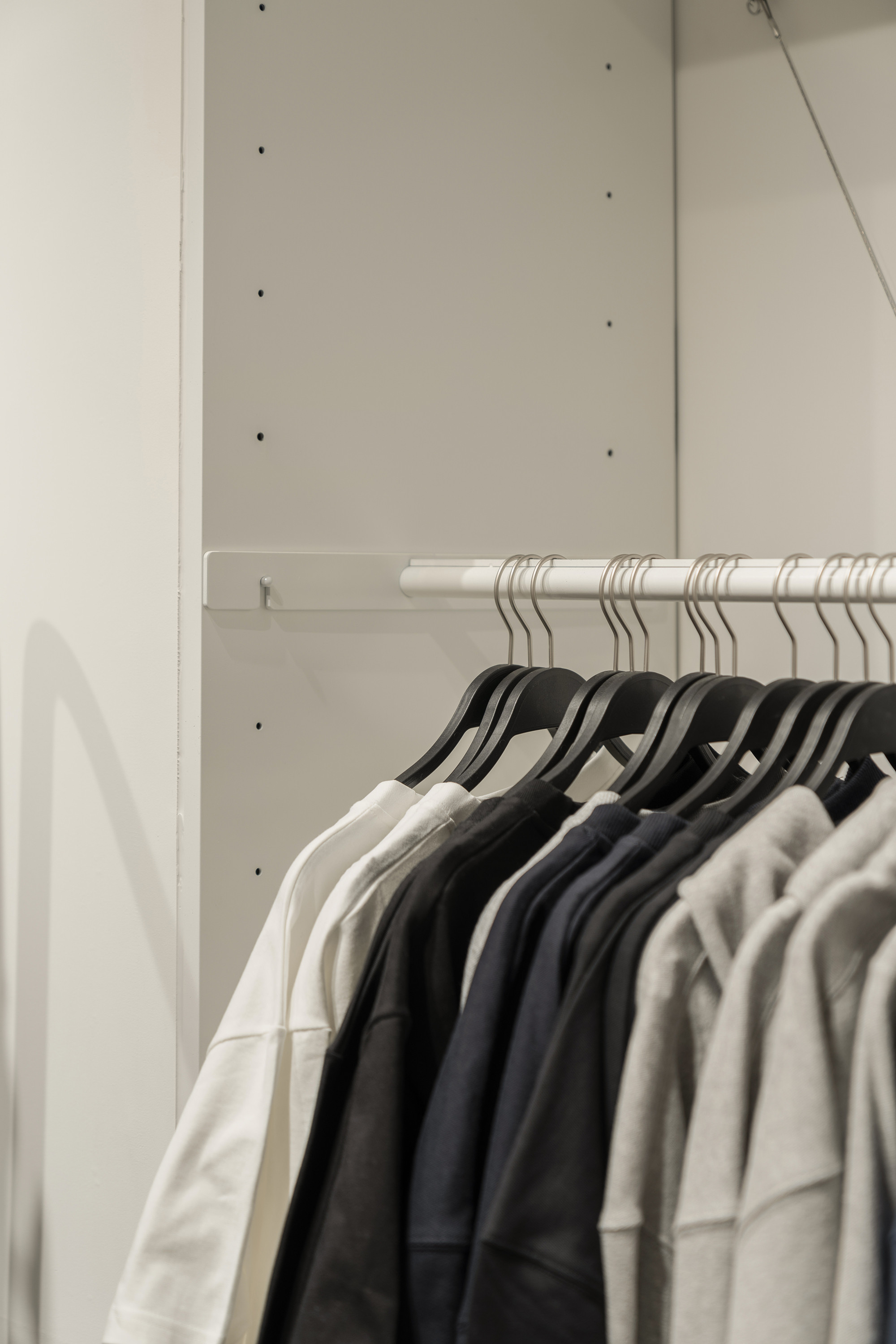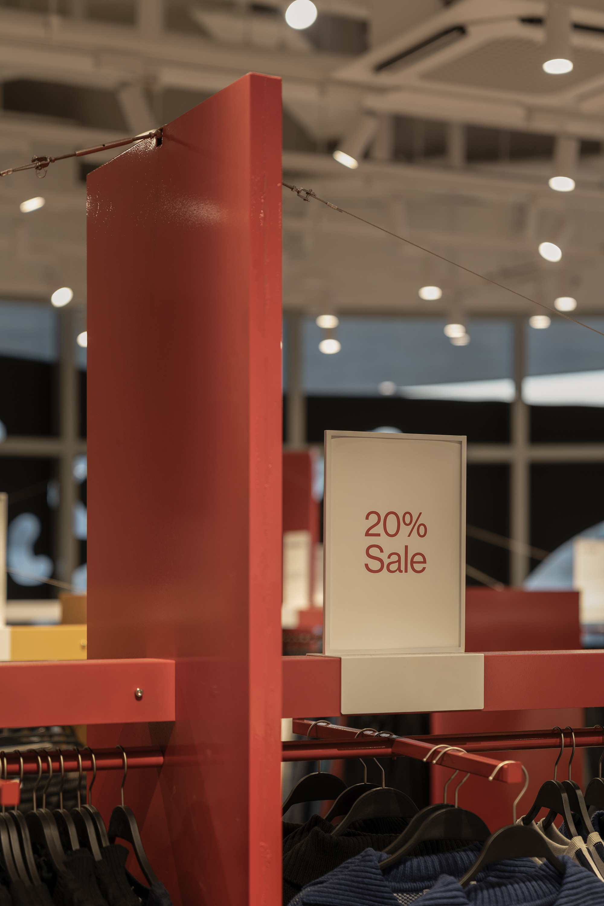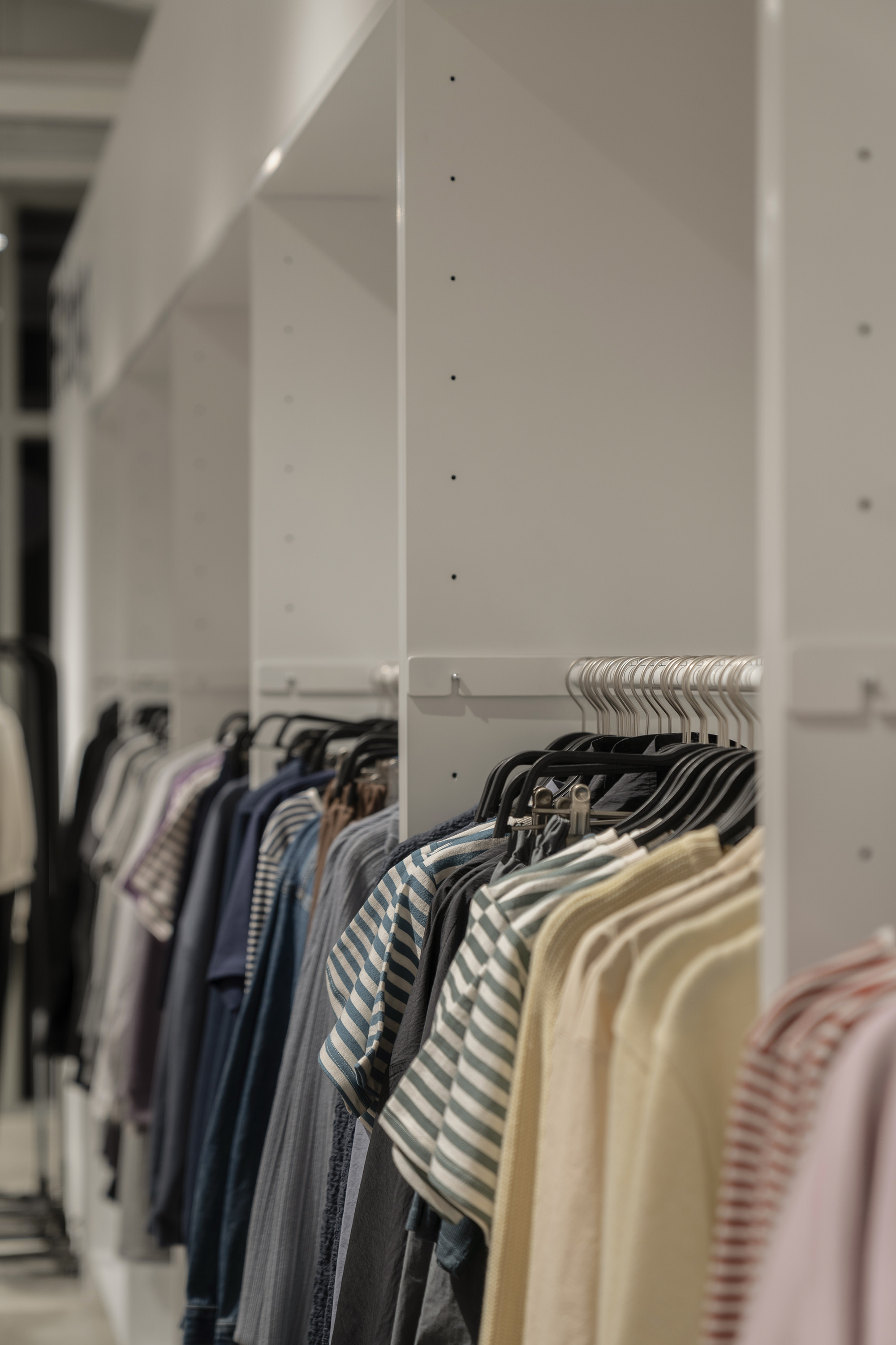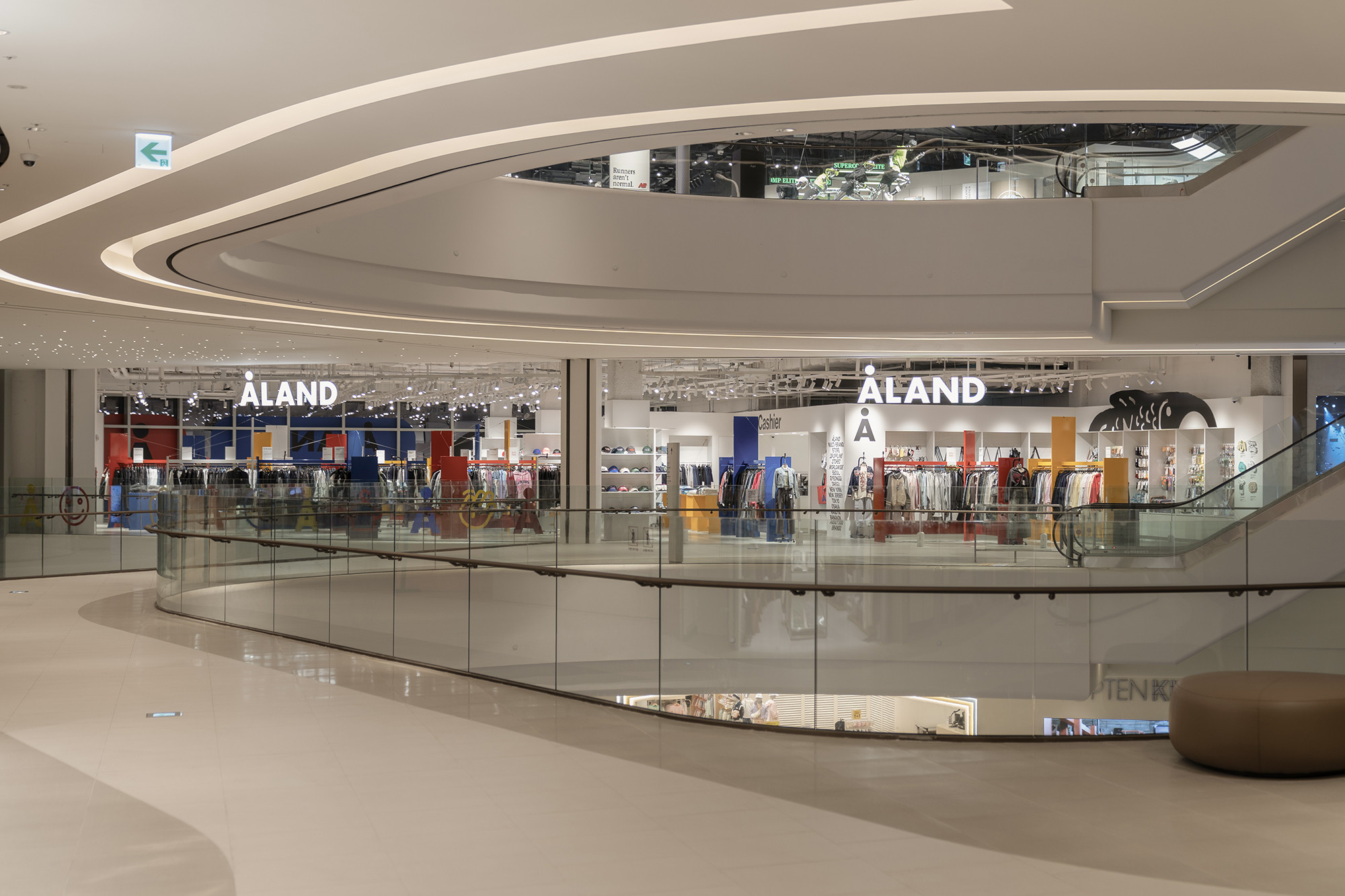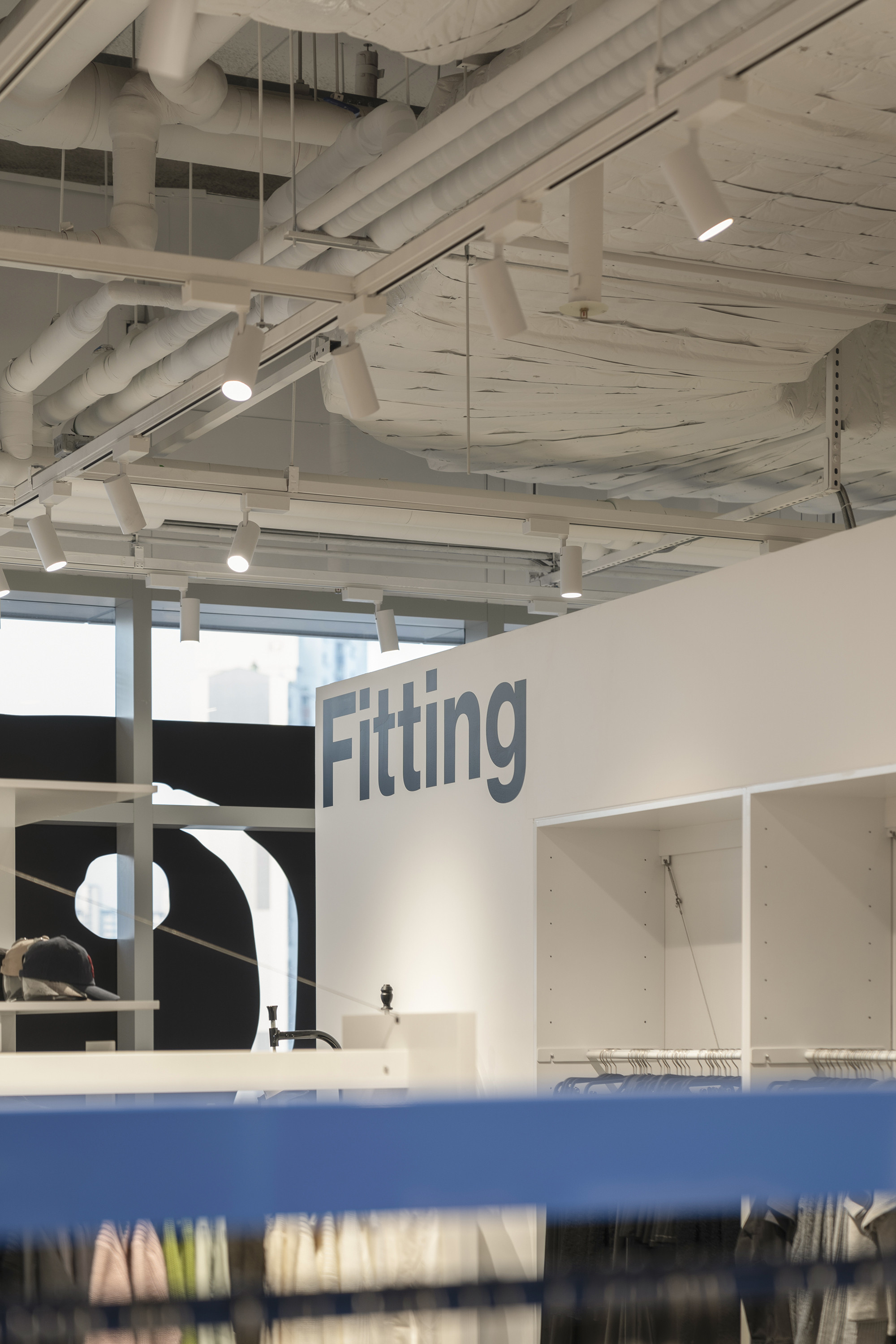 In 2024, we took on the design of the ÅLAND space at the newly opened Starfield Suwon branch. The layout of the space within Starfield presented challenges, particularly in achieving both a sense of spaciousness and effective product display capabilities. To address this, we opted for a design that combined planes and lines to create a sense of depth and openness. Utilizing lines reminiscent of clothes hangers and suspending them at a height of 1700mm, we incorporated planes to serve as supportive structures. However, the repetitive nature of planes and lines could potentially lead to visual monotony compared to other design forms. To counteract this, we deliberately twisted the arrangement of all elements, setting each plane and line at a minimum angle of 45 degrees to introduce variation and maintain visual interest.