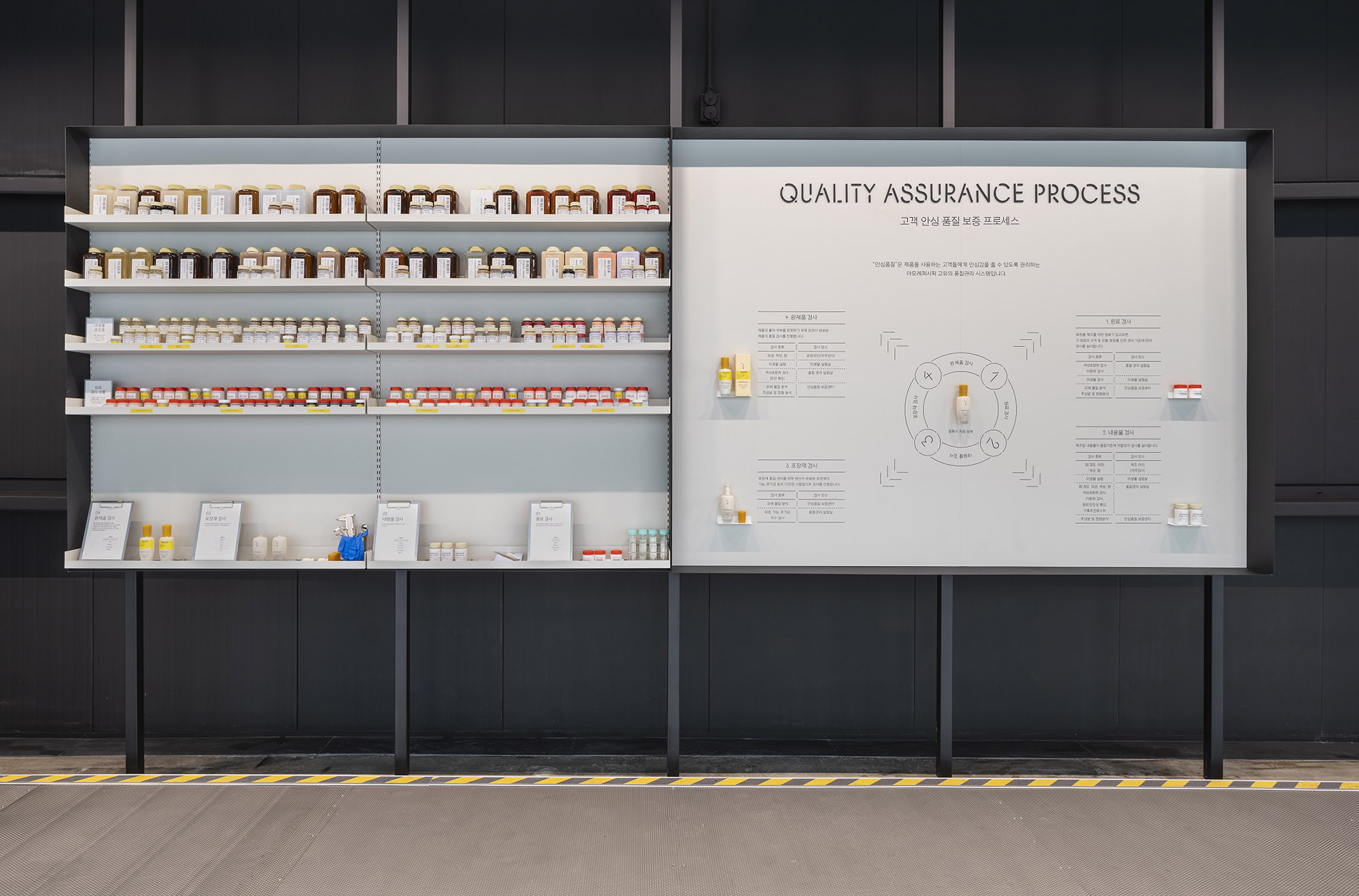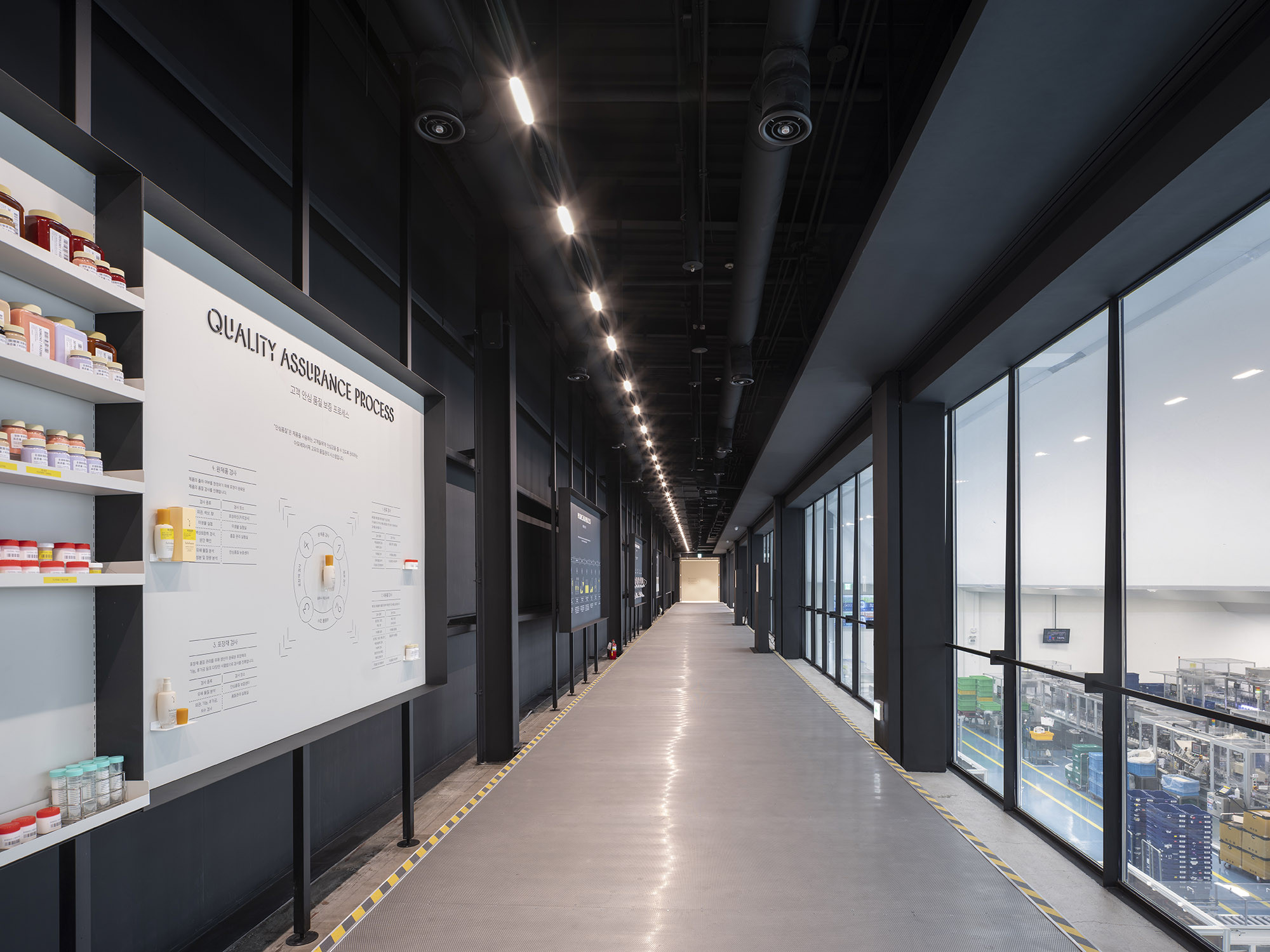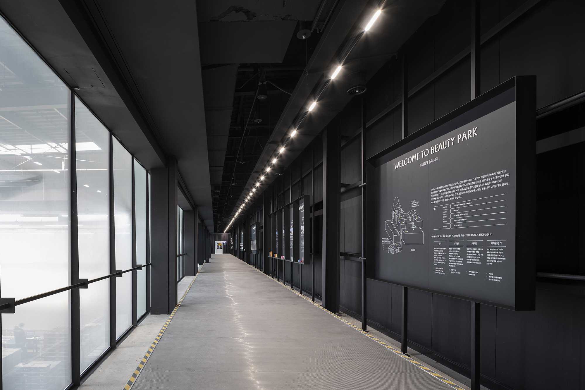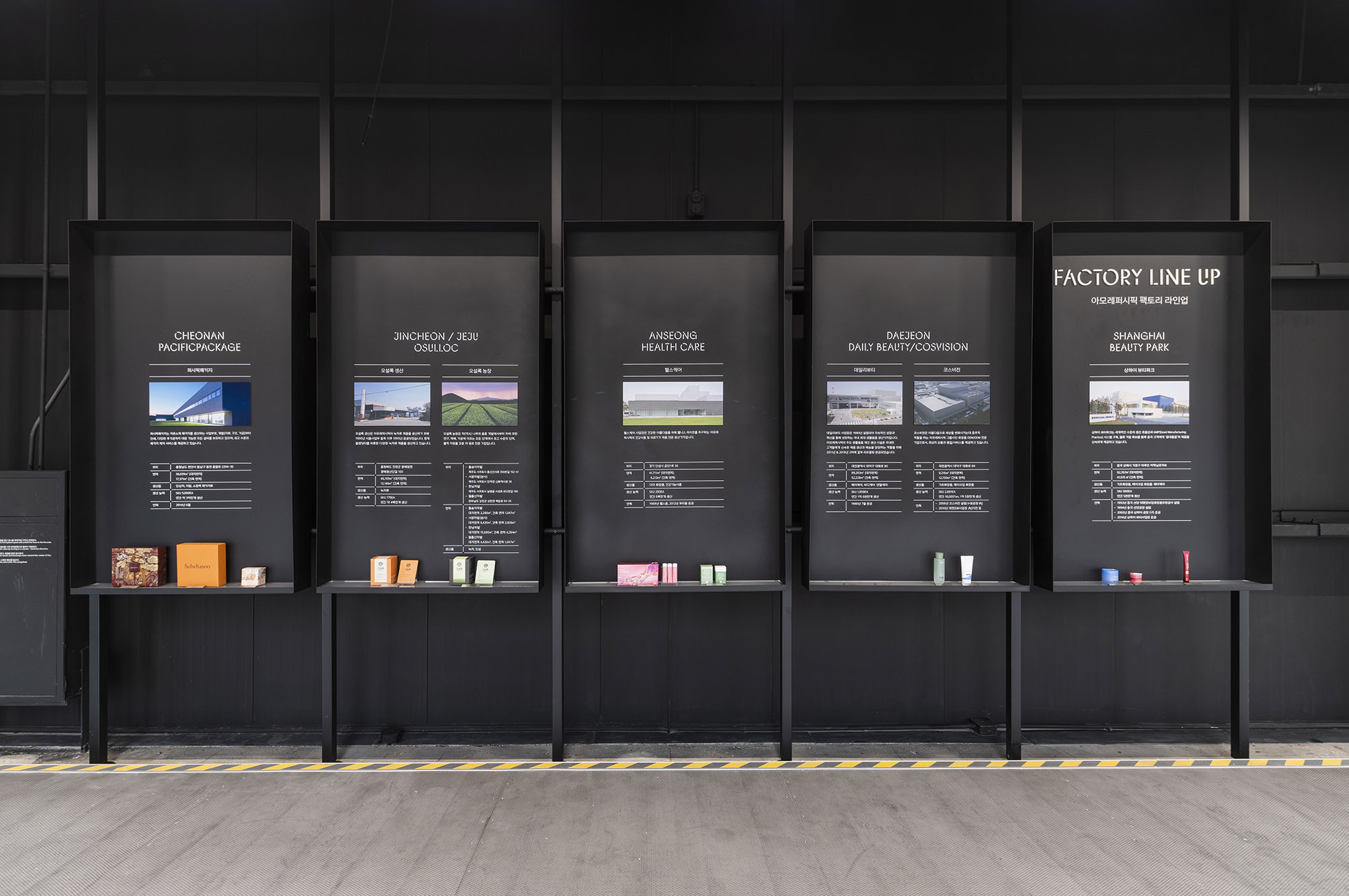 This project aims to transform the empty space within the Amore Pacific plant in Osan into an educational exhibition area. Given that it is located within a manufacturing plant, the space is designed to showcase Amore Pacific's manufacturing machinery and history. Materials are connected using bolts and nuts instead of welding, and structures are designed to share module sizes for easy reconfiguration when updating the exhibition contents. The manufacturing machine stand uses an aluminum pallet to withstand the weight of heavy machinery. The FACTORY ARCHIVE on the second floor showcases the history of Amore Pacific, while the FACTORY WALK on the third floor offers visitors an interactive experience of various manufacturing and production processes, including domestic and international production and logistics networks.