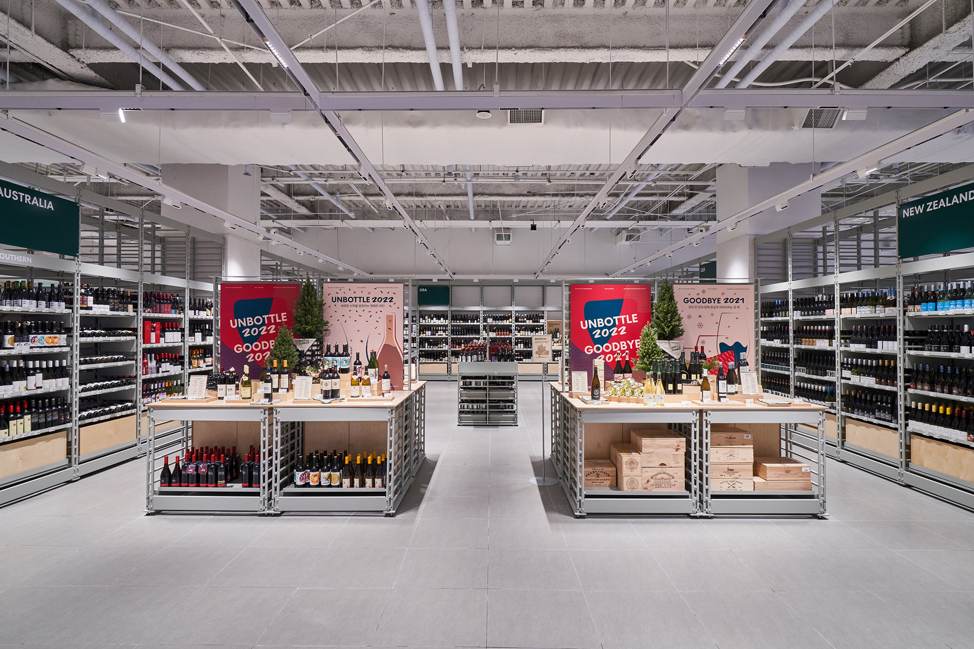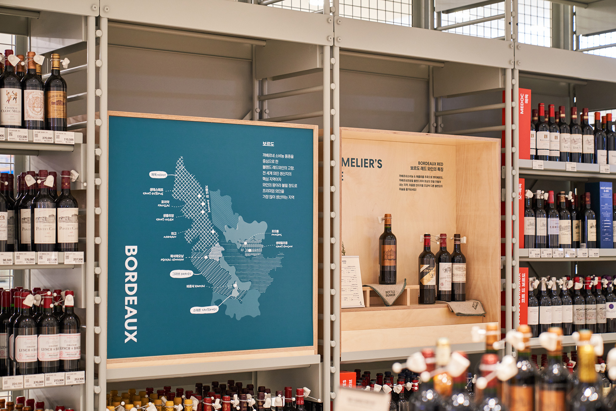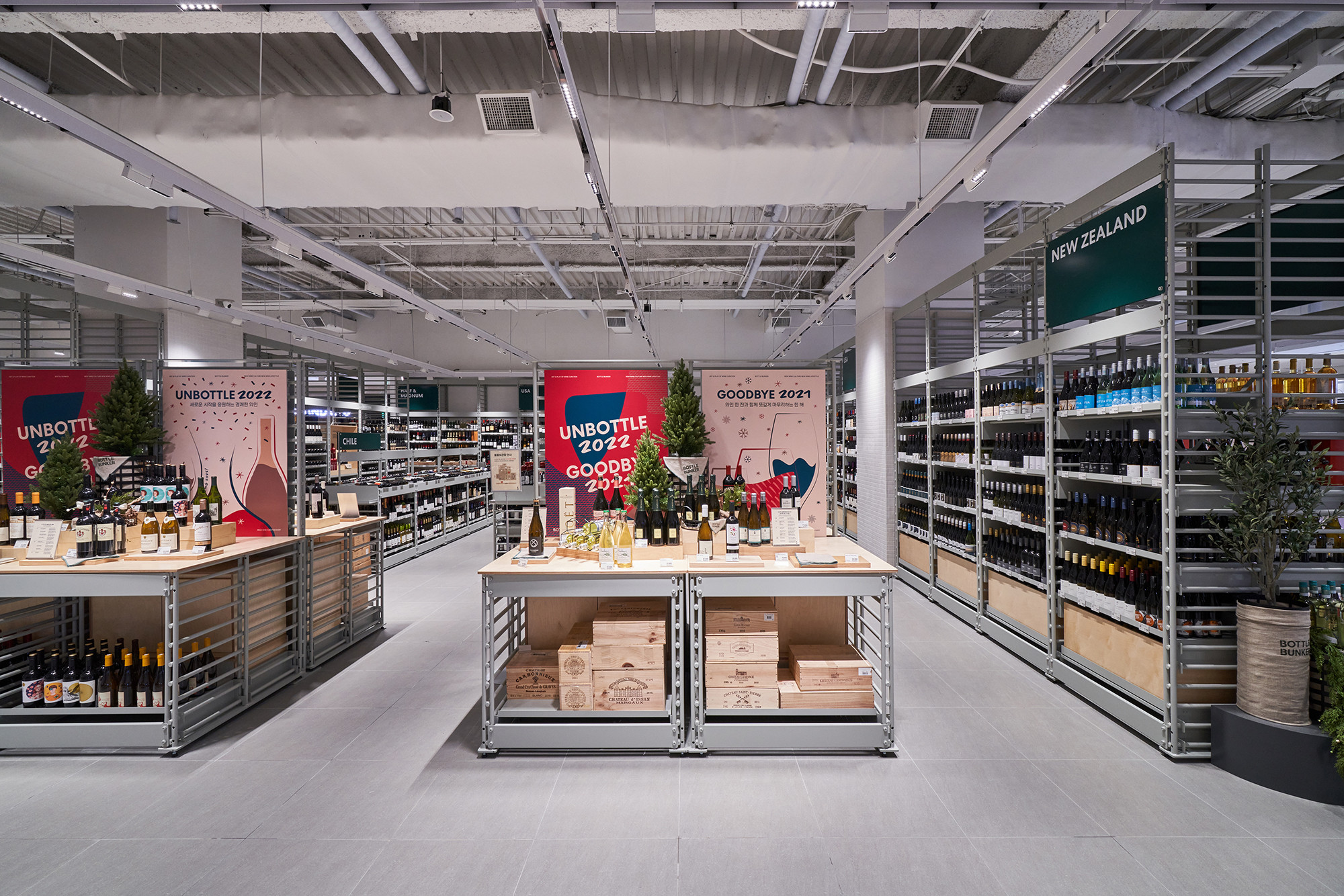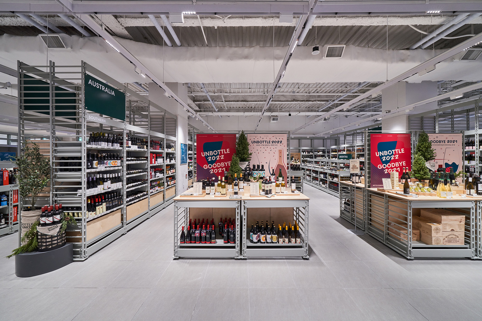 In 2021, Lotte Mart planned a mega store to sell a variety of alcoholic beverages, including wines, whiskies, and sakes, based on its systematic distribution network. Lotte Mart requested a spatial design that facilitates easy product rearrangement while avoiding a warehouse-like ambiance. Considering a 1070㎡ area, the design incorporated a layout tailored to the product flow, considering the number of products and shelves. During the design process, the necessity arose to distinguish between single-sided and double-sided shelving structures. To cater to the mega-mart setting, where many customers navigate with carts in both directions, a significant aisle width close to 2000mm was essential. Consequently, due to limited floor space, shelving had to extend to act as partitions within the store. The Bottle Bunker, envisioned as a store to be expanded nationwide while maintaining a consistent atmosphere, required a cost-effective and easily transformable design. Therefore, a modular system capable of transforming into sectional, double-sided, or table-like configurations was implemented. The single-sided units served the dual role of being attached to walls or standing to partition the store. To ensure stable displays, even with dozens of wine bottles, thick iron structures were designed, incorporating ladder-shaped pillars to connect shelves and create versatile spatial arrangements.
