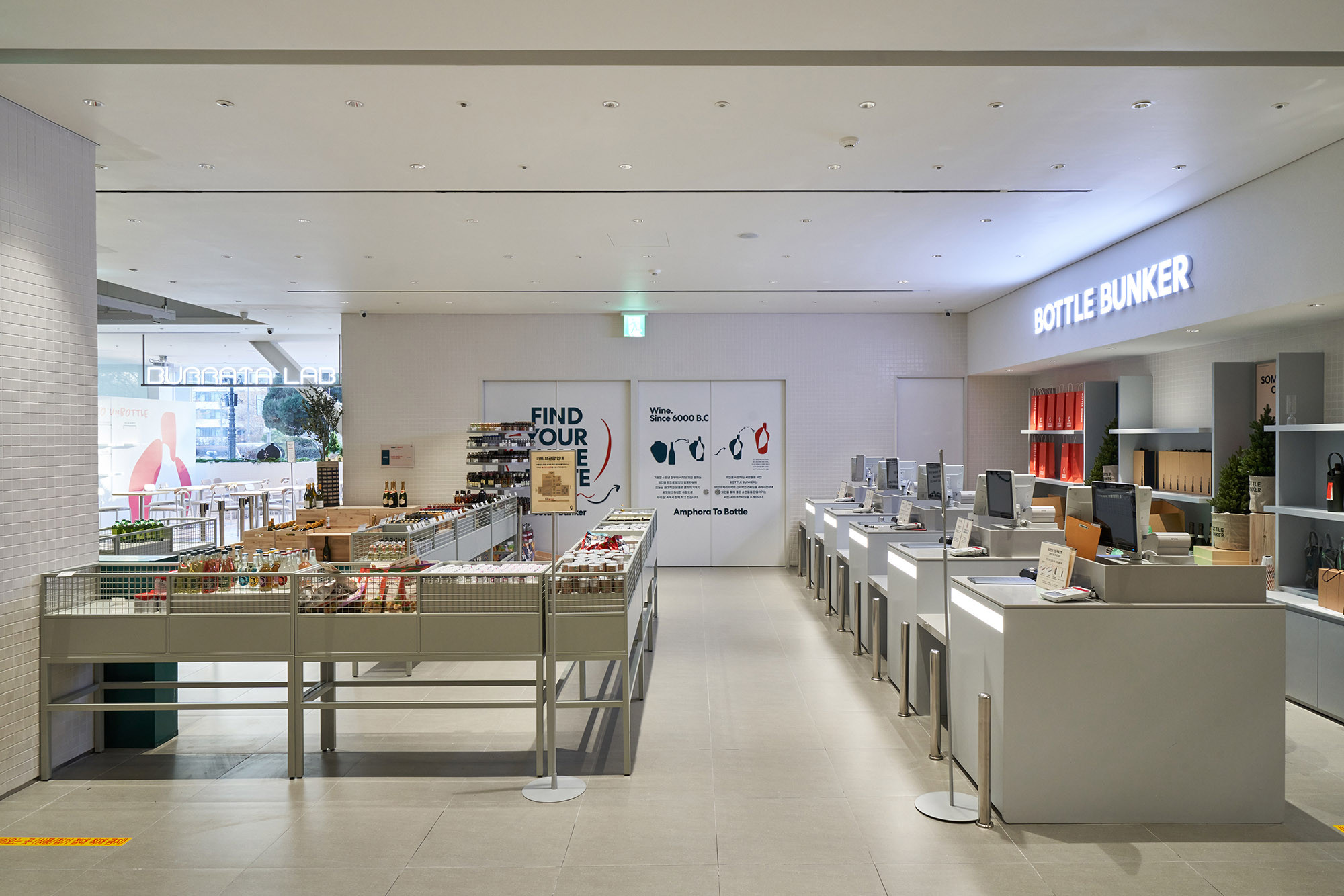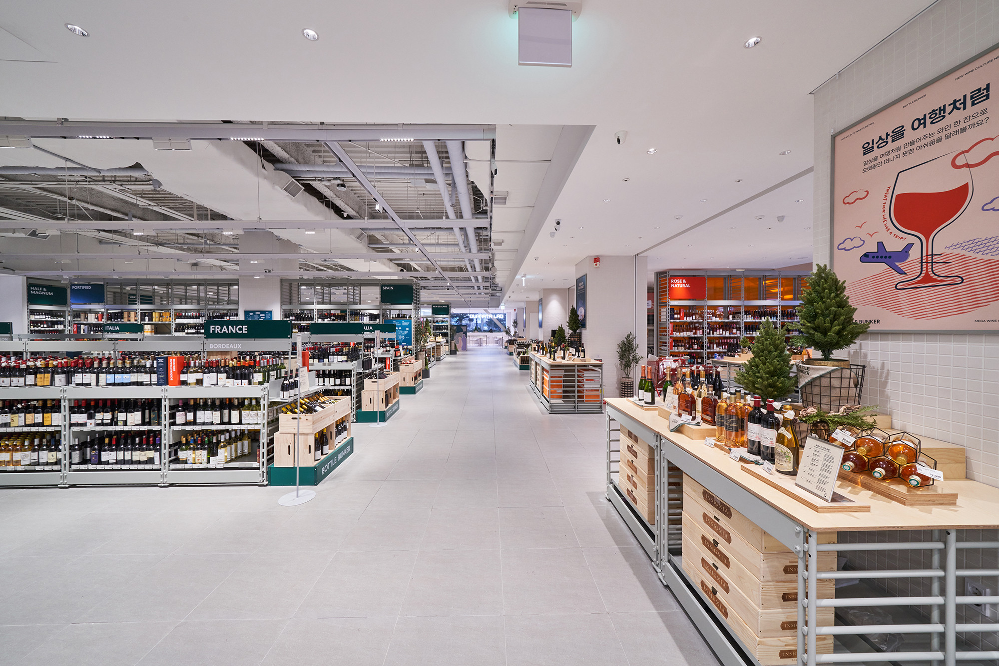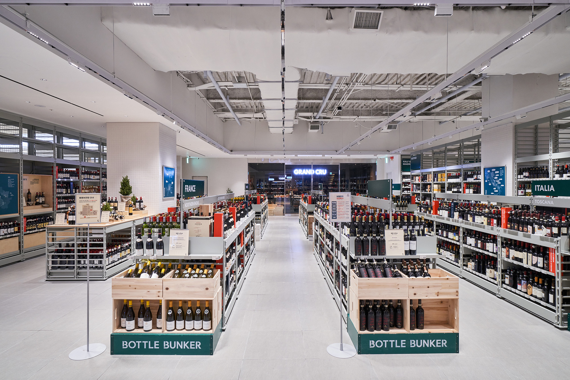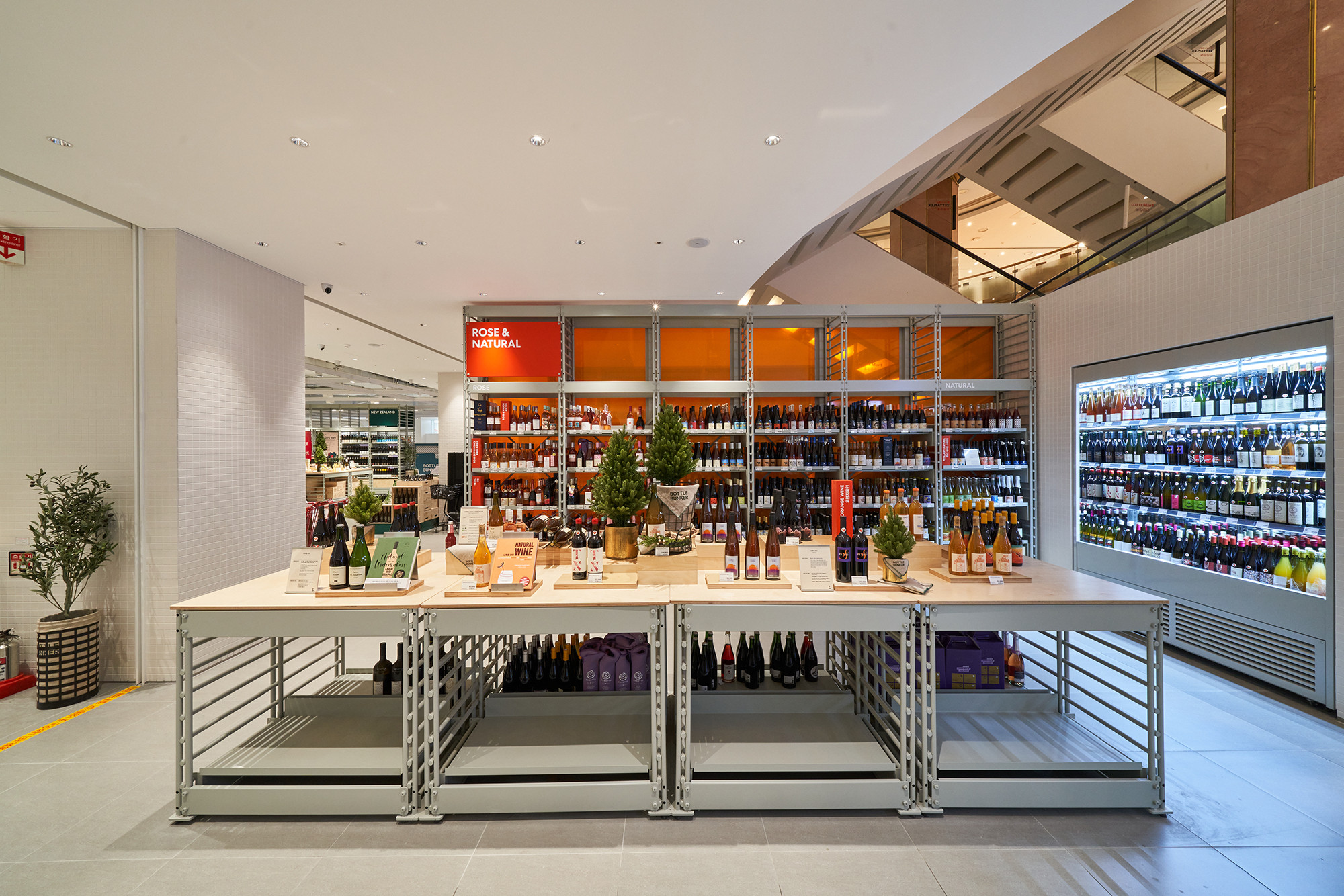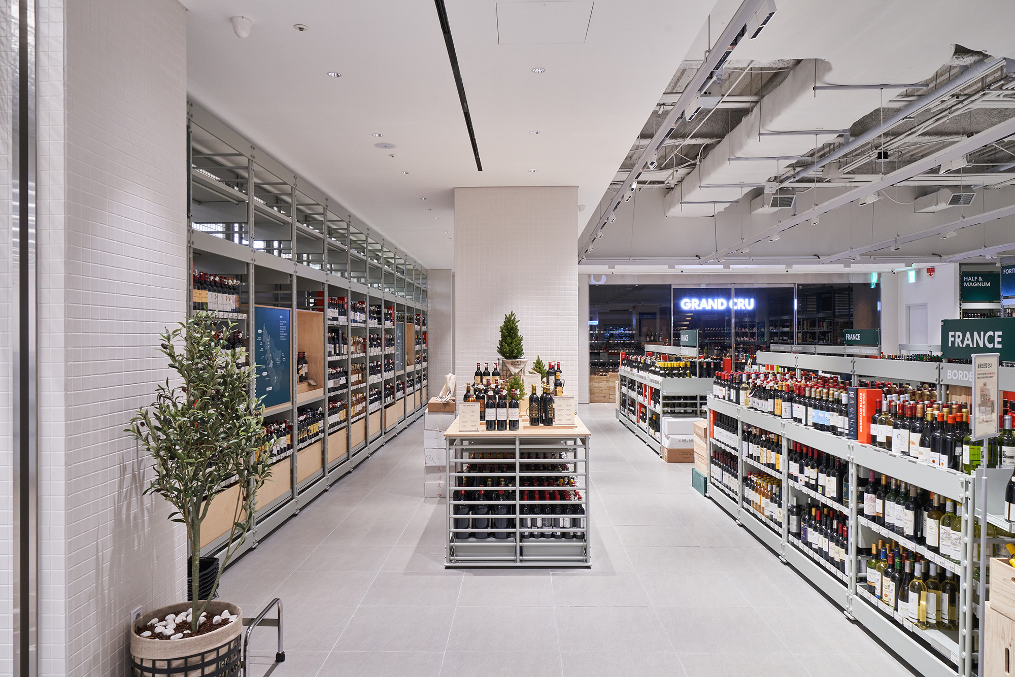 In 2021, Lotte Mart planned a mega store to sell a variety of alcoholic beverages, including wines, whiskies, and sakes, based on its systematic distribution network. Lotte Mart requested a spatial design that facilitates easy product rearrangement while avoiding a warehouse-like ambiance. Considering a 1070㎡ area, the design incorporated a layout tailored to the product flow, considering the number of products and shelves. During the design process, the necessity arose to distinguish between single-sided and double-sided shelving structures. To cater to the mega-mart setting, where many customers navigate with carts in both directions, a significant aisle width close to 2000mm was essential. Consequently, due to limited floor space, shelving had to extend to act as partitions within the store. The Bottle Bunker, envisioned as a store to be expanded nationwide while maintaining a consistent atmosphere, required a cost-effective and easily transformable design. Therefore, a modular system capable of transforming into sectional, double-sided, or table-like configurations was implemented. The single-sided units served the dual role of being attached to walls or standing to partition the store. To ensure stable displays, even with dozens of wine bottles, thick iron structures were designed, incorporating ladder-shaped pillars to connect shelves and create versatile spatial arrangements.