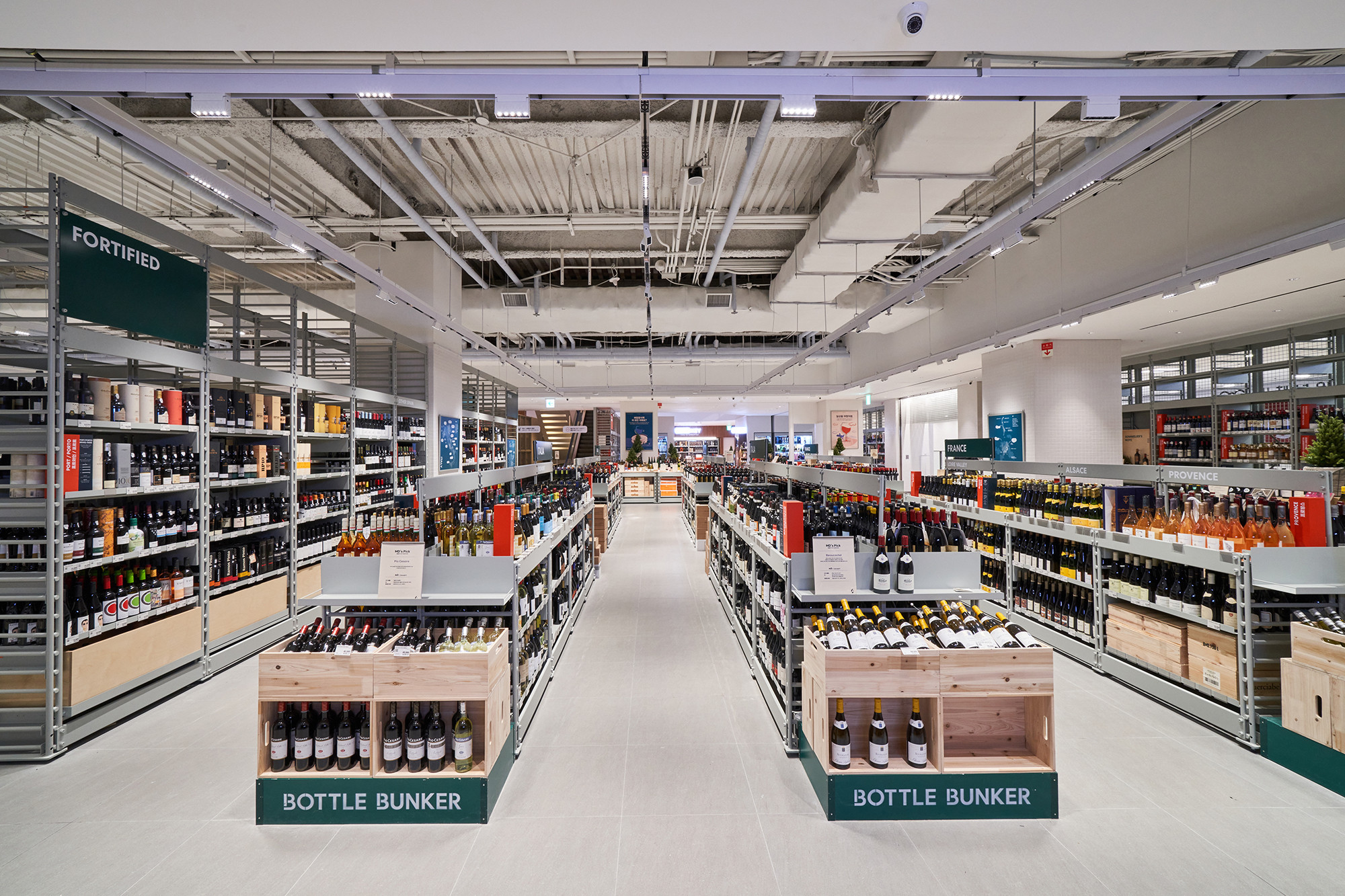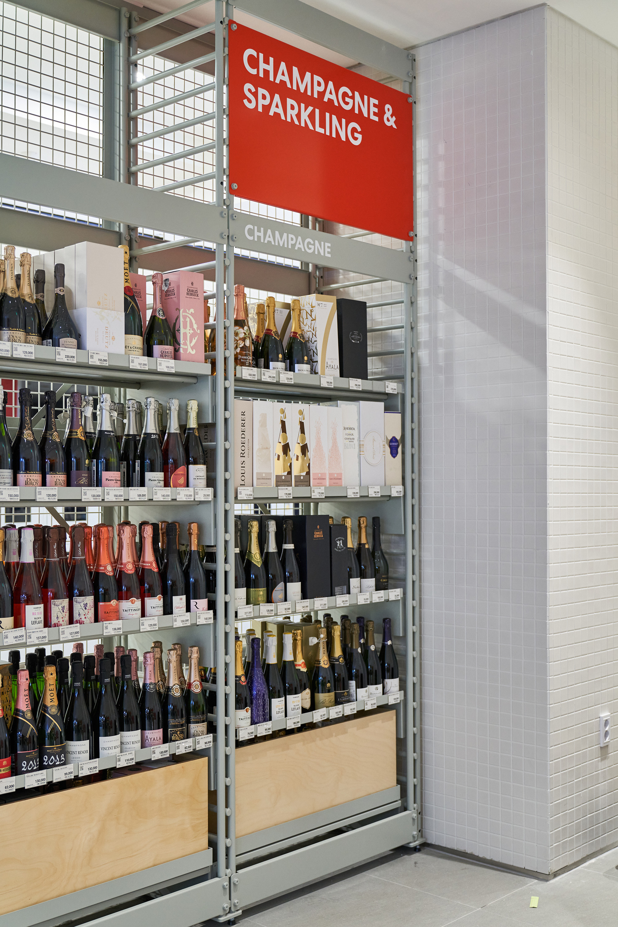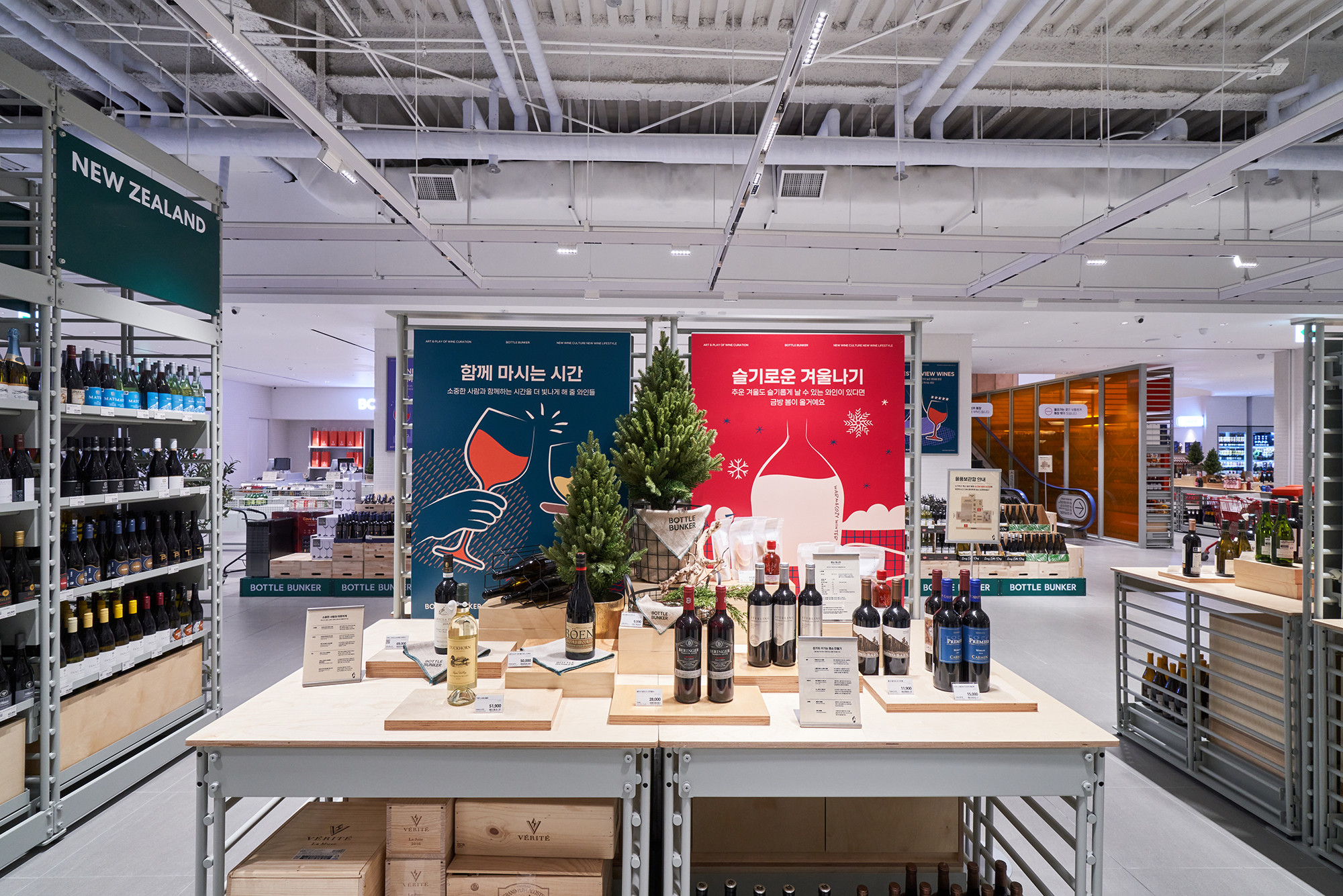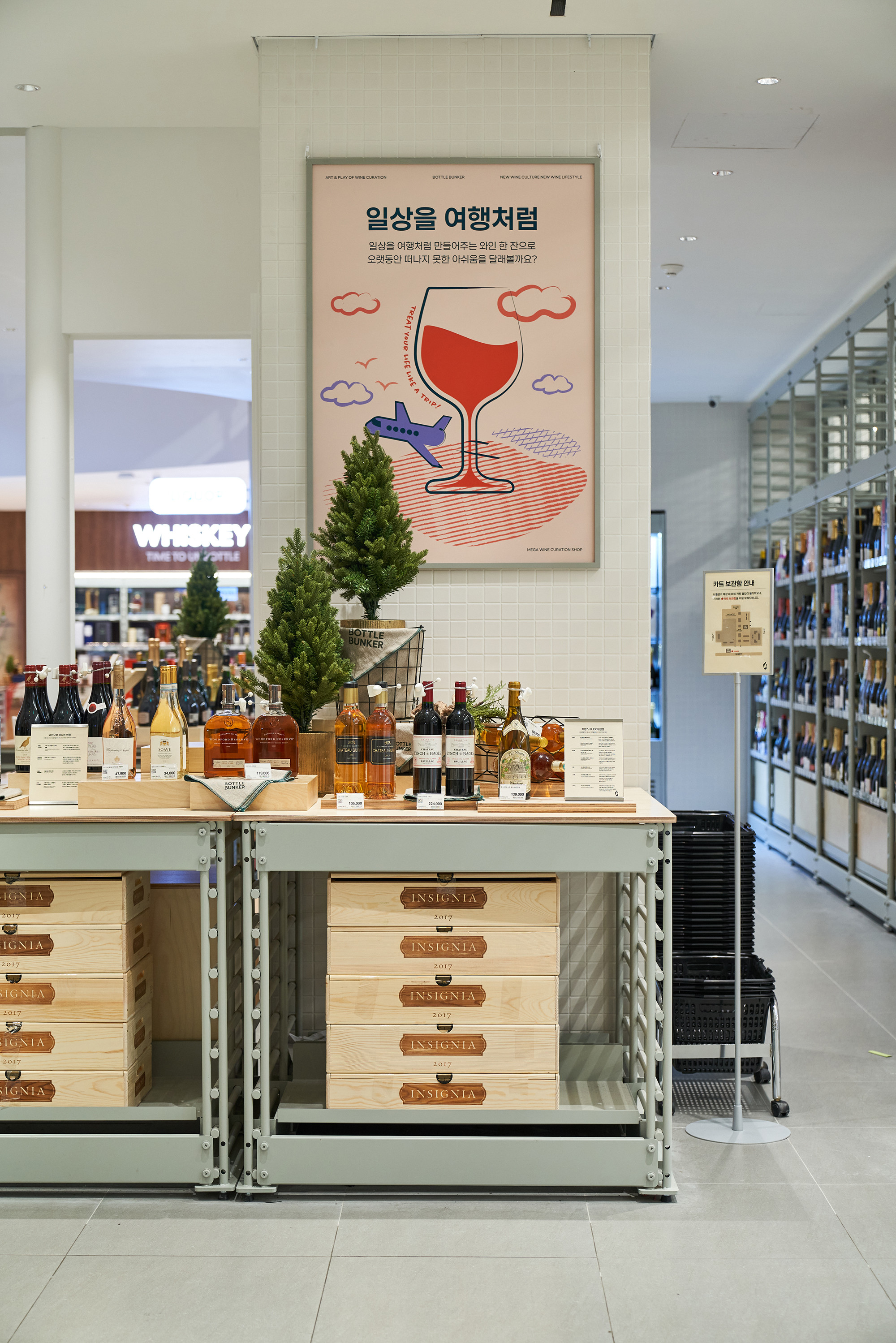 In 2021, Lotte Mart planned a mega store to sell a variety of alcoholic beverages, including wines, whiskies, and sakes, based on its systematic distribution network. Lotte Mart requested a spatial design that facilitates easy product rearrangement while avoiding a warehouse-like ambiance. Considering a 1070㎡ area, the design incorporated a layout tailored to the product flow, considering the number of products and shelves. During the design process, the necessity arose to distinguish between single-sided and double-sided shelving structures. To cater to the mega-mart setting, where many customers navigate with carts in both directions, a significant aisle width close to 2000mm was essential. Consequently, due to limited floor space, shelving had to extend to act as partitions within the store. The Bottle Bunker, envisioned as a store to be expanded nationwide while maintaining a consistent atmosphere, required a cost-effective and easily transformable design. Therefore, a modular system capable of transforming into sectional, double-sided, or table-like configurations was implemented. The single-sided units served the dual role of being attached to walls or standing to partition the store. To ensure stable displays, even with dozens of wine bottles, thick iron structures were designed, incorporating ladder-shaped pillars to connect shelves and create versatile spatial arrangements.