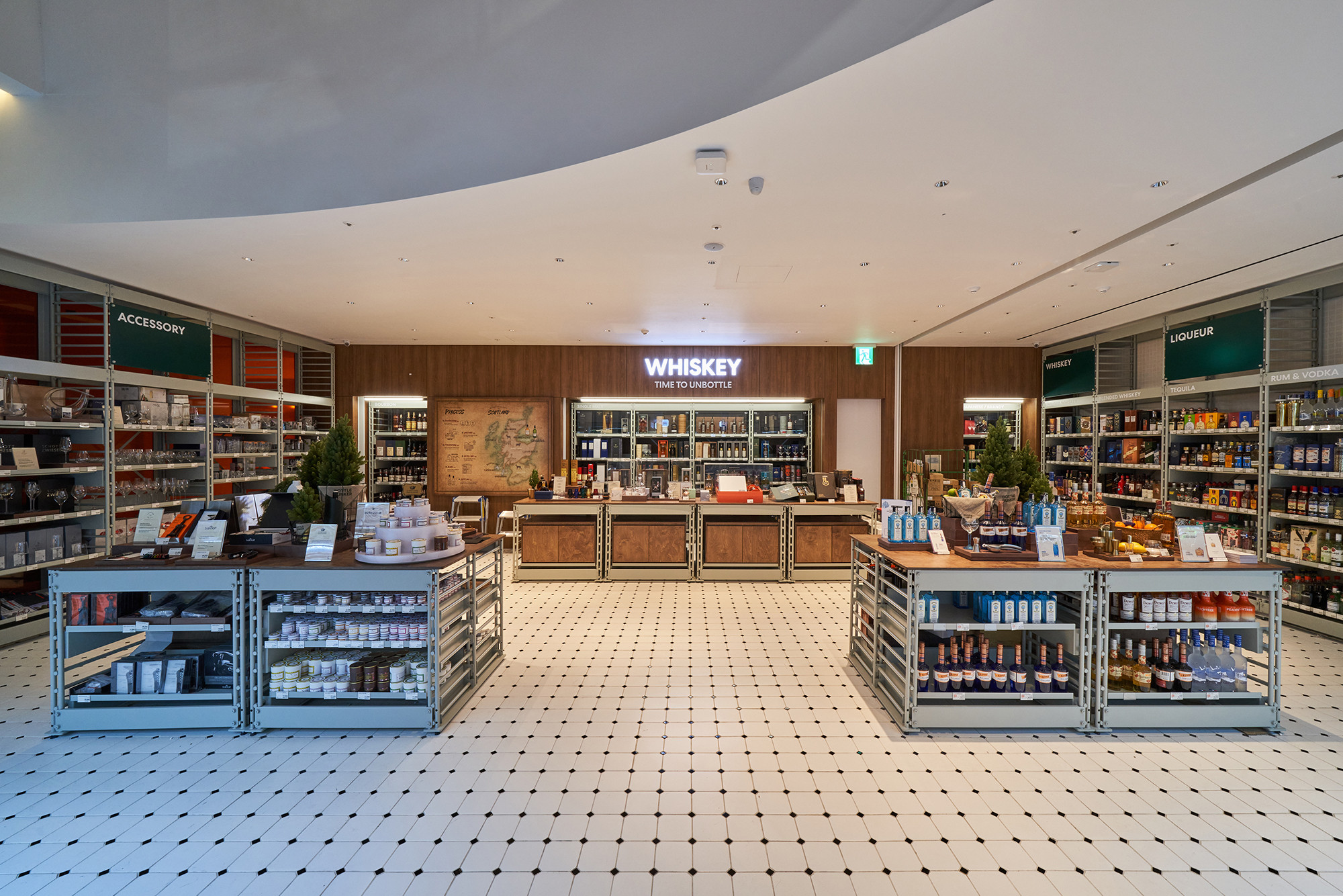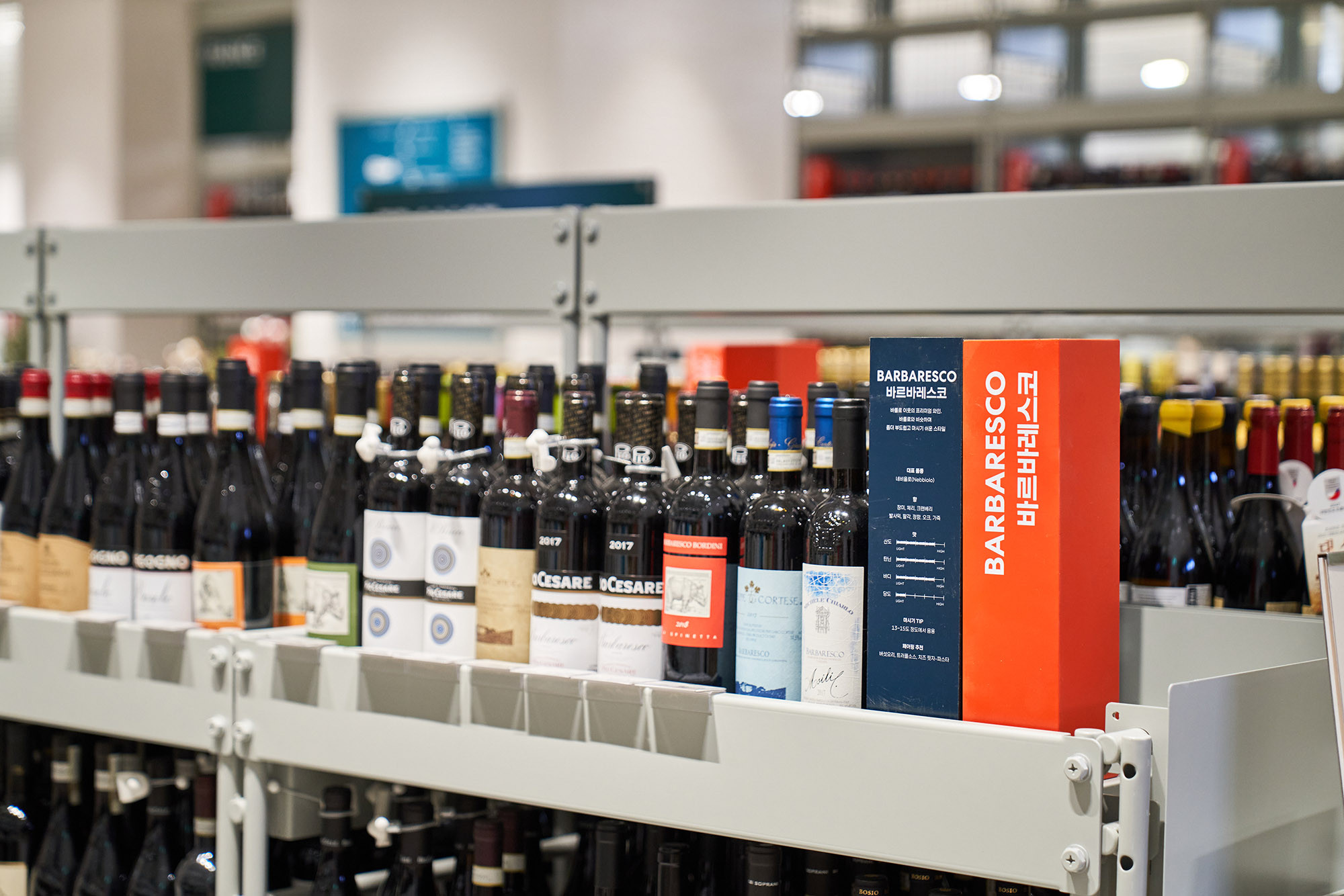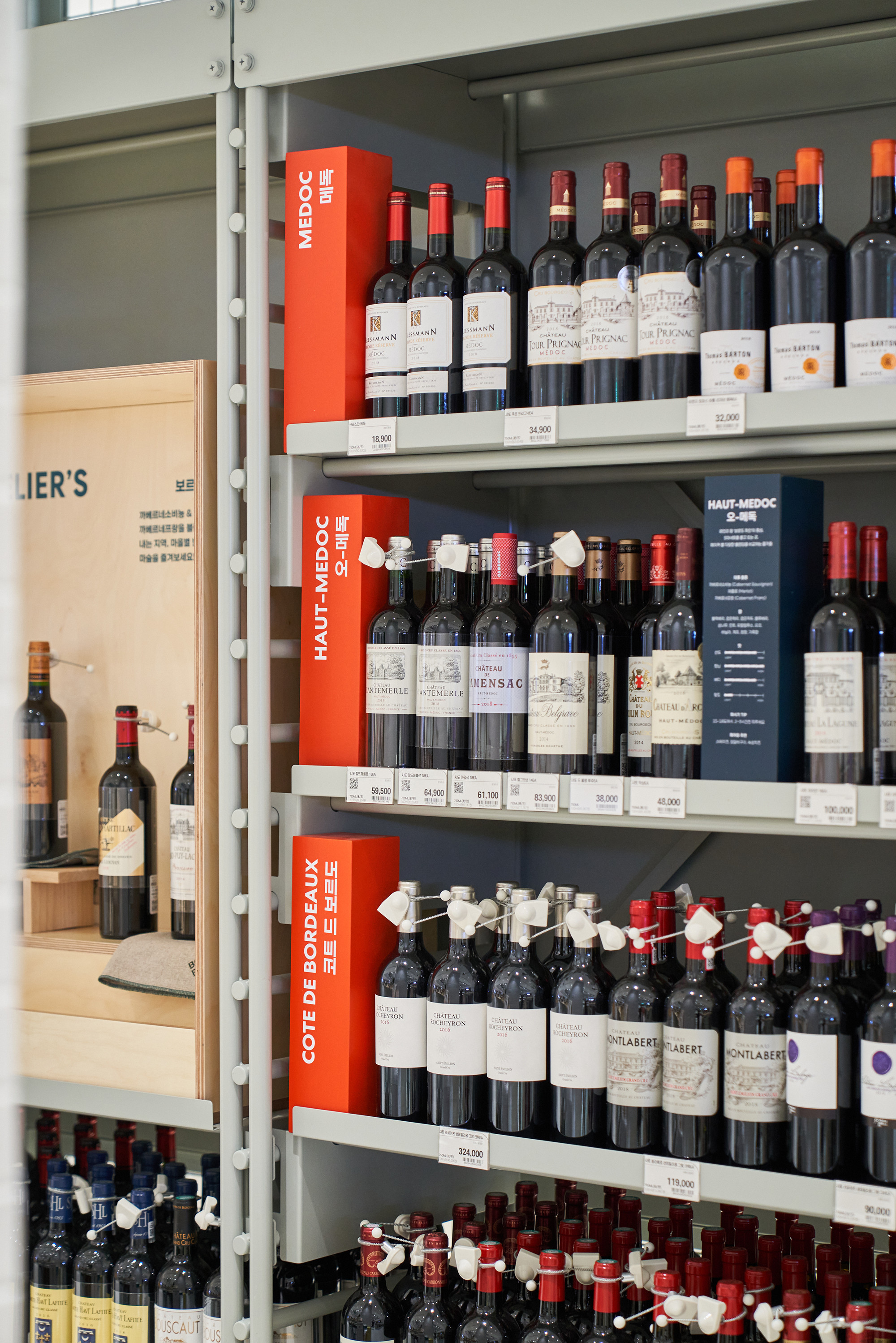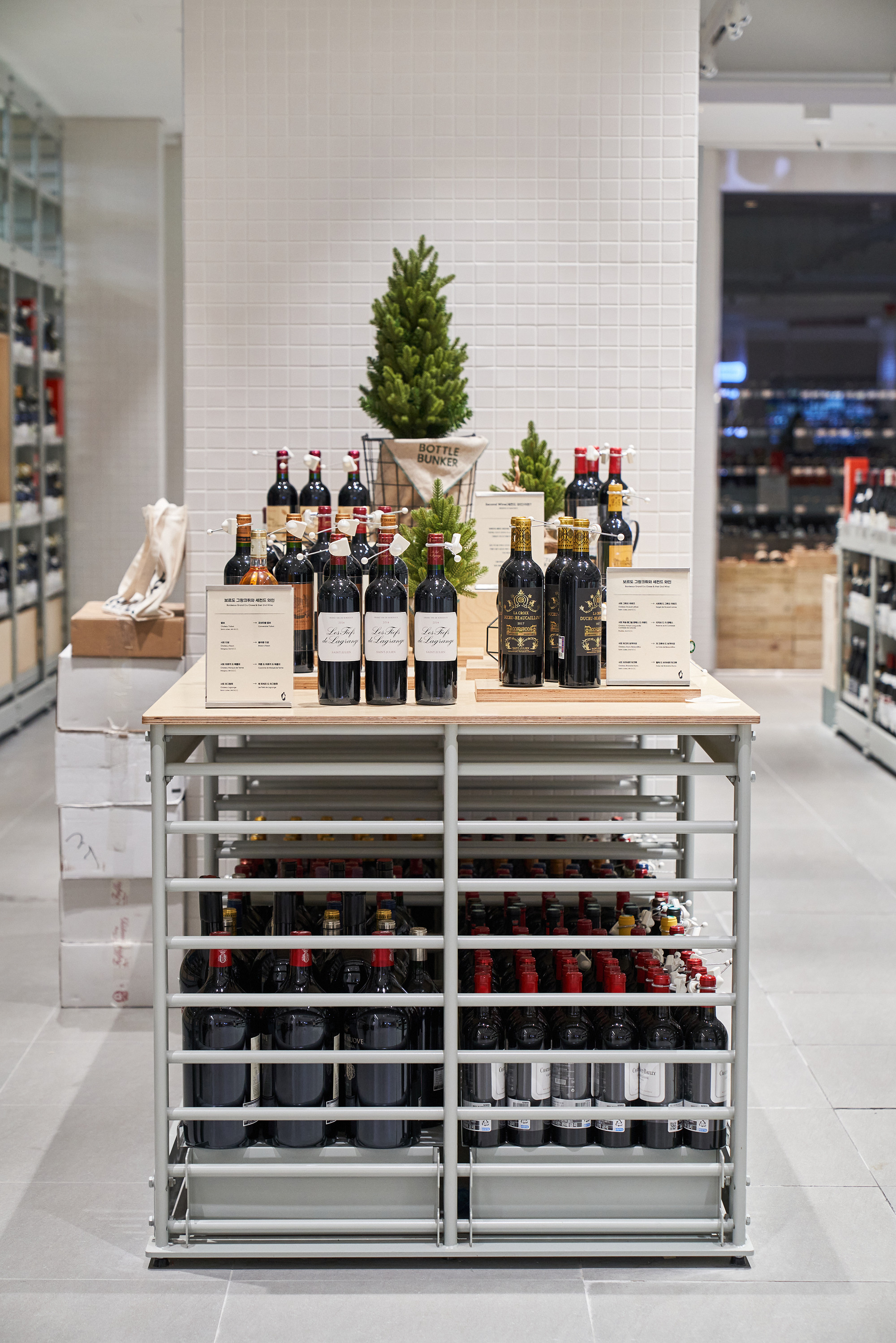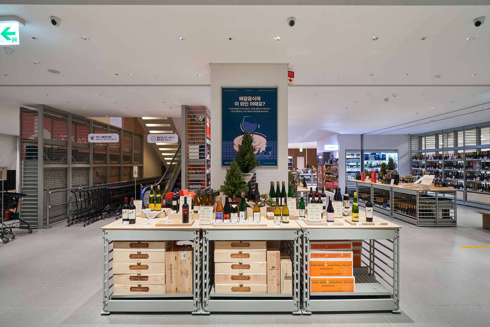 In 2021, Lotte Mart planned a mega store to sell a variety of alcoholic beverages, including wines, whiskies, and sakes, based on its systematic distribution network. Lotte Mart requested a spatial design that facilitates easy product rearrangement while avoiding a warehouse-like ambiance. Considering a 1070㎡ area, the design incorporated a layout tailored to the product flow, considering the number of products and shelves. During the design process, the necessity arose to distinguish between single-sided and double-sided shelving structures. To cater to the mega-mart setting, where many customers navigate with carts in both directions, a significant aisle width close to 2000mm was essential. Consequently, due to limited floor space, shelving had to extend to act as partitions within the store. The Bottle Bunker, envisioned as a store to be expanded nationwide while maintaining a consistent atmosphere, required a cost-effective and easily transformable design. Therefore, a modular system capable of transforming into sectional, double-sided, or table-like configurations was implemented. The single-sided units served the dual role of being attached to walls or standing to partition the store. To ensure stable displays, even with dozens of wine bottles, thick iron structures were designed, incorporating ladder-shaped pillars to connect shelves and create versatile spatial arrangements.