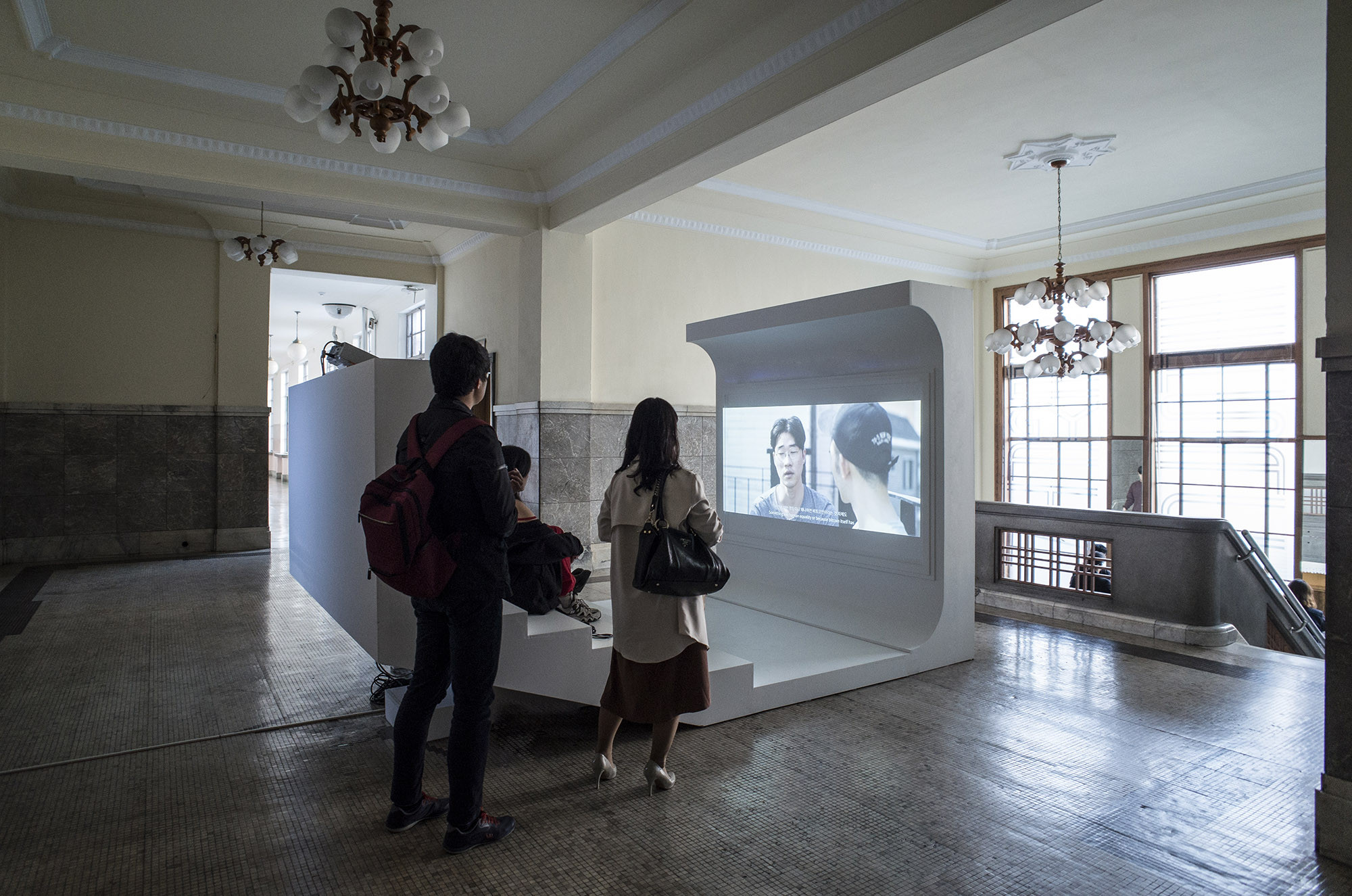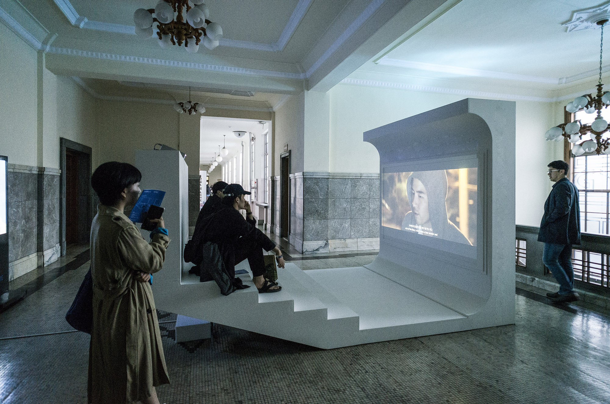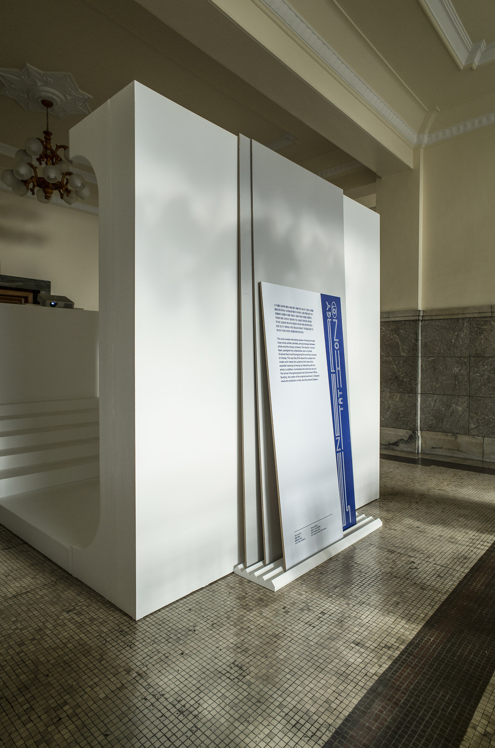 The group exhibition "Energy Station 01," which was held at the historic former Chungnam Provincial Office, a prominent example of modern architecture in Daejeon, served as CNCITY Energy's (Chungnam Urban Gas) inaugural project as part of their patronage initiative. It aimed to support experimental artistic endeavors and promote cultural engagement among local youth. Due to its status as a cultural heritage site, the building could not undergo any alterations or damage, necessitating a design approach that either leaned on existing structures or introduced lightweight installations. The interior design maintained coherence with the building's original aesthetic to avoid discordance. However, the screening room adopted a distinct visual language to counteract the building's perceived solidity and monotony, aiming for an innovative, suspended seating arrangement. This design strategy allowed for a novel spatial experience within the constraints of a heritage building.