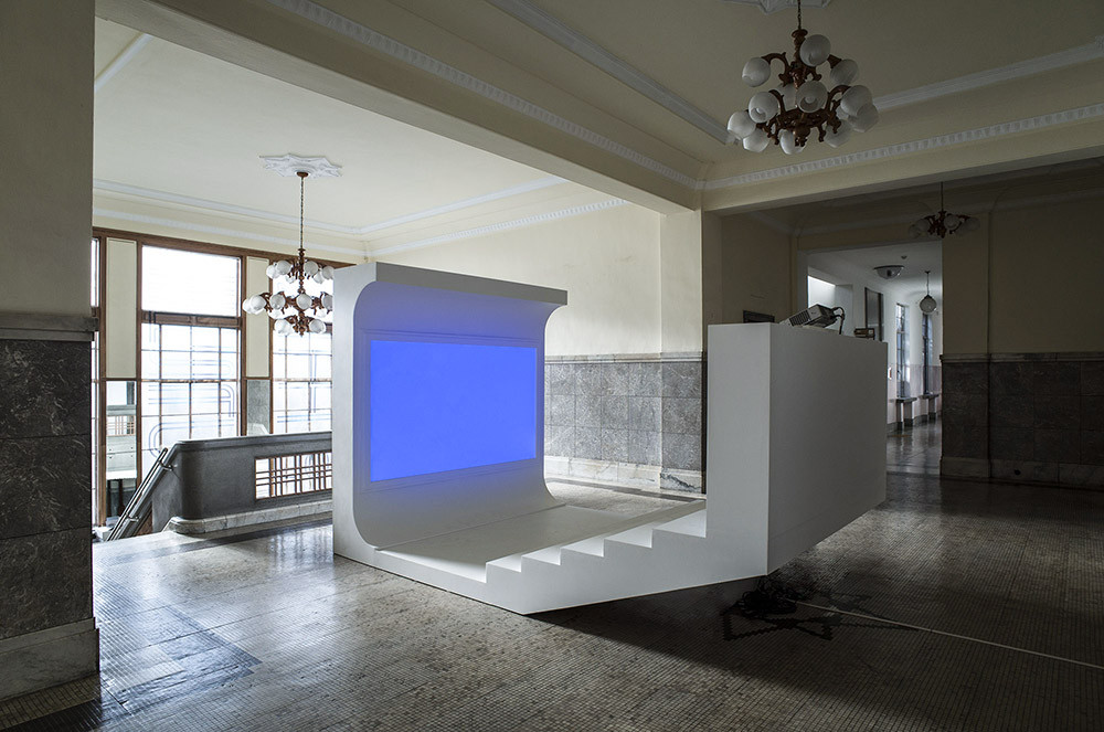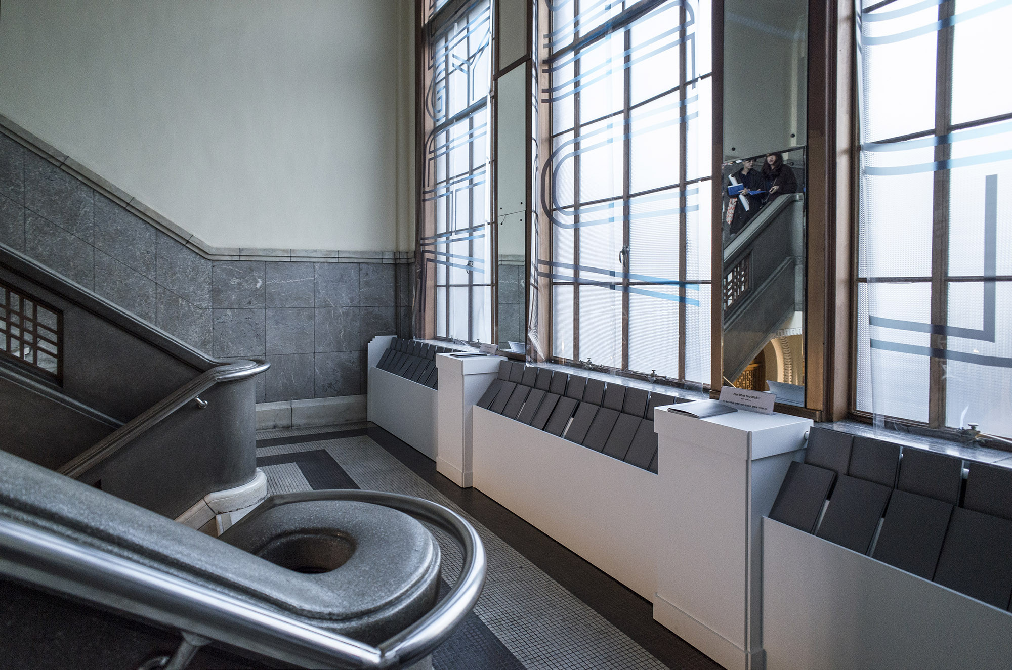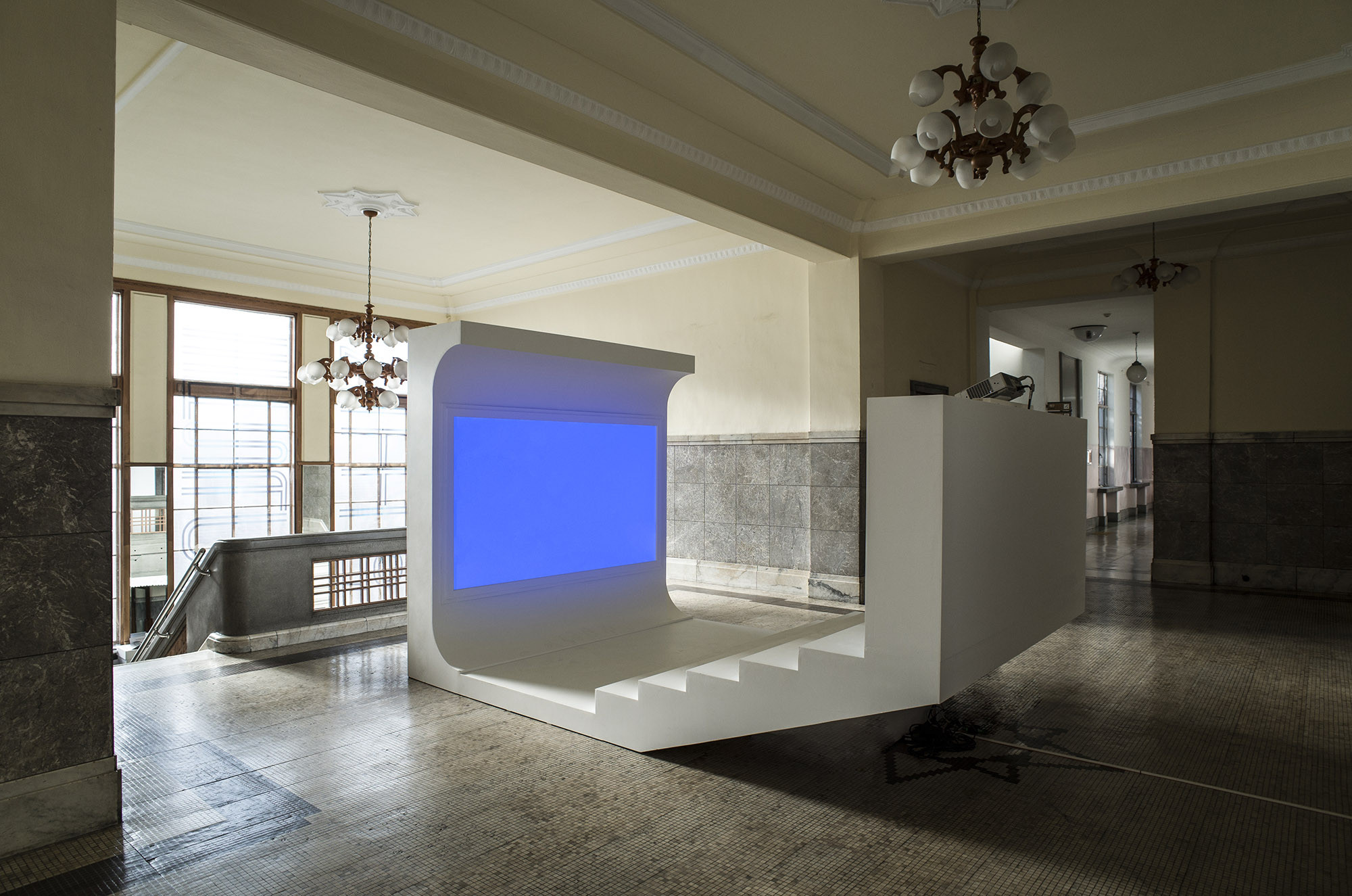 The group exhibition "Energy Station 01," which was held at the historic former Chungnam Provincial Office, a prominent example of modern architecture in Daejeon, served as CNCITY Energy's (Chungnam Urban Gas) inaugural project as part of their patronage initiative. It aimed to support experimental artistic endeavors and promote cultural engagement among local youth. Due to its status as a cultural heritage site, the building could not undergo any alterations or damage, necessitating a design approach that either leaned on existing structures or introduced lightweight installations. The interior design maintained coherence with the building's original aesthetic to avoid discordance. However, the screening room adopted a distinct visual language to counteract the building's perceived solidity and monotony, aiming for an innovative, suspended seating arrangement. This design strategy allowed for a novel spatial experience within the constraints of a heritage building.