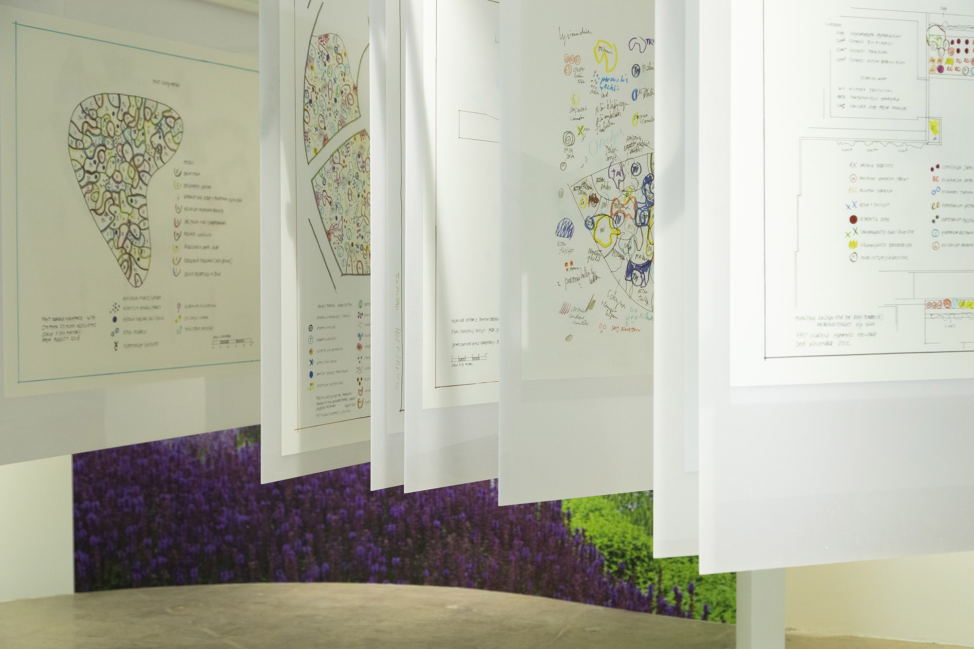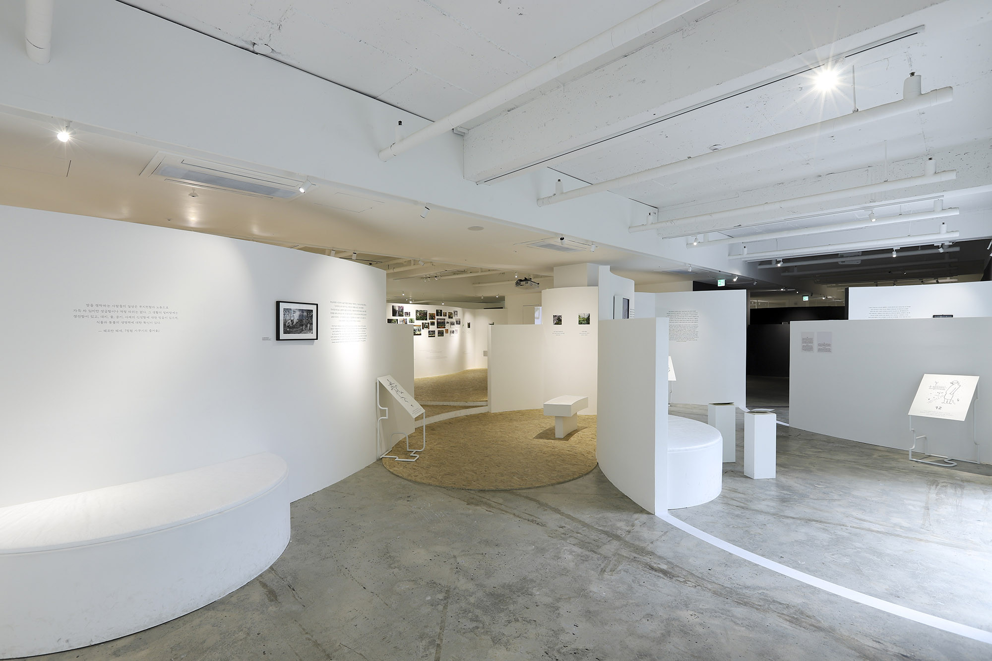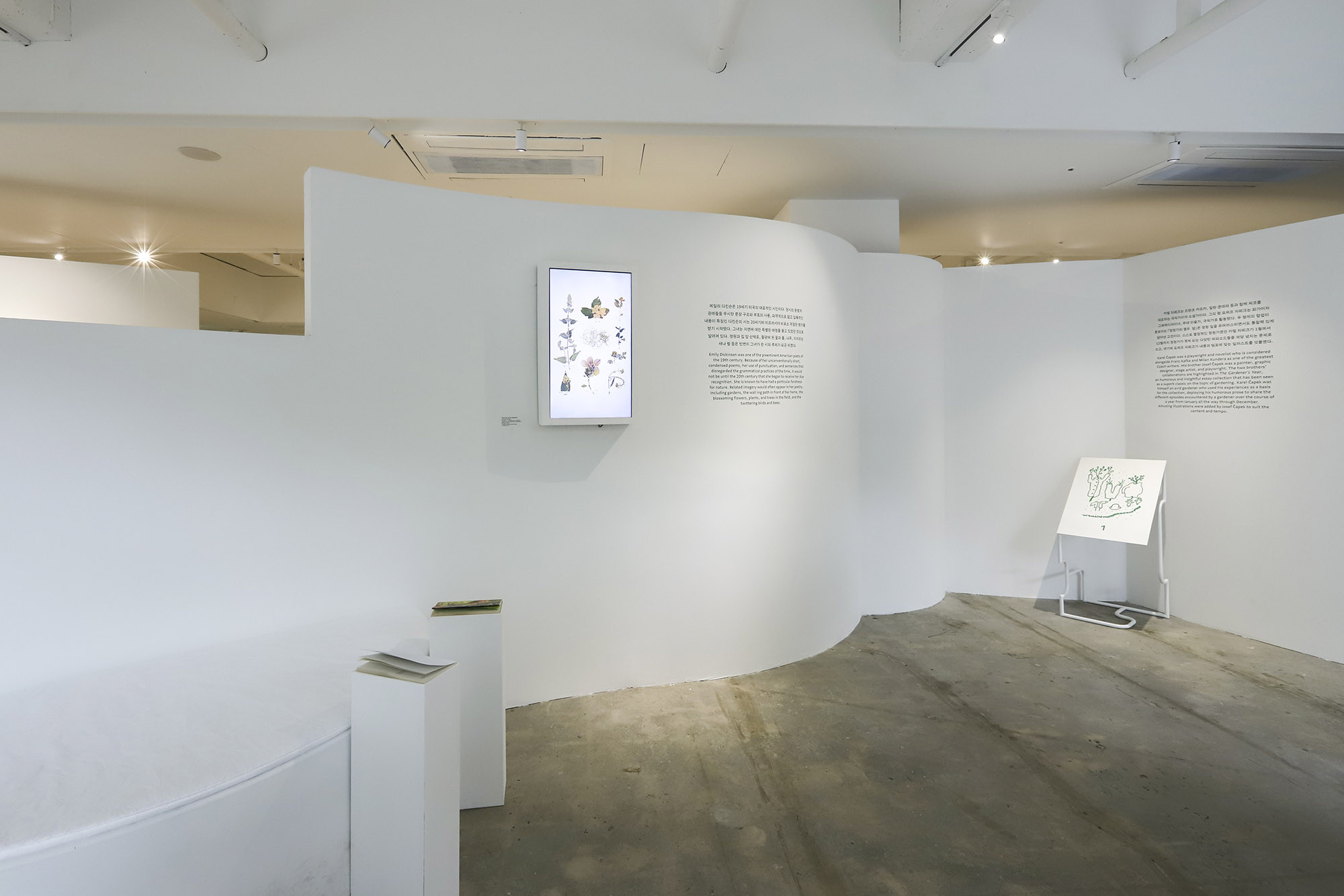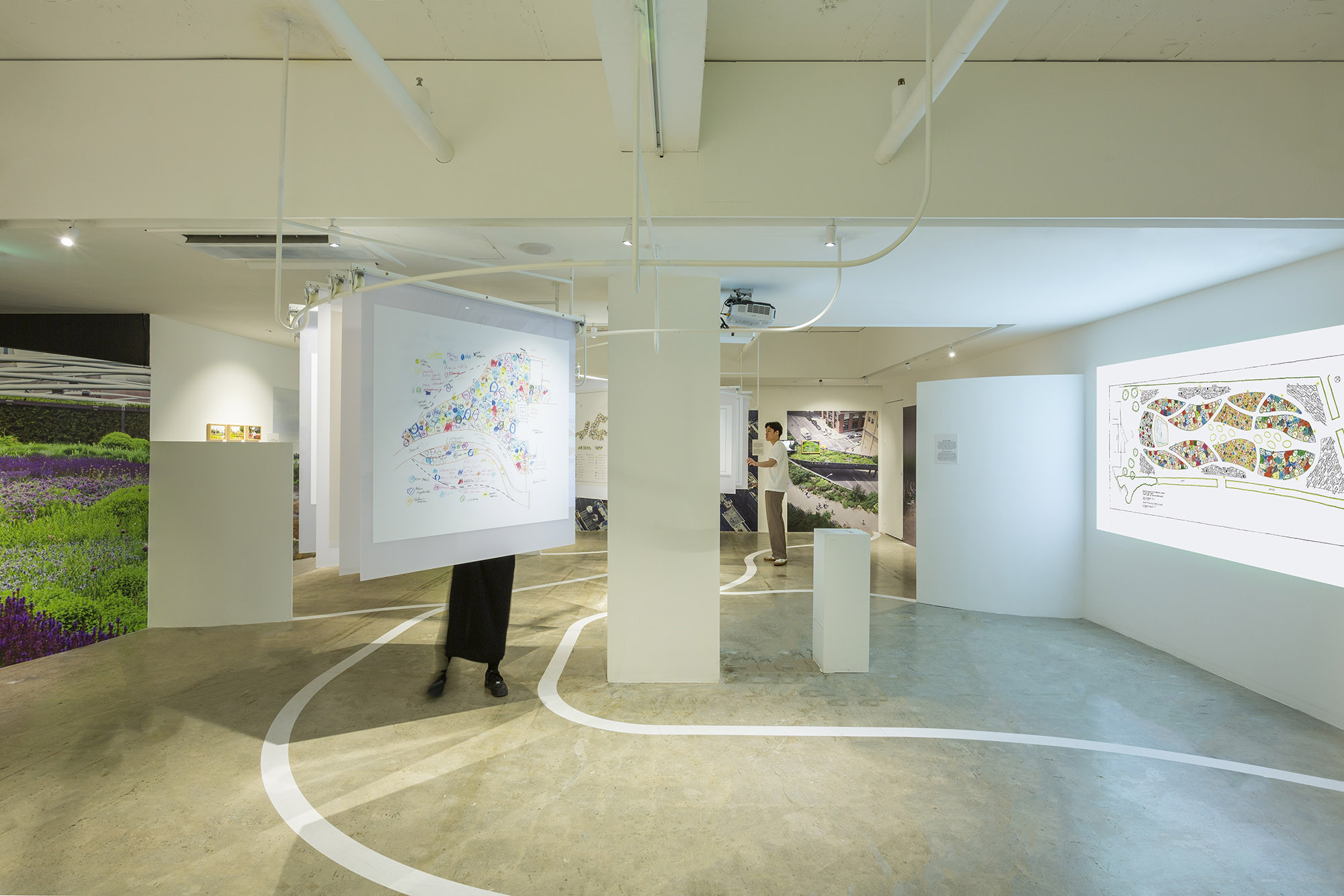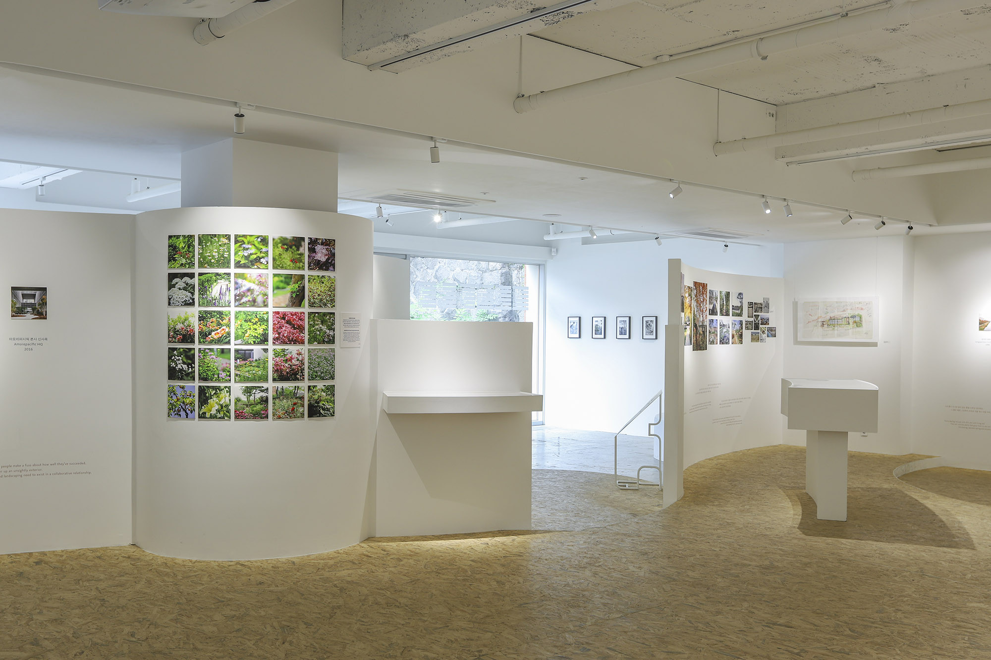 We designed the second-floor space for the 'Gardeners' exhibition held at the PIKNIC exhibition hall located on Namsan Mountain. The second floor served as an archival space for tools, drawings, photos, videos, and other items related to the work of the gardeners. The layout of PIKNIC's second floor posed challenges due to the combination of large and small spaces, as well as corridors. Particularly, the linear arrangement of the floor plan did not align well with the exhibition theme. Fortunately, the floor drawings by participating artist Piet Oudolf provided valuable reference points to address these issues. Following Piet Oudolf's floor plan, we organically divided the space and assigned specific purposes to each section. Areas without the need for walls were designed to seamlessly integrate with the floor, and structures appropriately suspended from the ceiling were also incorporated into the design.