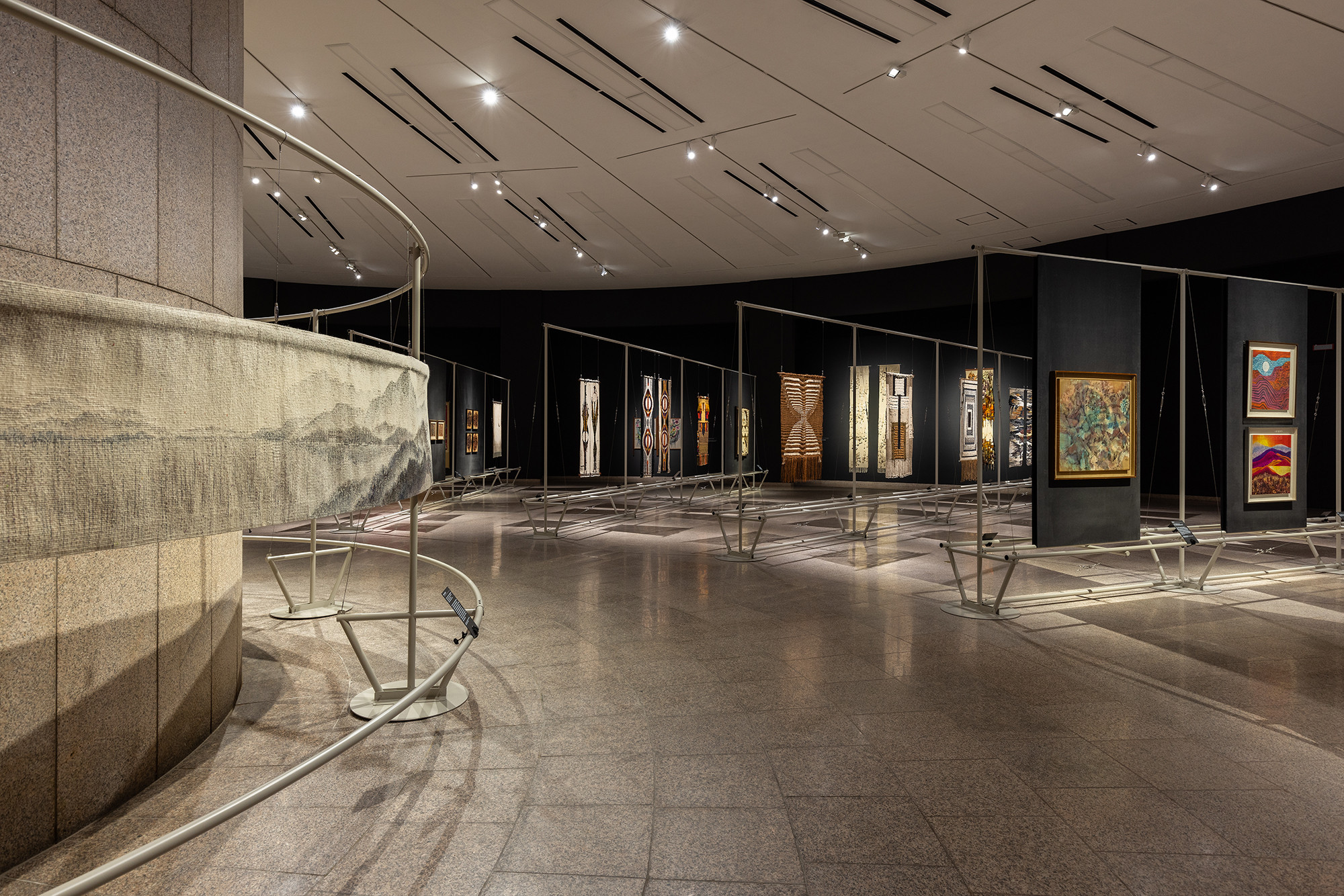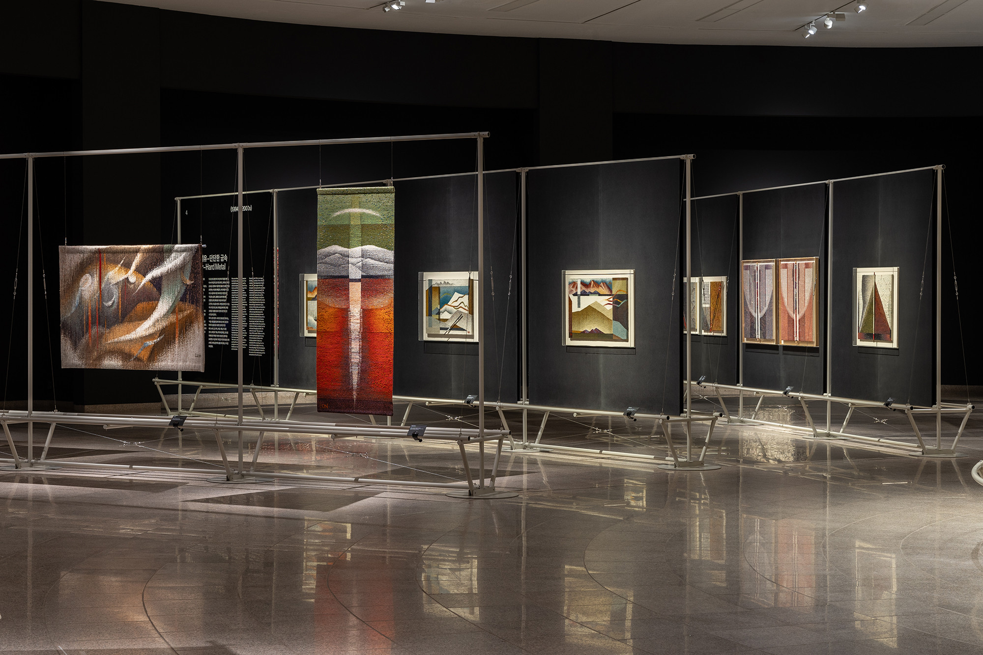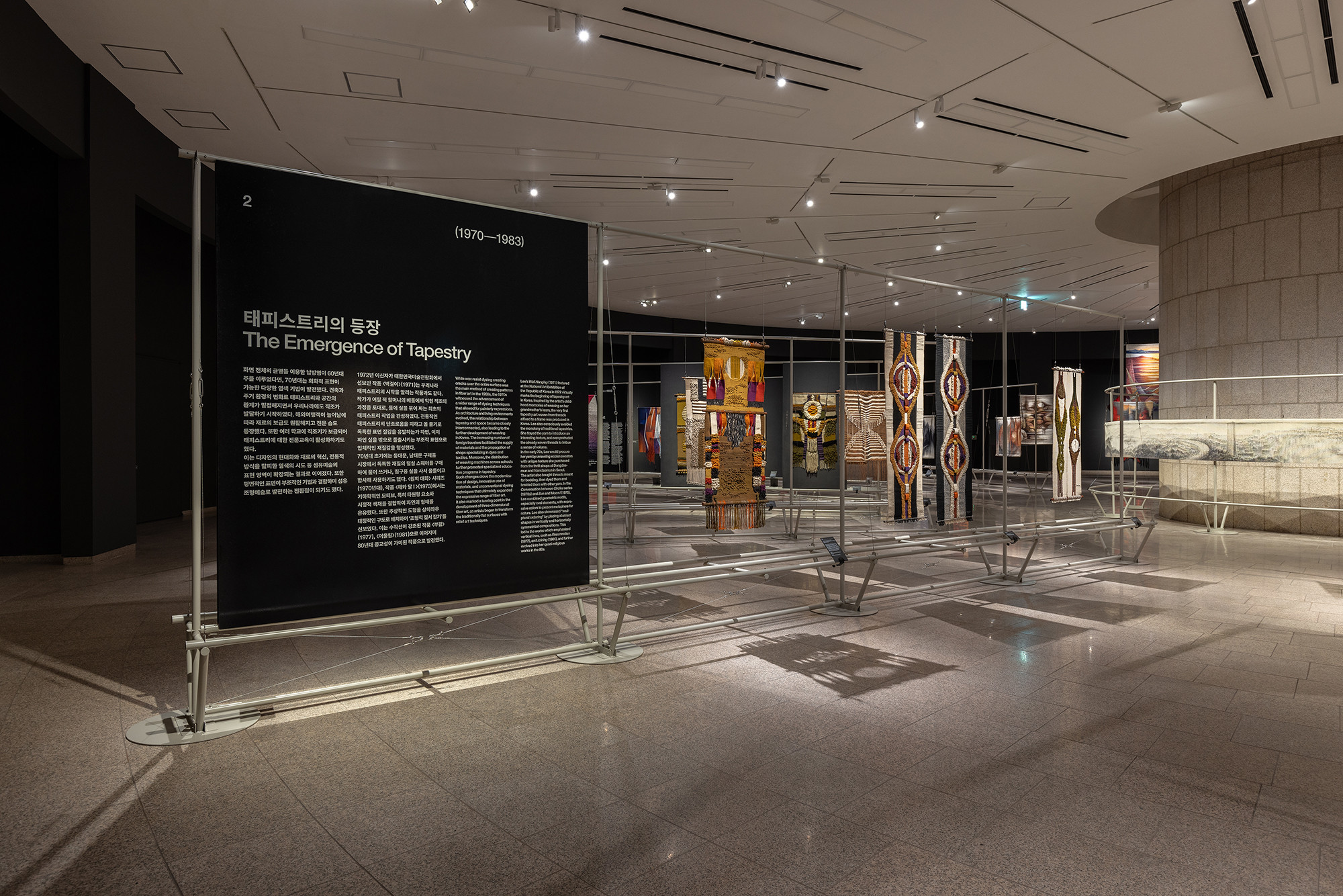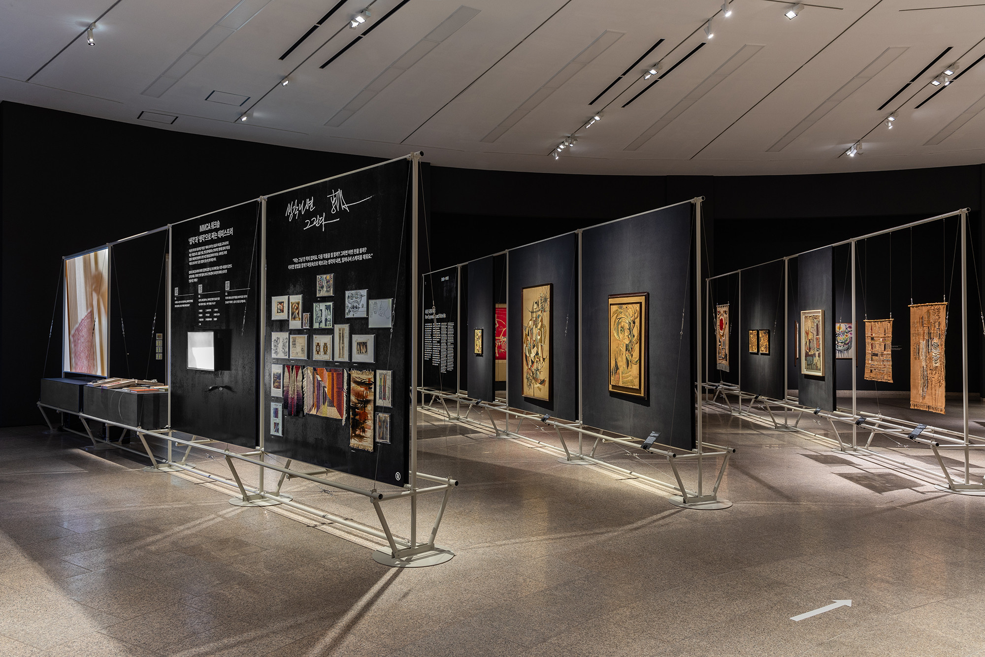 The project is for the work of Korean tapestry artist Shinja Lee. The goal of the project was to provide a detailed appreciation of both the front and back of a large number of tapestry works. The hanger is designed to allow for the arrangement of works of various sizes in harmony, facilitating the appreciation of both the front and back. Standardized columns and pipes were repeatedly used to reduce costs and maintain a consistent morphological language. Additionally, a pipe was added at the bottom for structural stability and functionality, enabling the structure itself to serve as the guard line. For efficient arrangement of the works, the space was composed in a radial shape, and in the case of a 30m-wide piece, it was placed to wrap around the circular elevator box.
