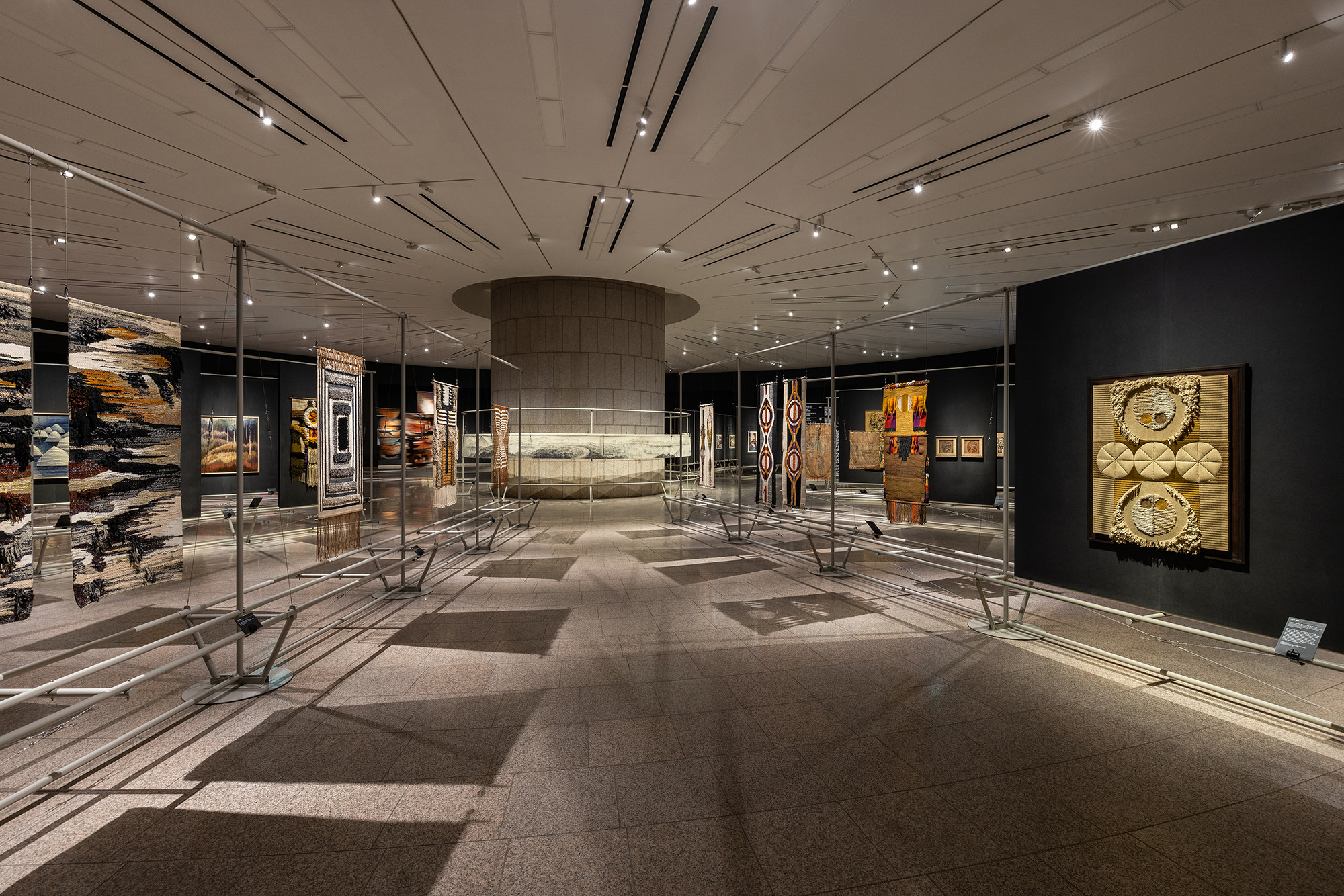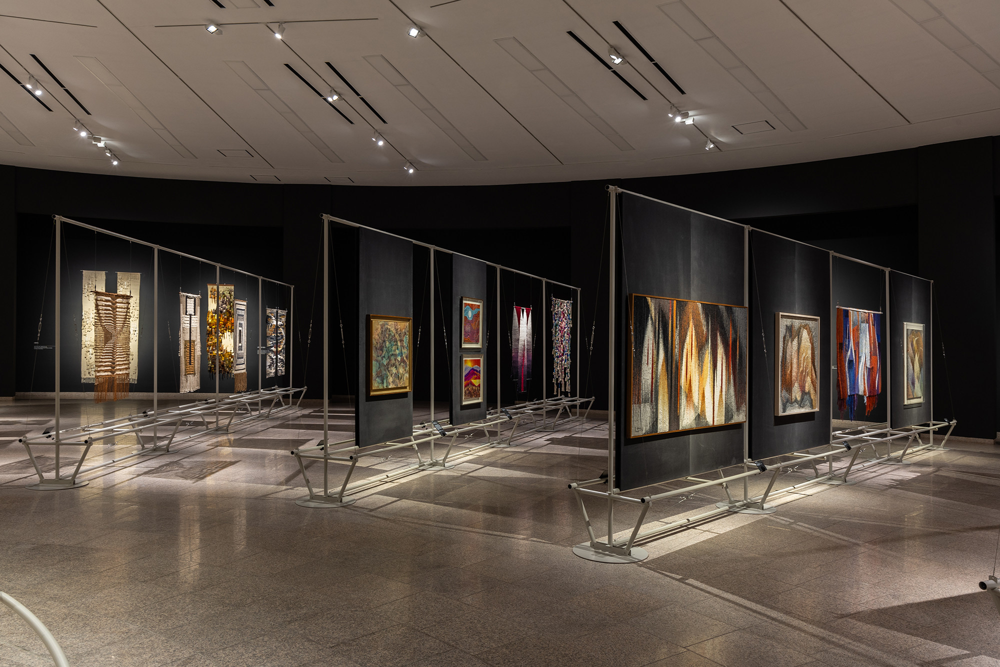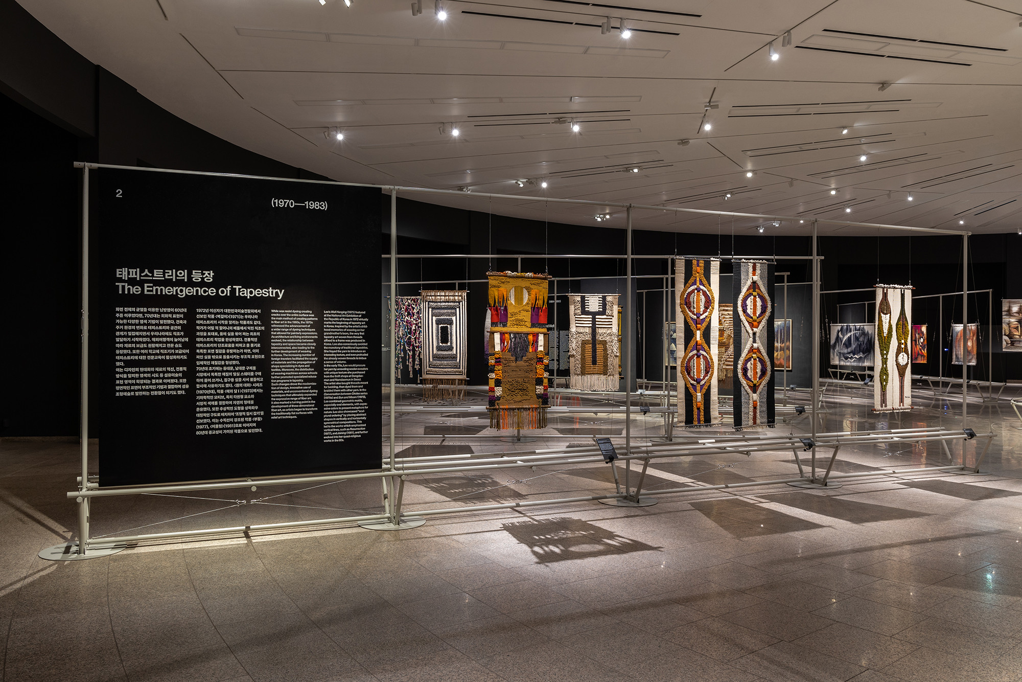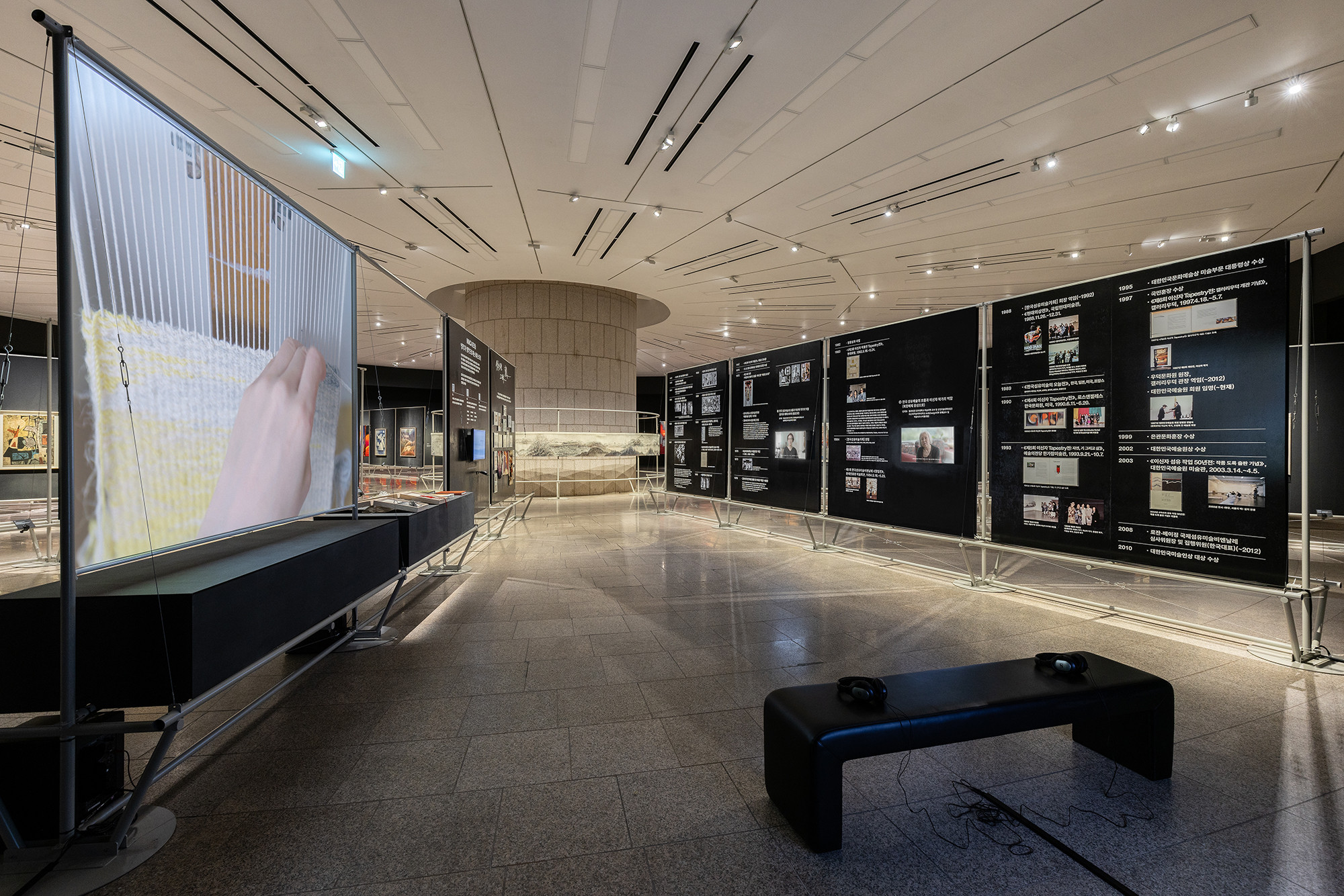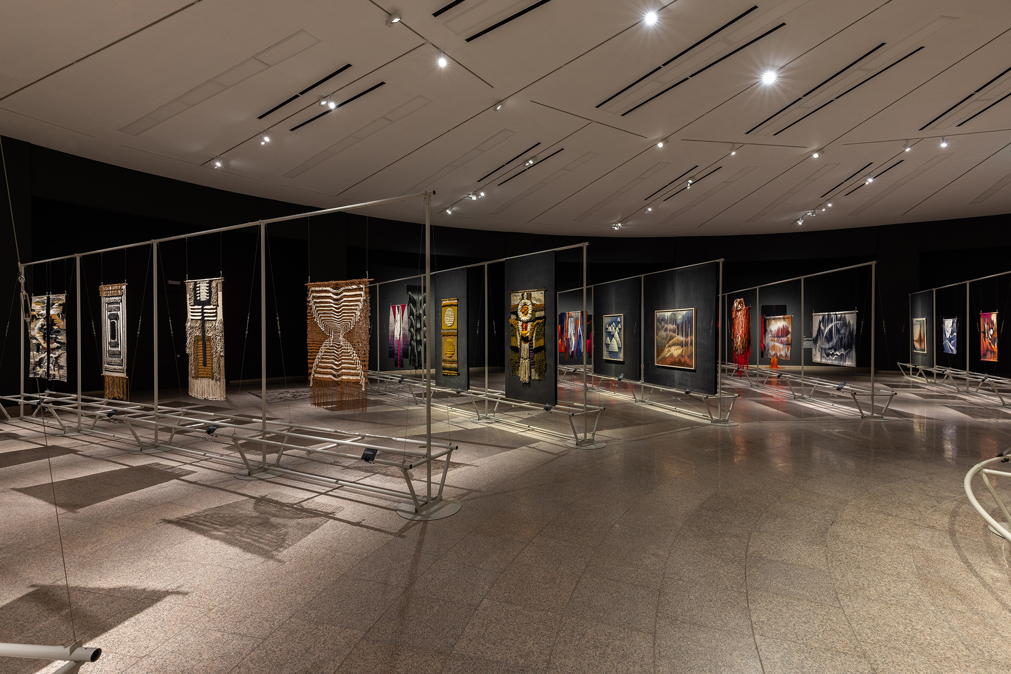 The project is for the work of Korean tapestry artist Shinja Lee. The goal of the project was to provide a detailed appreciation of both the front and back of a large number of tapestry works. The hanger is designed to allow for the arrangement of works of various sizes in harmony, facilitating the appreciation of both the front and back. Standardized columns and pipes were repeatedly used to reduce costs and maintain a consistent morphological language. Additionally, a pipe was added at the bottom for structural stability and functionality, enabling the structure itself to serve as the guard line. For efficient arrangement of the works, the space was composed in a radial shape, and in the case of a 30m-wide piece, it was placed to wrap around the circular elevator box.