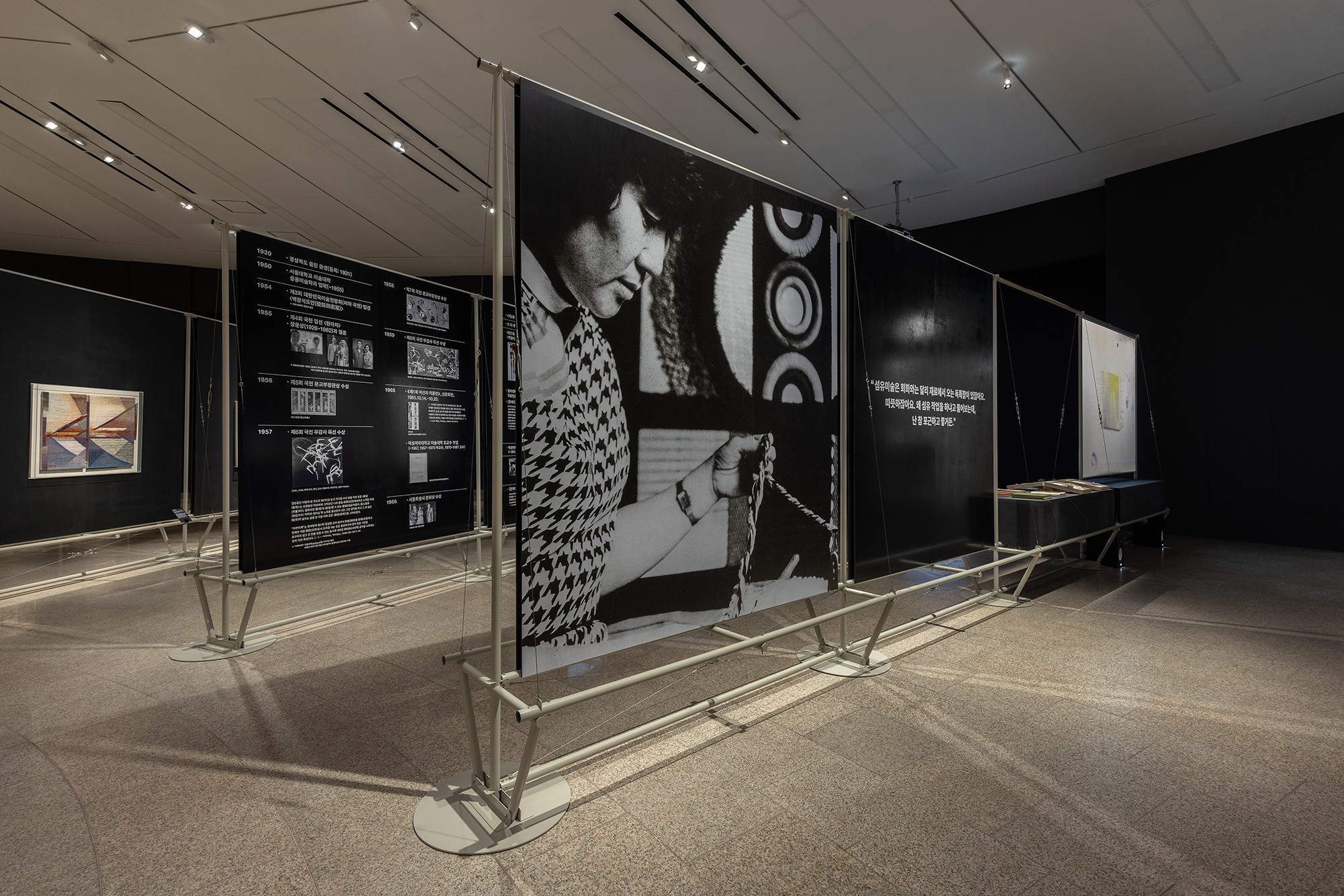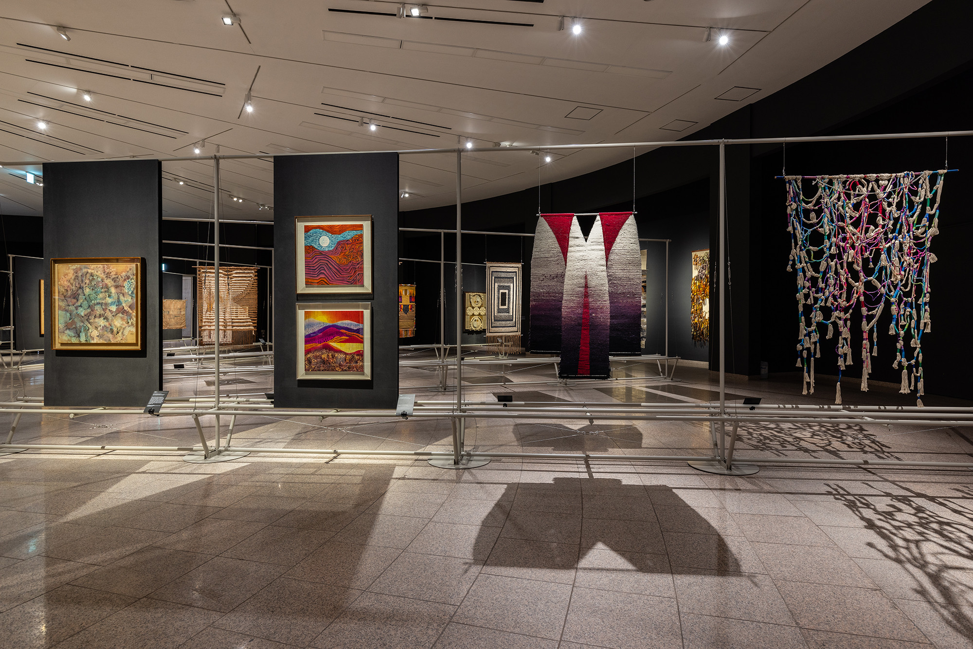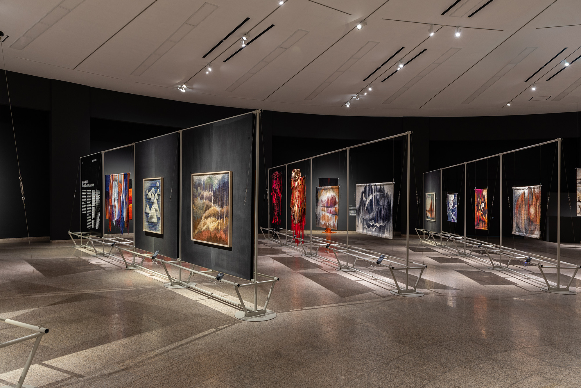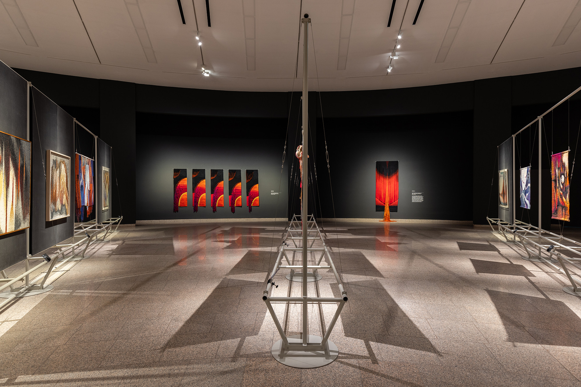 The project is for the work of Korean tapestry artist Shinja Lee. The goal of the project was to provide a detailed appreciation of both the front and back of a large number of tapestry works. The hanger is designed to allow for the arrangement of works of various sizes in harmony, facilitating the appreciation of both the front and back. Standardized columns and pipes were repeatedly used to reduce costs and maintain a consistent morphological language. Additionally, a pipe was added at the bottom for structural stability and functionality, enabling the structure itself to serve as the guard line. For efficient arrangement of the works, the space was composed in a radial shape, and in the case of a 30m-wide piece, it was placed to wrap around the circular elevator box.