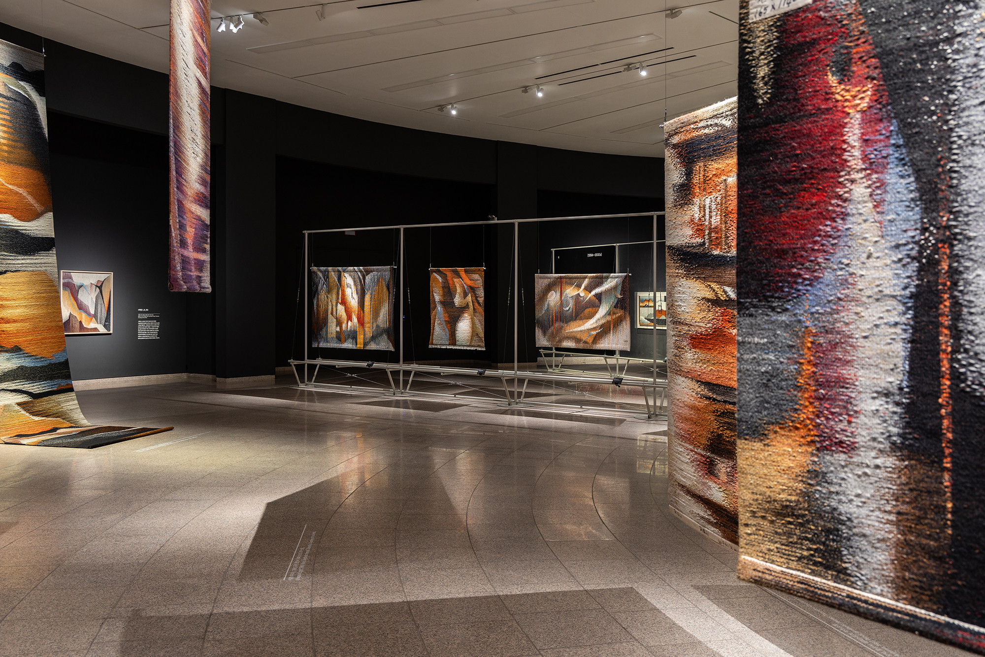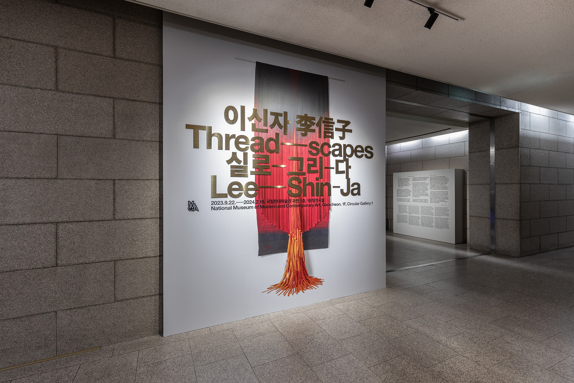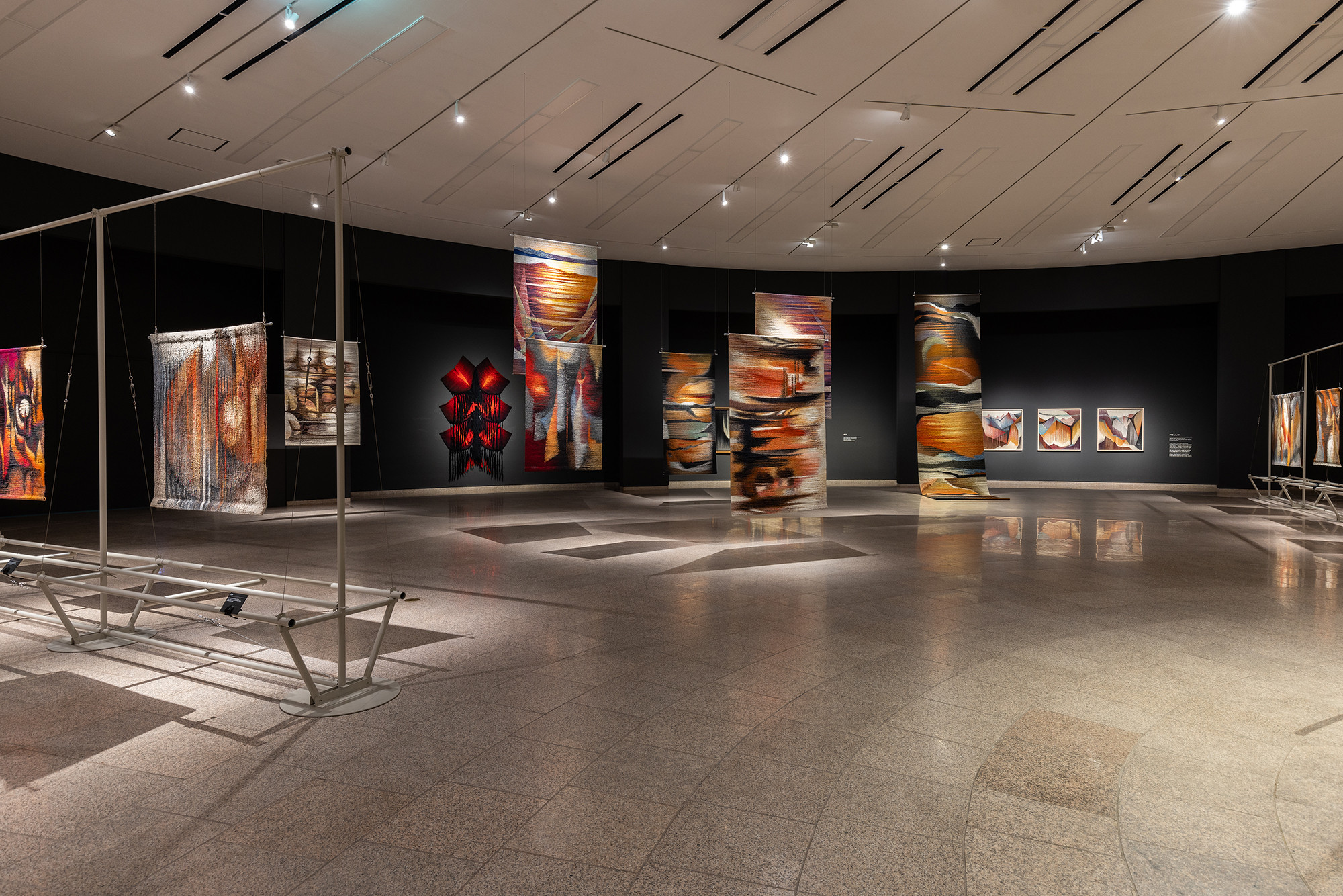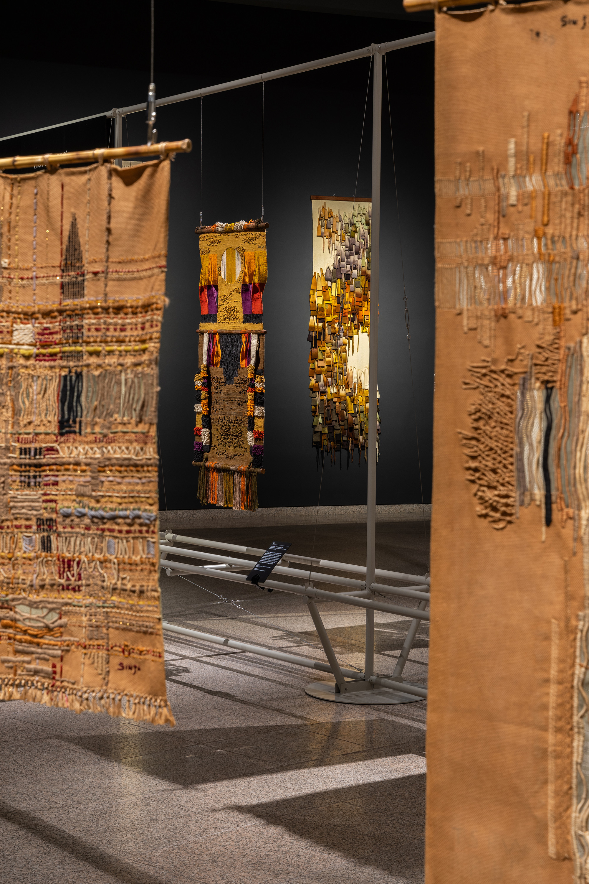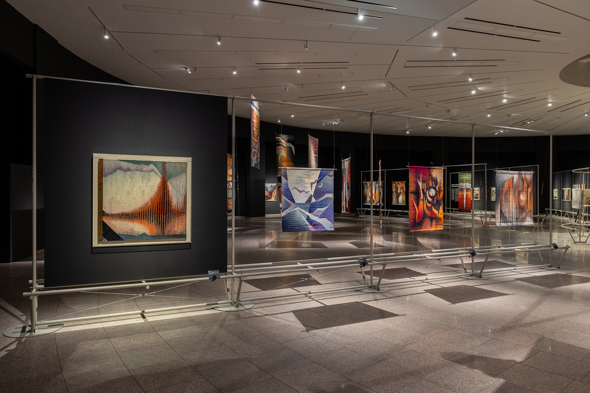 The project is for the work of Korean tapestry artist Shinja Lee. The goal of the project was to provide a detailed appreciation of both the front and back of a large number of tapestry works. The hanger is designed to allow for the arrangement of works of various sizes in harmony, facilitating the appreciation of both the front and back. Standardized columns and pipes were repeatedly used to reduce costs and maintain a consistent morphological language. Additionally, a pipe was added at the bottom for structural stability and functionality, enabling the structure itself to serve as the guard line. For efficient arrangement of the works, the space was composed in a radial shape, and in the case of a 30m-wide piece, it was placed to wrap around the circular elevator box.