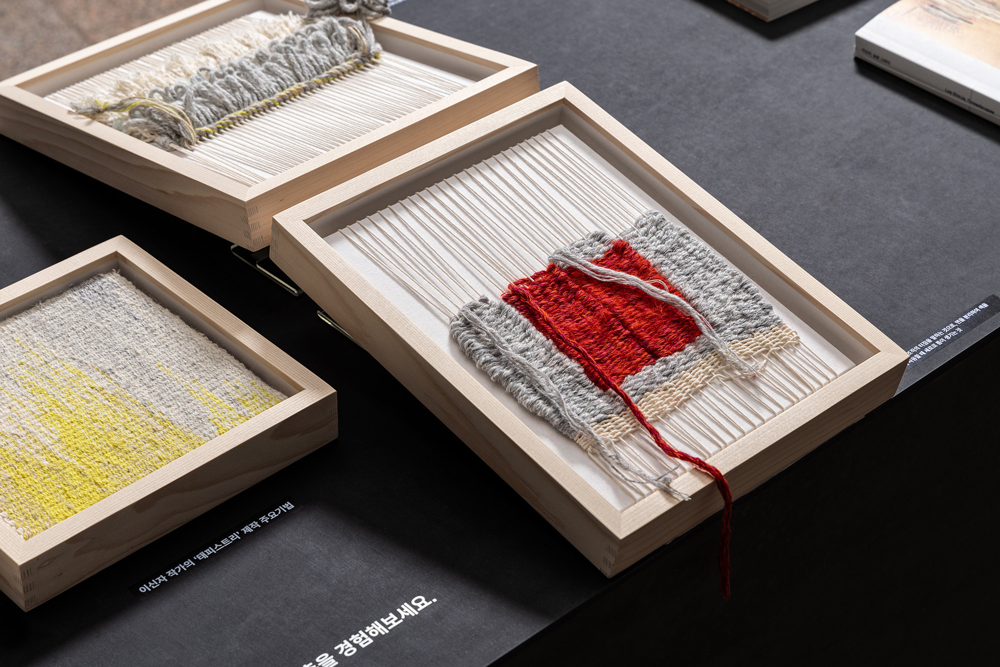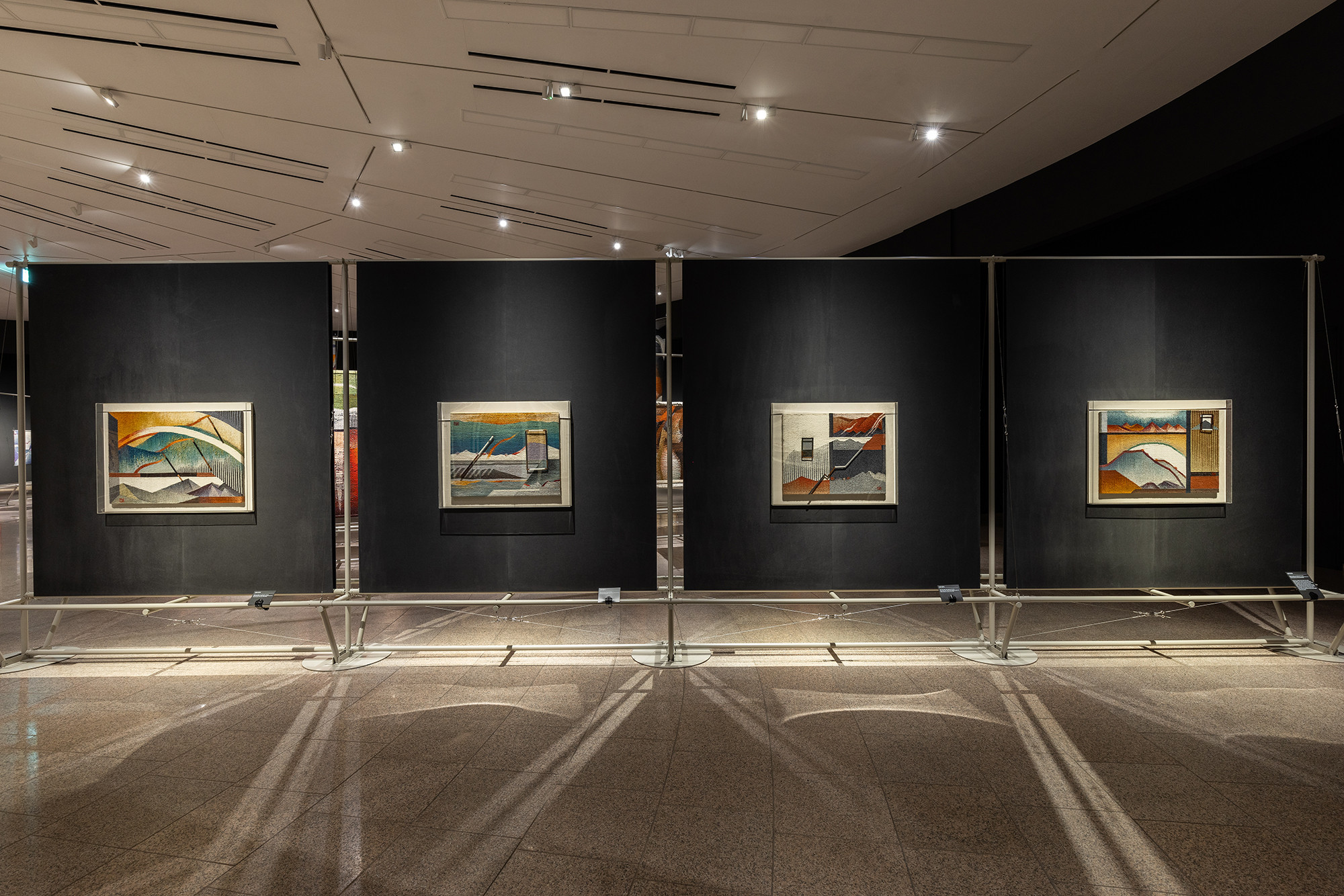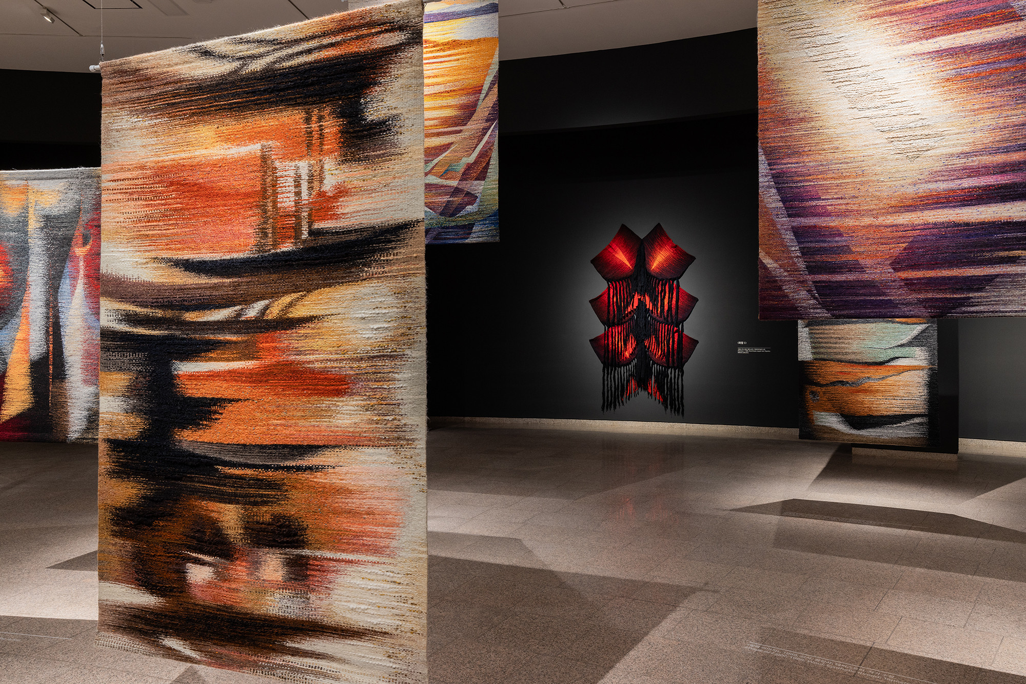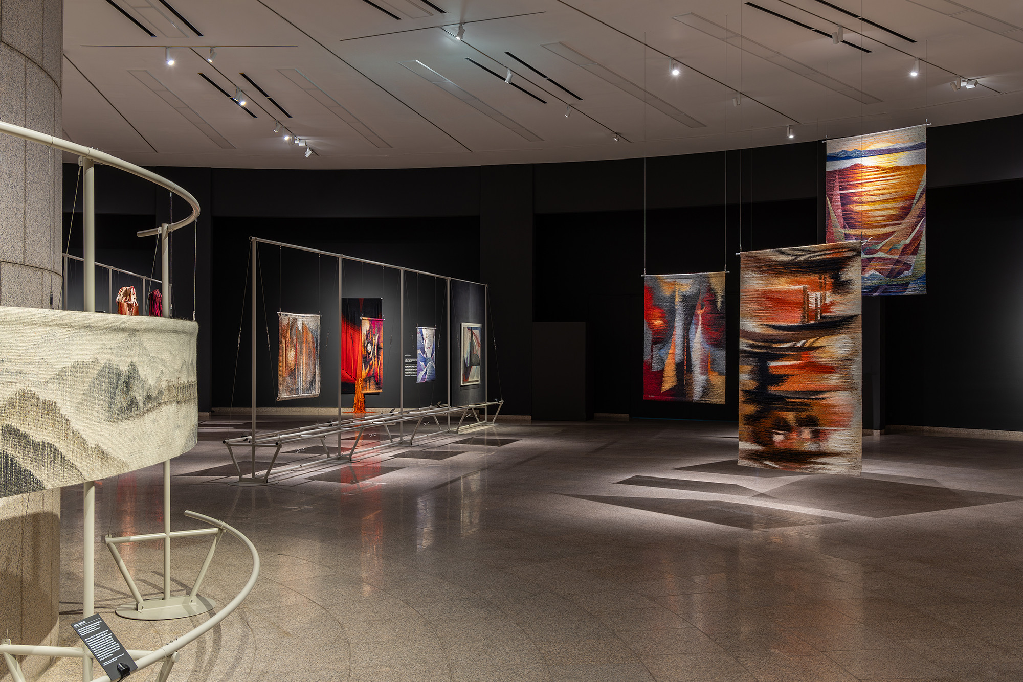 The project is for the work of Korean tapestry artist Shinja Lee. The goal of the project was to provide a detailed appreciation of both the front and back of a large number of tapestry works. The hanger is designed to allow for the arrangement of works of various sizes in harmony, facilitating the appreciation of both the front and back. Standardized columns and pipes were repeatedly used to reduce costs and maintain a consistent morphological language. Additionally, a pipe was added at the bottom for structural stability and functionality, enabling the structure itself to serve as the guard line. For efficient arrangement of the works, the space was composed in a radial shape, and in the case of a 30m-wide piece, it was placed to wrap around the circular elevator box.