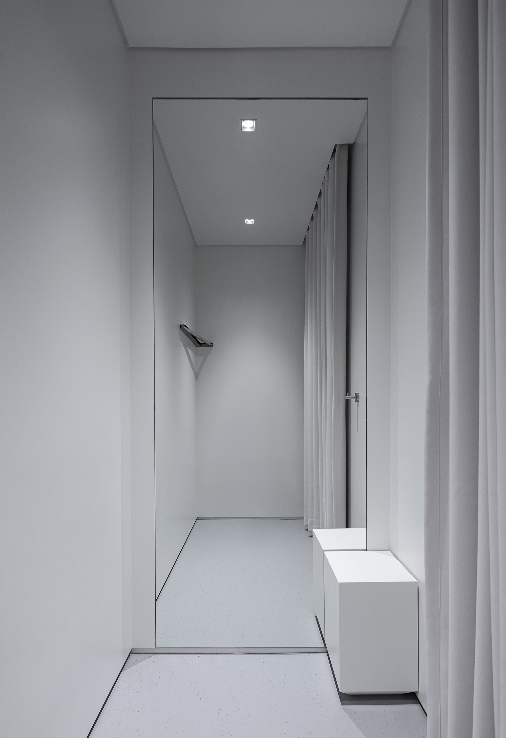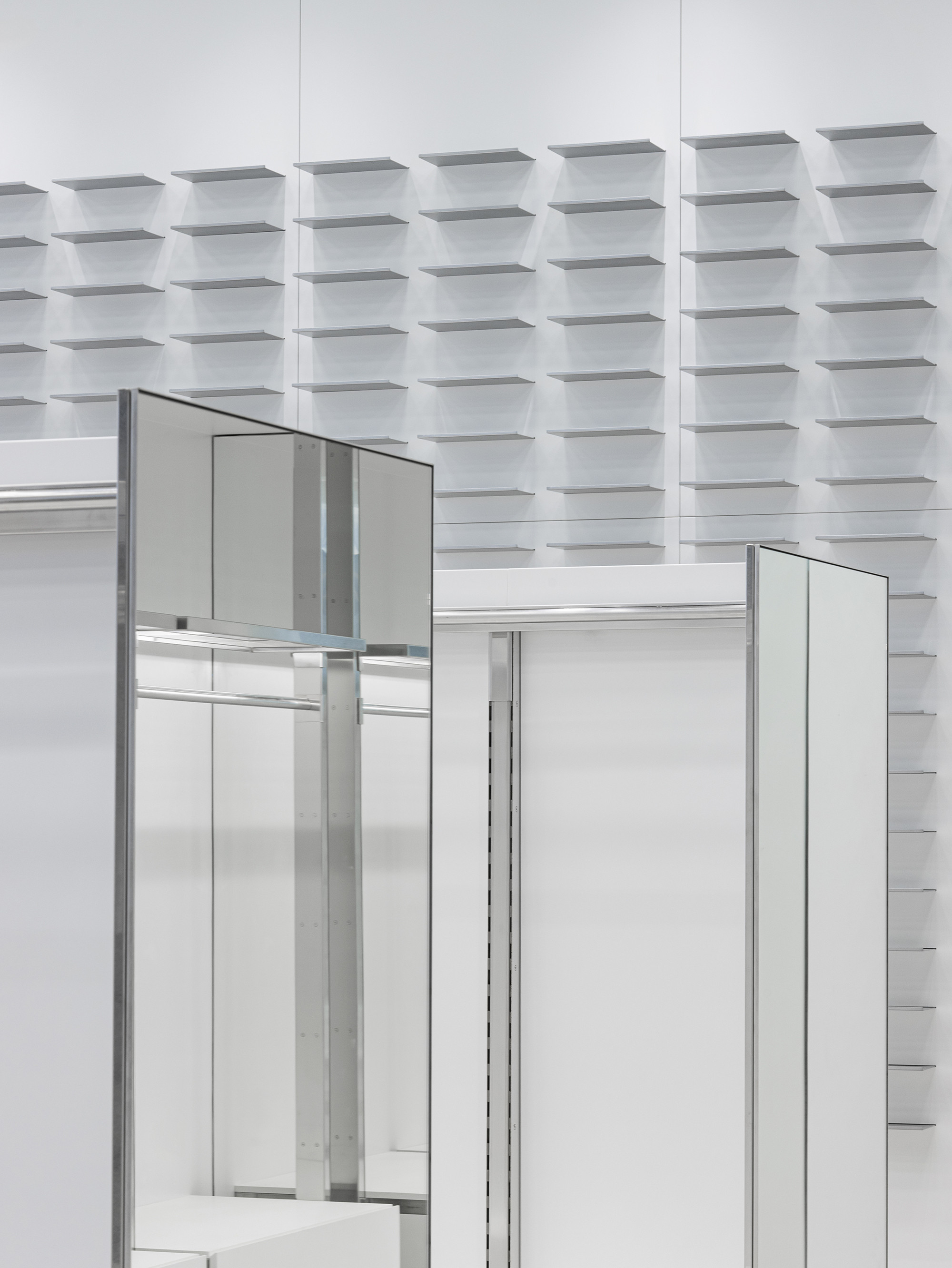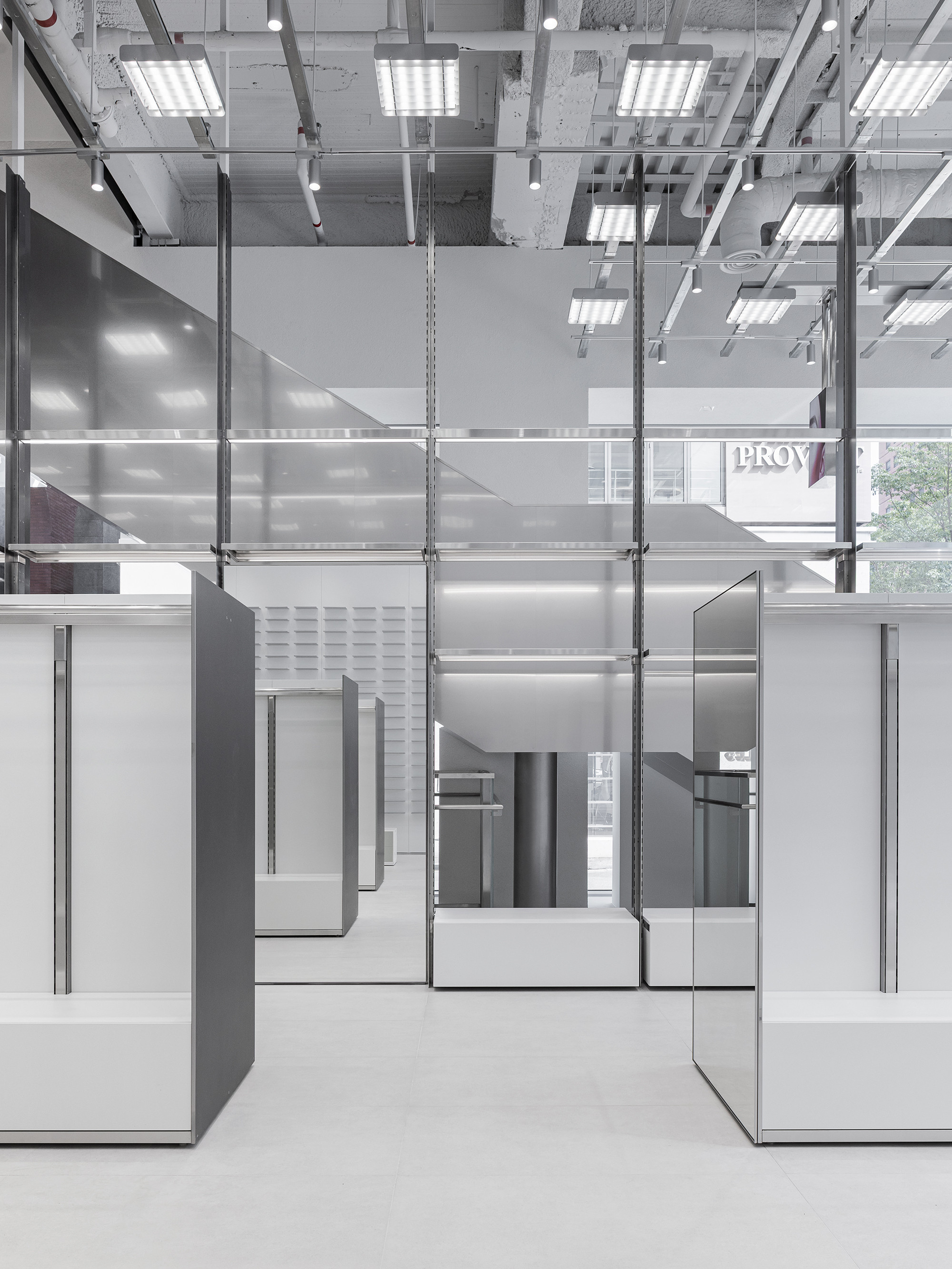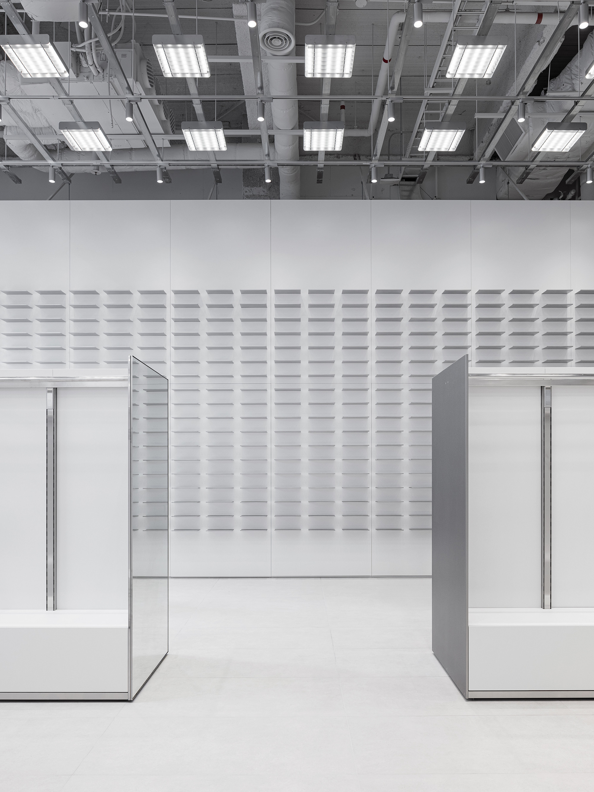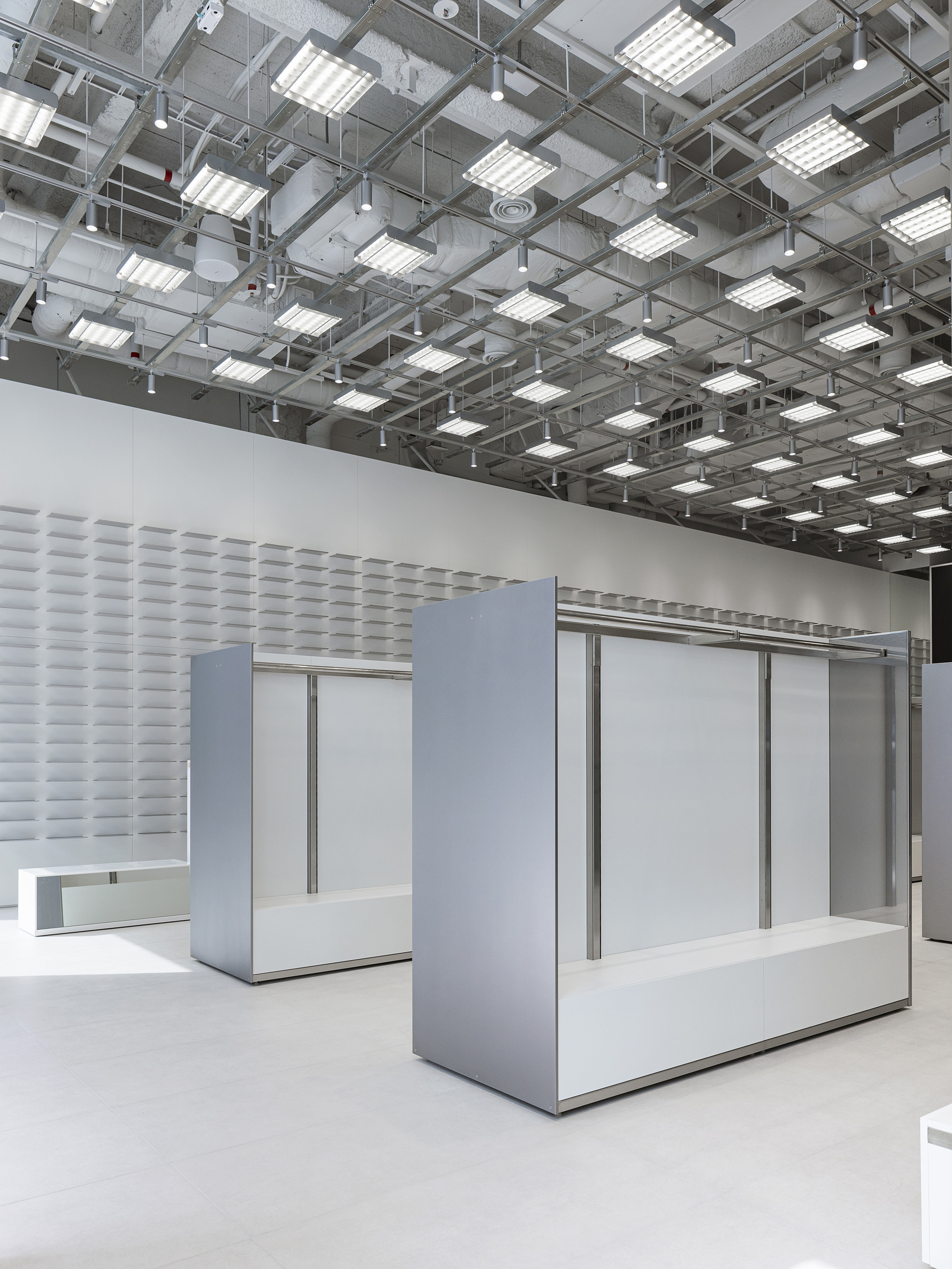 To achieve these objectives, we introduced a 300×300 modular system across the entire store. This framework allowed us to secure a minimum circulation width of 1,200 mm, while ensuring that the repetition of modules did not create a sense of congestion. The result is an intuitive and open floor layout that maintains clarity and spatial fluidity.