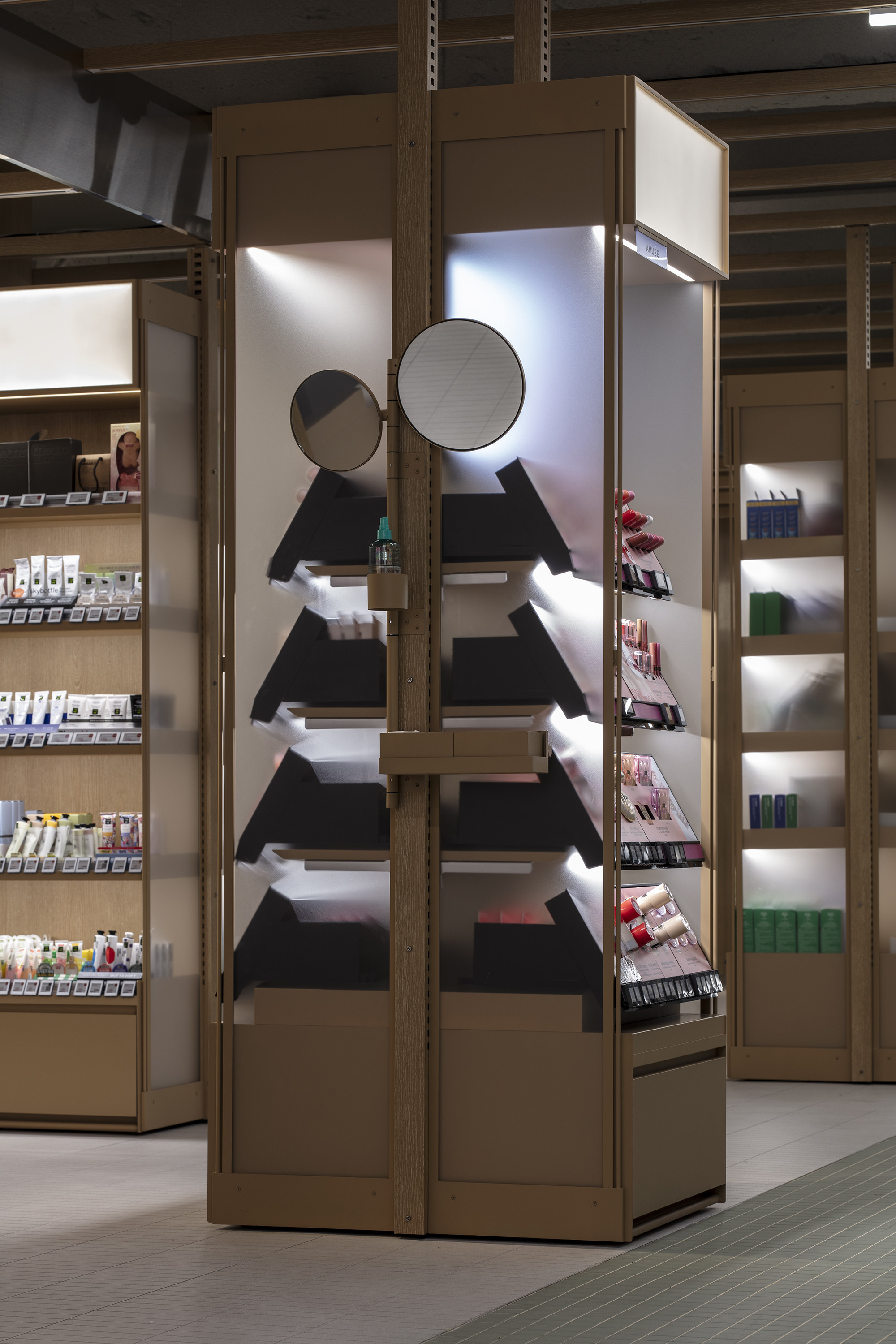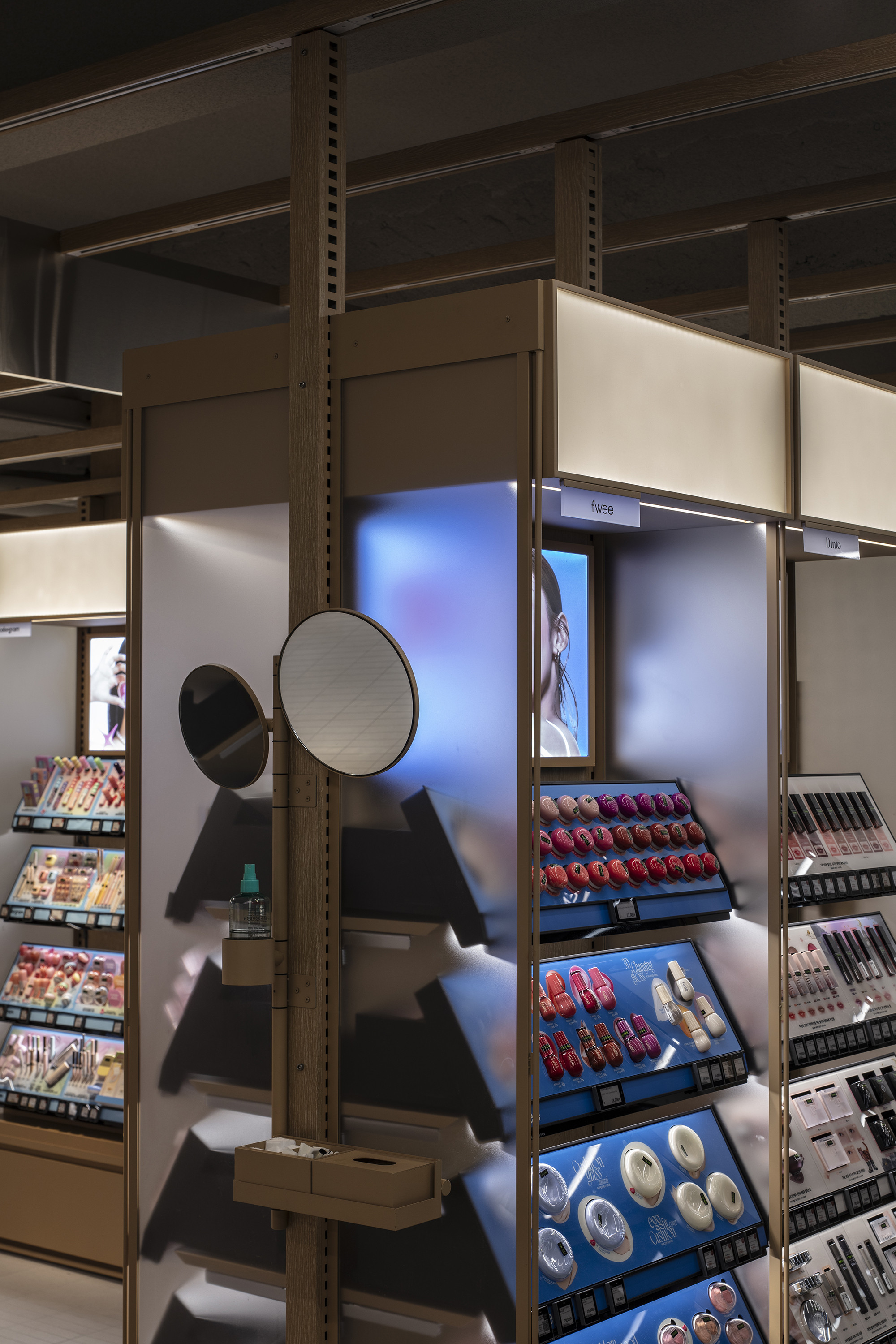 Designing a space that houses various cosmetic brands and products is no easy task. Each brand and product seeks to express its own individuality, making it challenging to arrange and present them in a cohesive and visually appealing way.