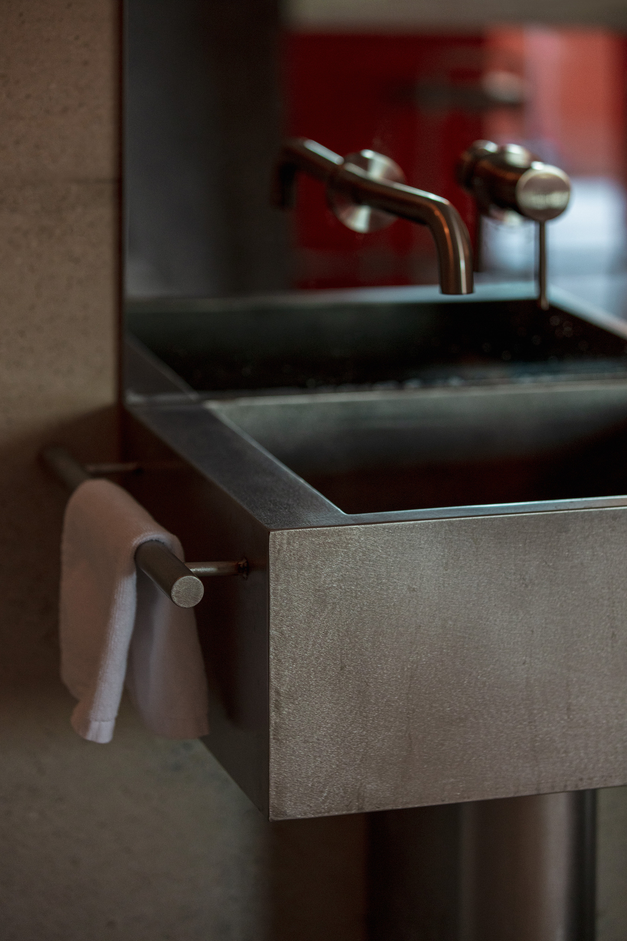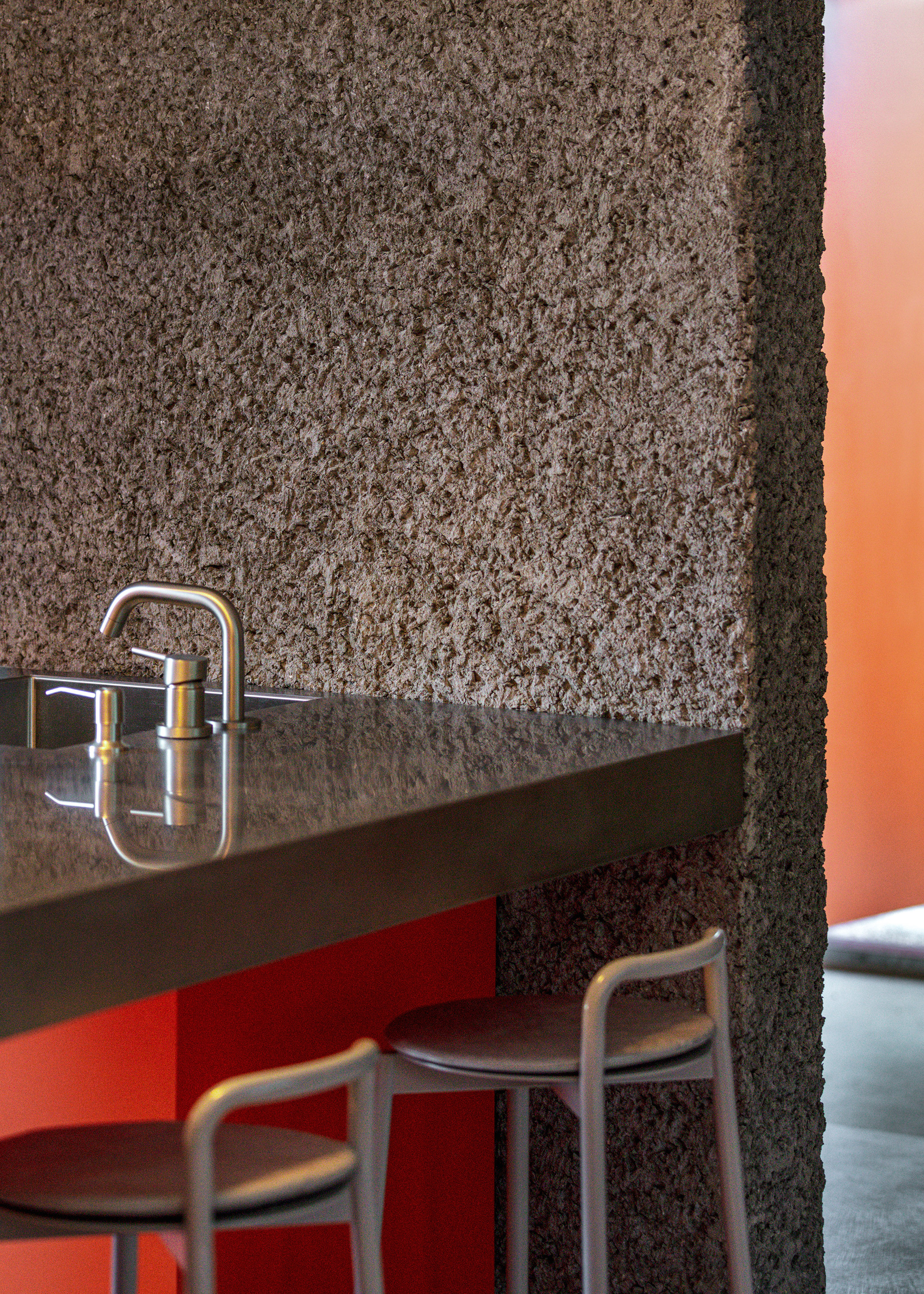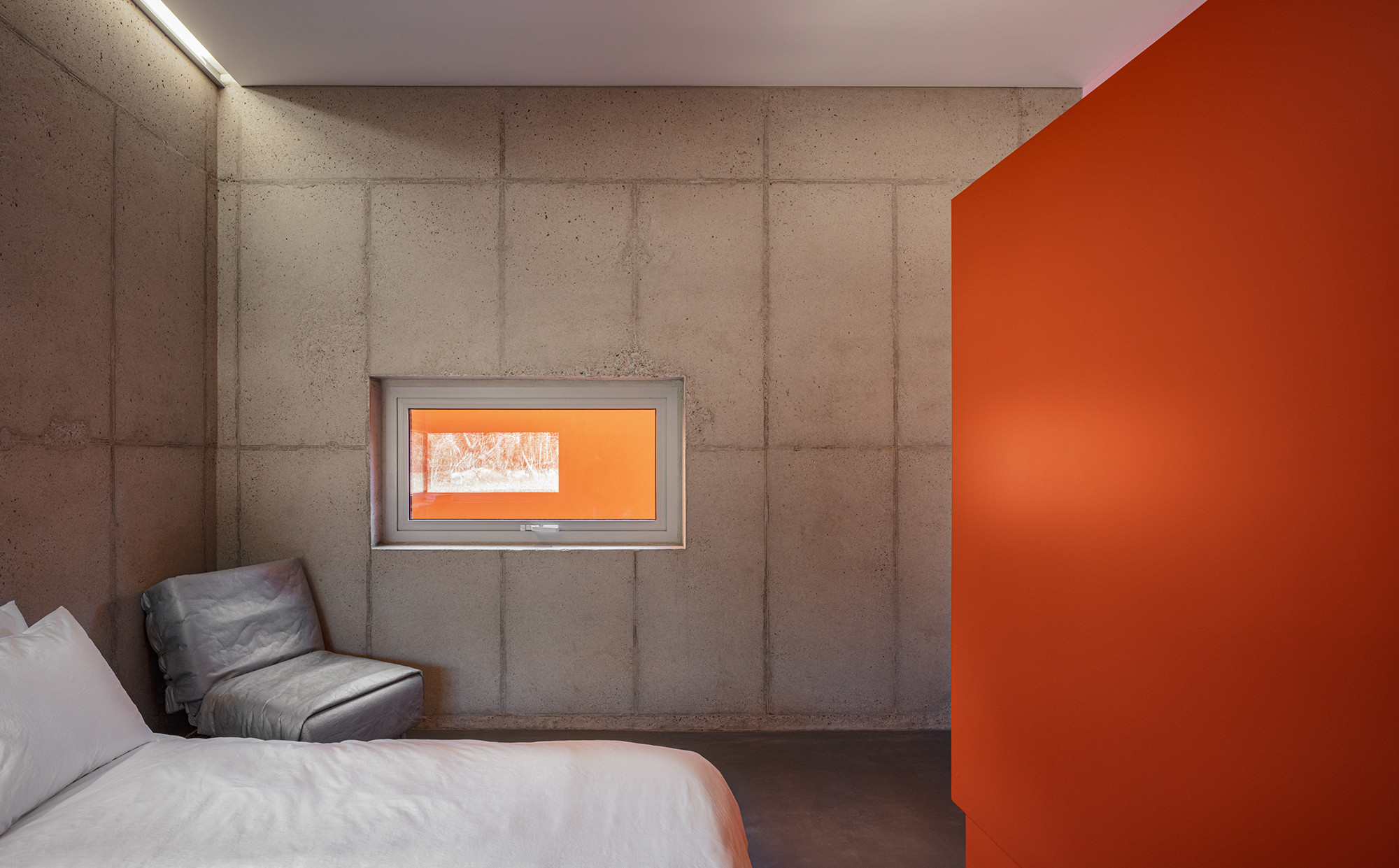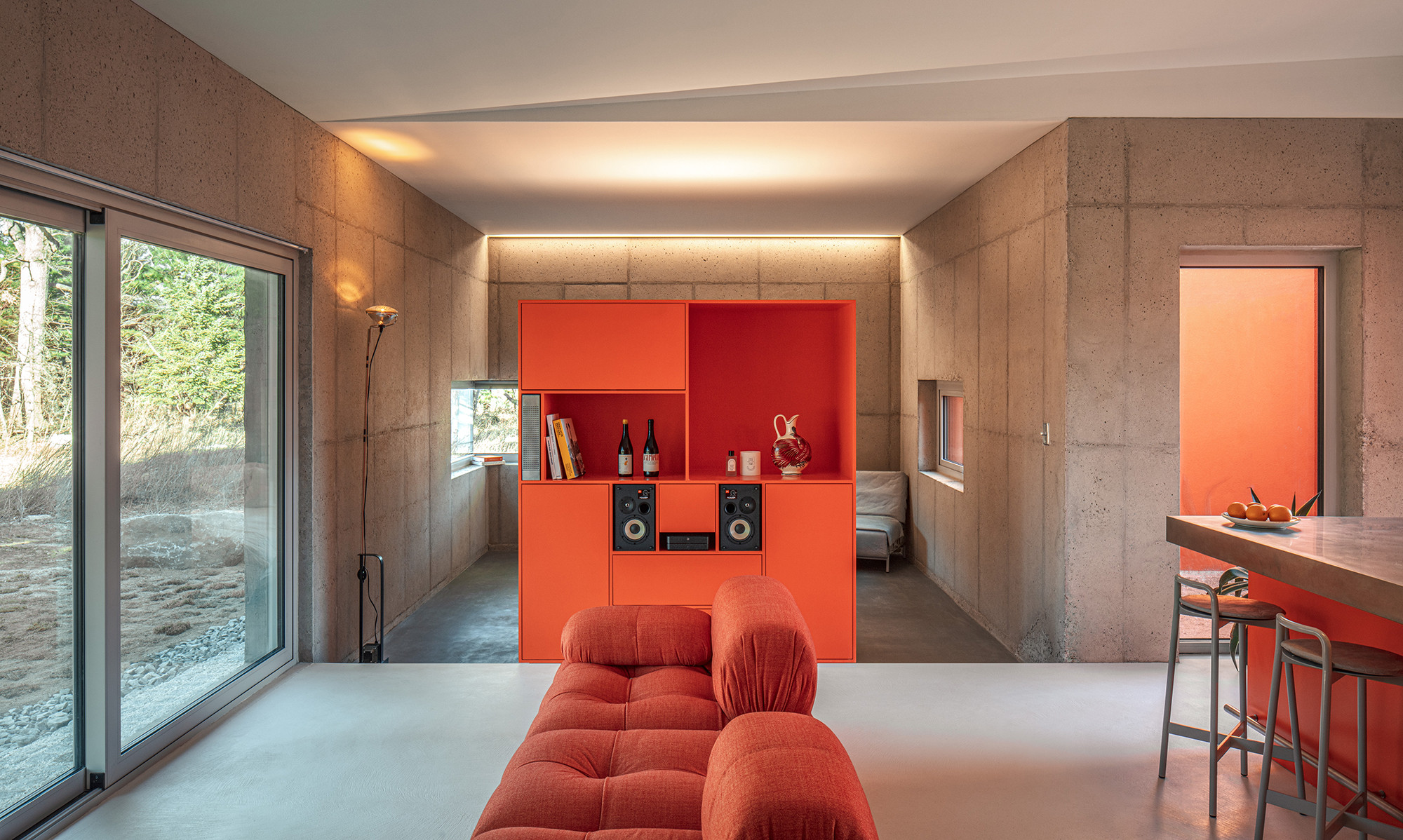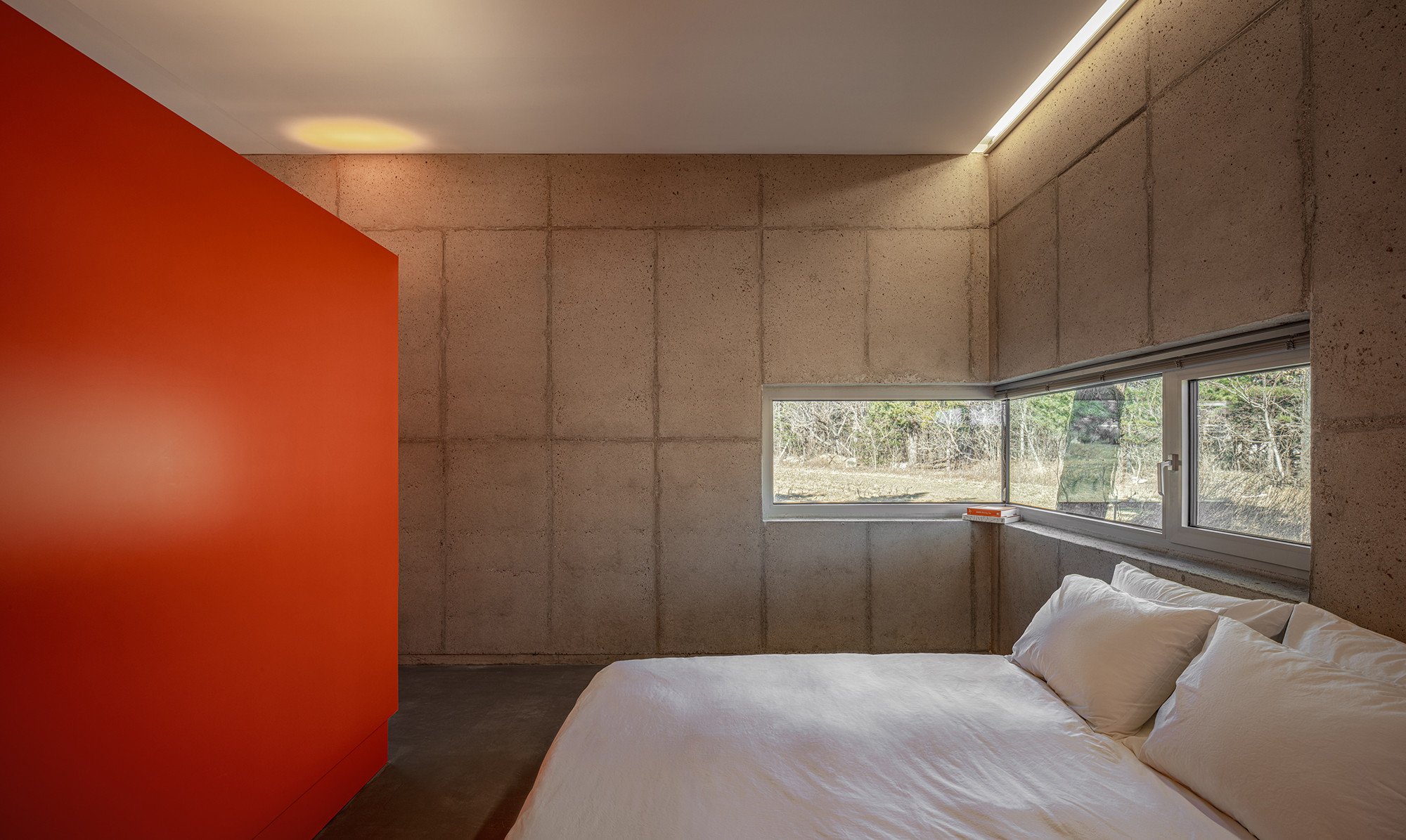 We designed furniture for the 'Orange House' by the architecture firm 'ONE-AFTR'. A cabinet, serving as both an audio cabinet and closet, is placed in the center of the space, potentially acting as a wall to separate the bedroom from the living room. The island-type kitchen, crafted from stainless steel, is designed to function as both a dining table and worktop.