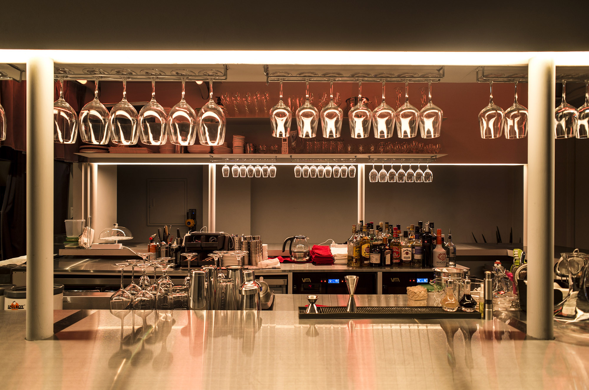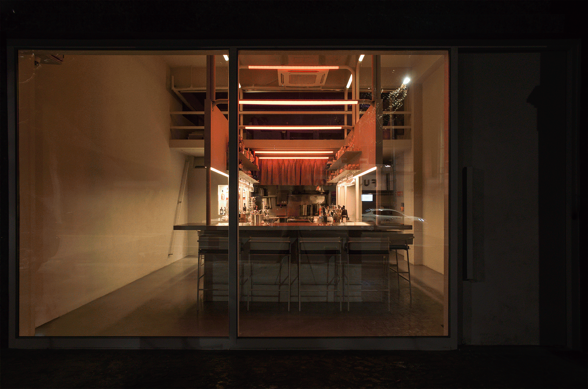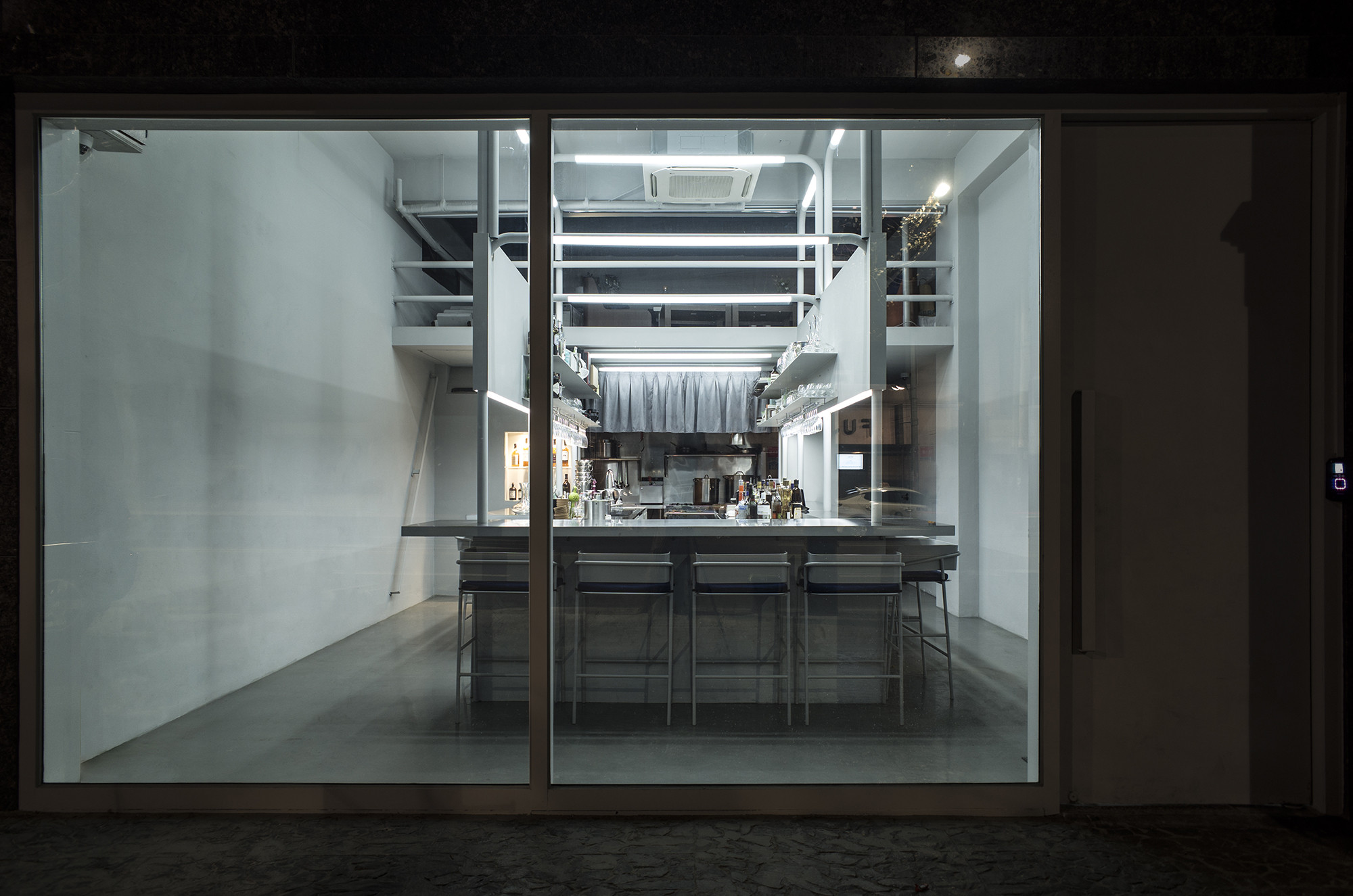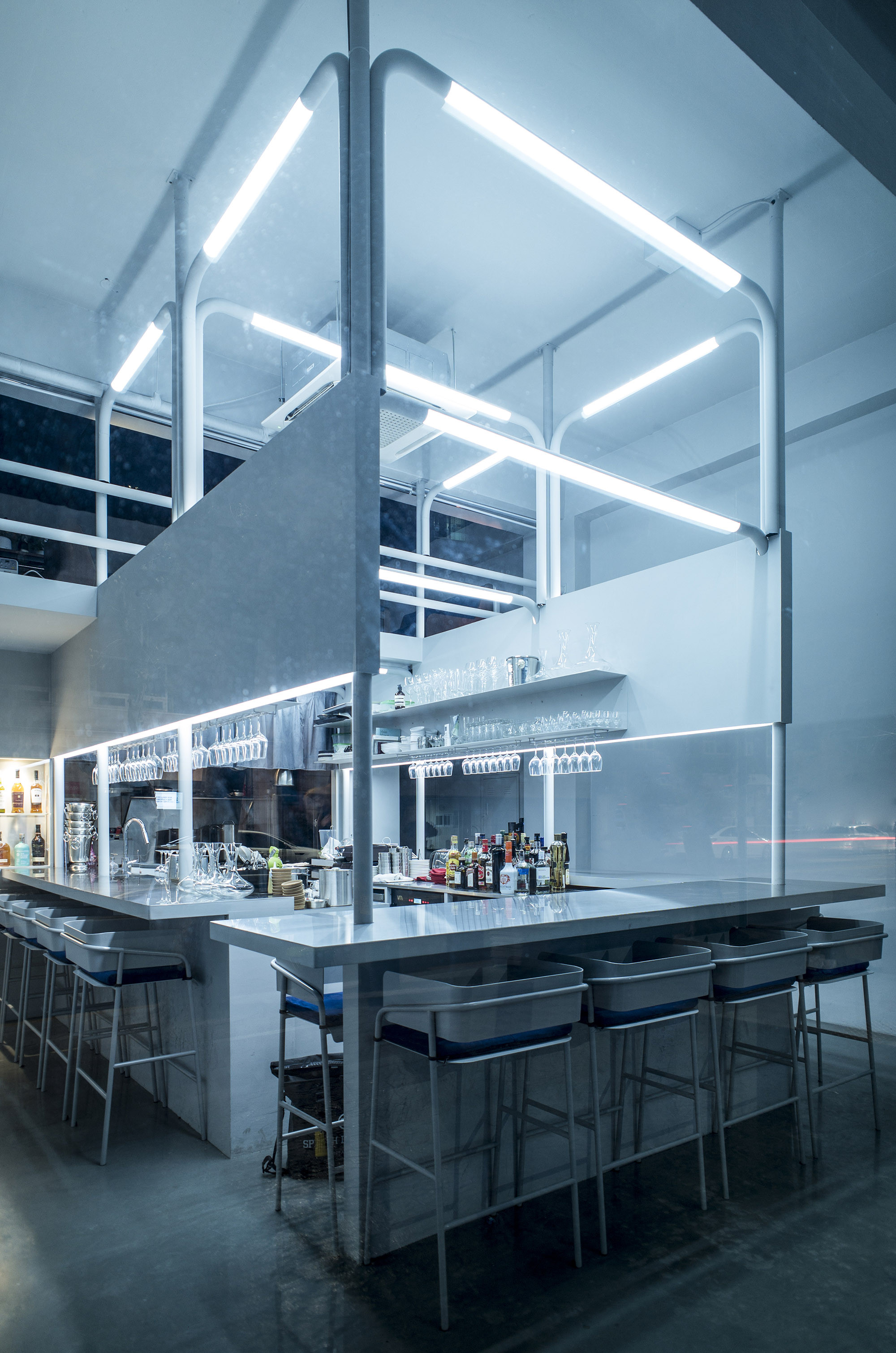 REVEAT is a French restaurant that transitions seamlessly between day and night, catering to diverse atmospheres to match the daily menus and moods. To achieve this, we explored various approaches, including altering the color scheme and adjusting the lighting brightness. Fortunately, we were able to utilize Philips' 'hue' lighting product, allowing us to freely adjust the ambiance. Given the space's high ceilings, we made them the focal point by installing a large structure to evenly distribute changing colors across the ceiling. This pipe-like structure aimed to maintain the grandeur of the space while avoiding any sense of confinement. Additionally, we erected walls ranging from 1500mm to 2400mm in height to ensure guests could enjoy their meals comfortably without feeling overwhelmed by other diners.