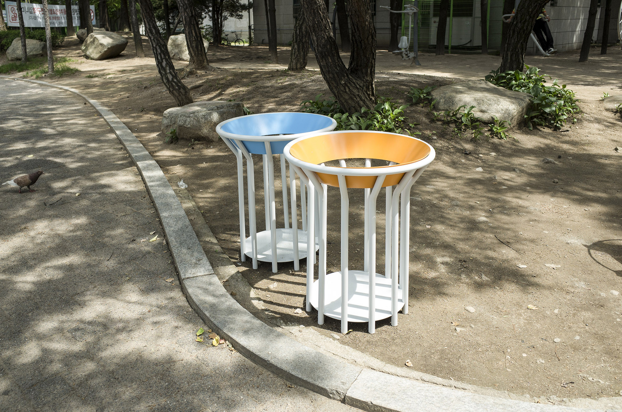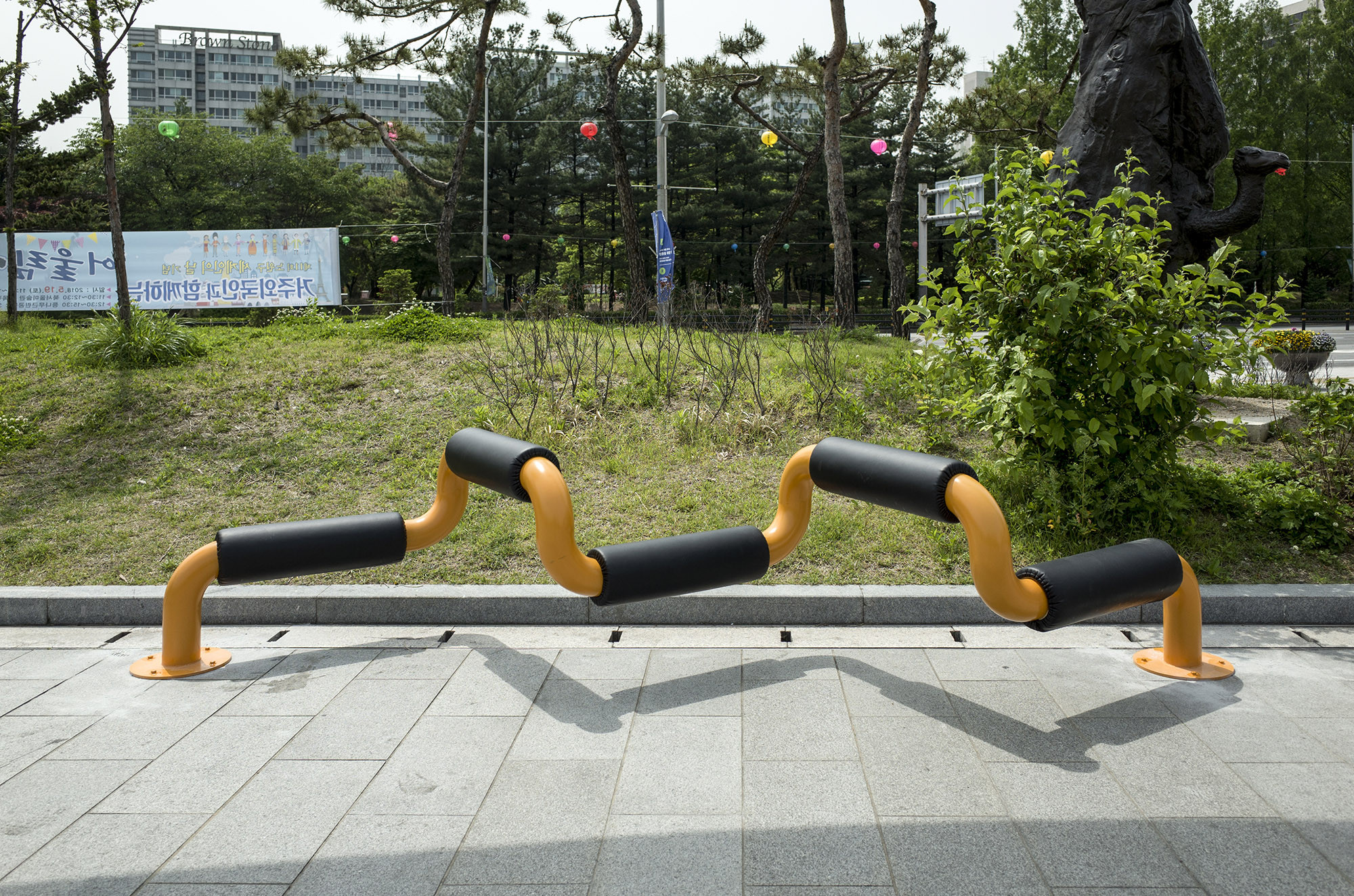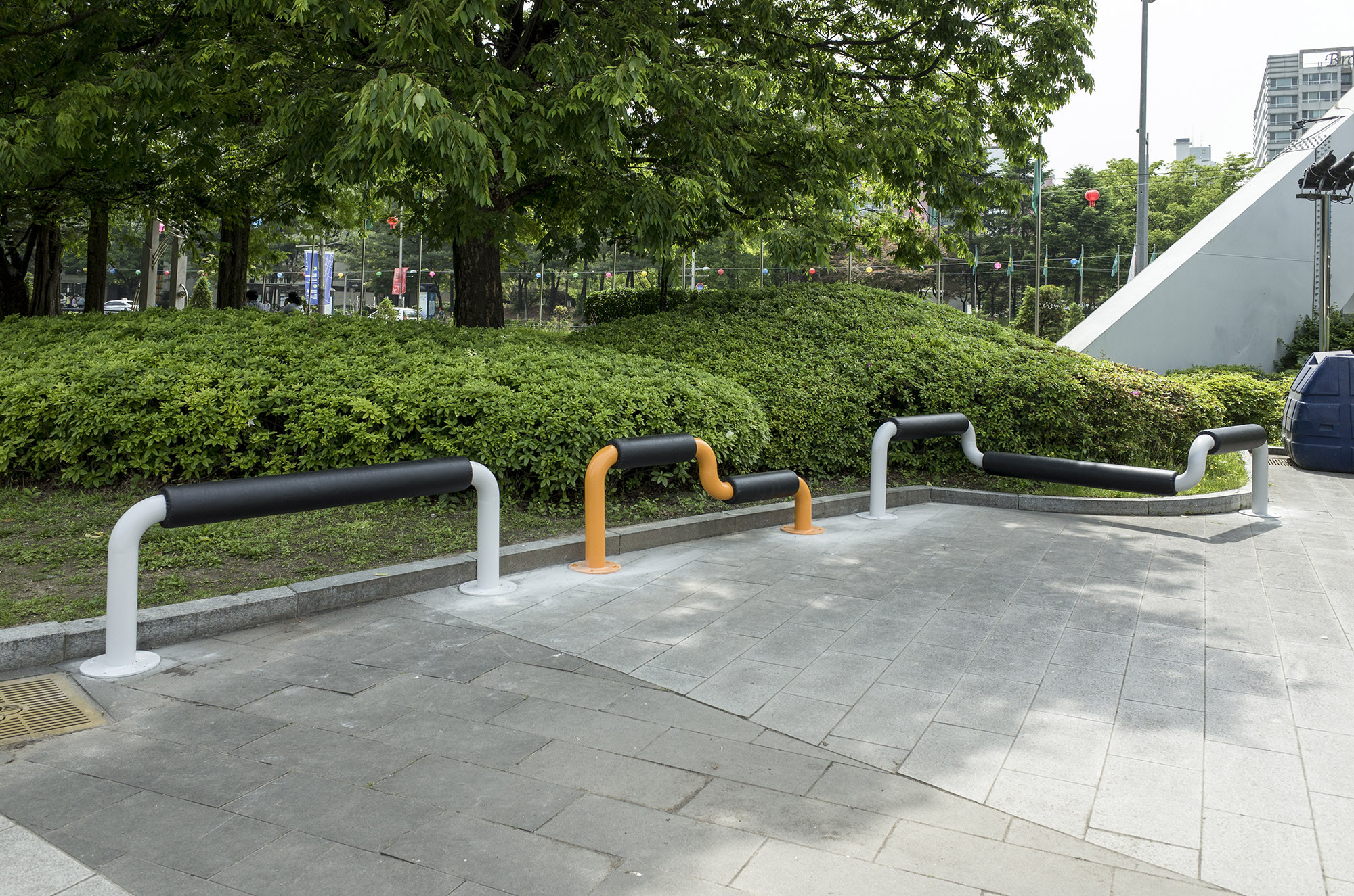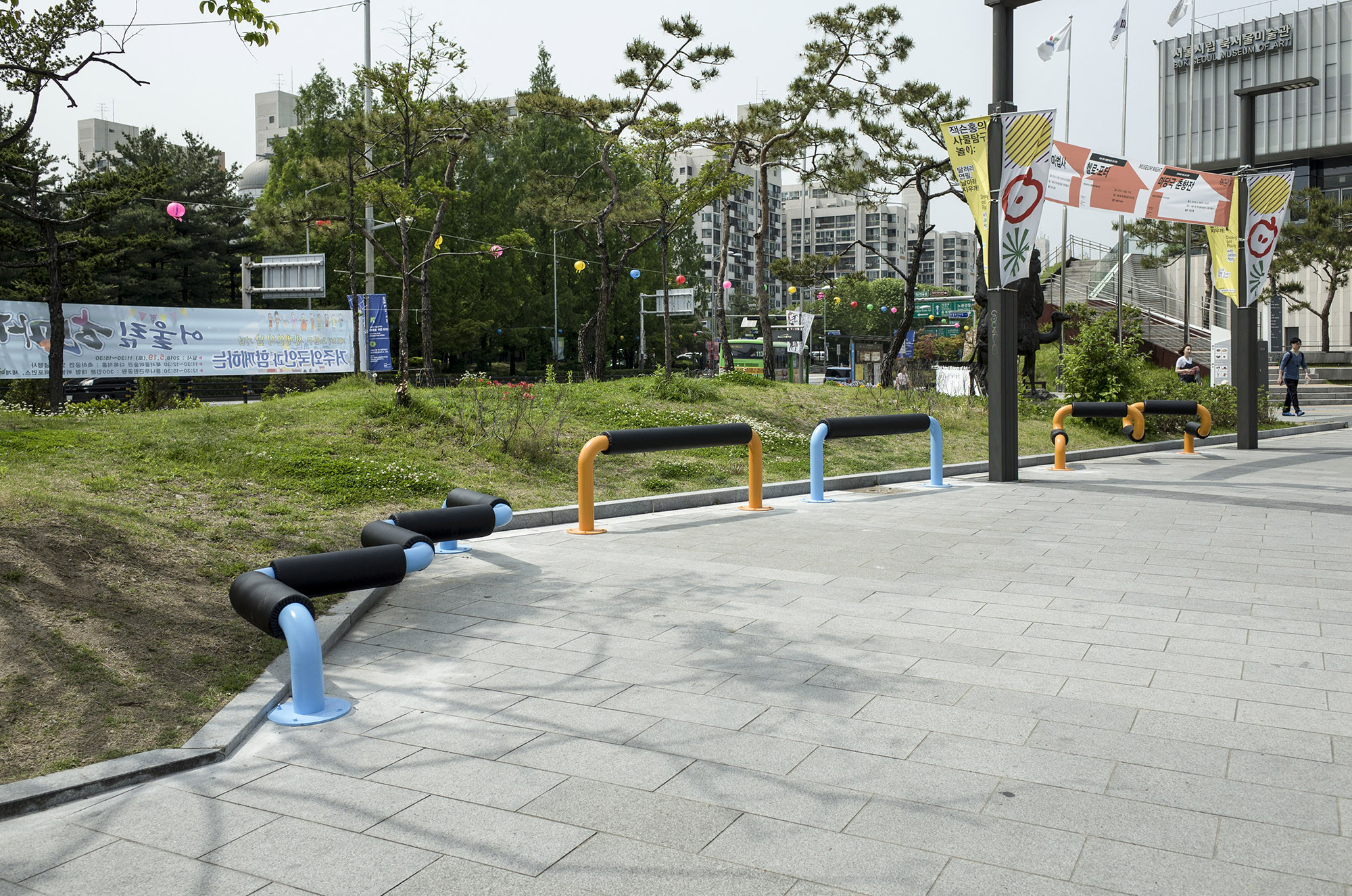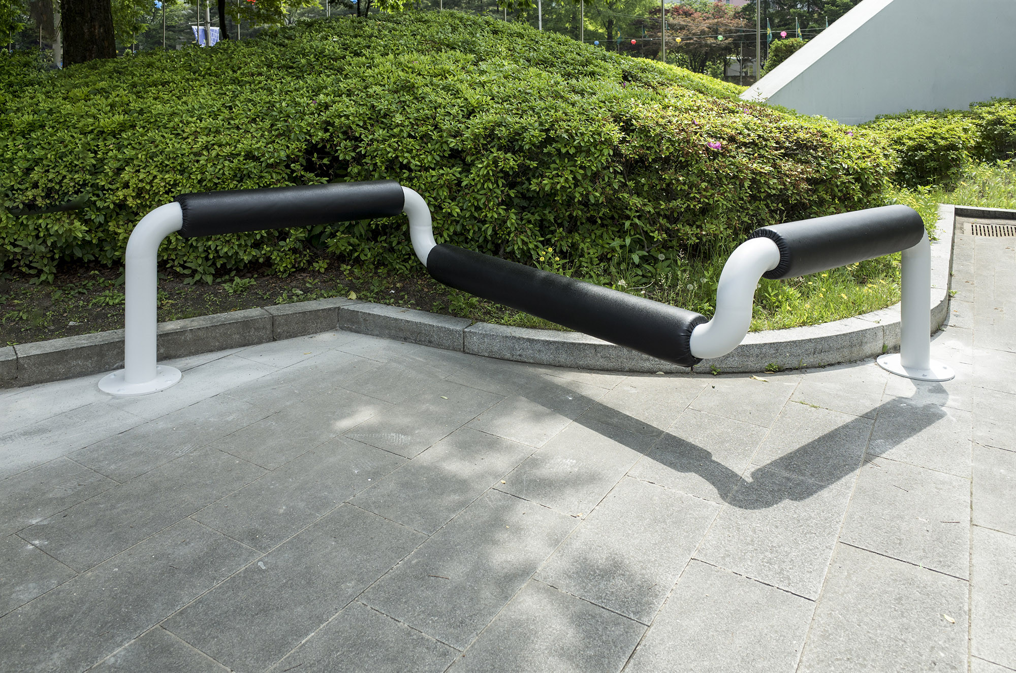 I participated as an artist in 'Seoul Focus 2018'. I received an invitation from the Buk Seoul Museum of Art to design a bench for the park in front of the museum. Rather than opting for a conventional bench design, I proposed a new approach. Typically, benches have wide seats and comfortable backrests, but considering that Koreans don't often sit for extended periods on park benches, I suggested a simple chair where one could perch. We were intrigued by the shape of bollards commonly seen in pedestrian walkways, which are structures that restrict access but seemed inviting for sitting. Therefore, we twisted and contorted the bollards to create various forms of modified bollards. Depending on the shape, they could function as chairs or stools, accommodating various usage scenarios, whether for prolonged sitting or brief resting.