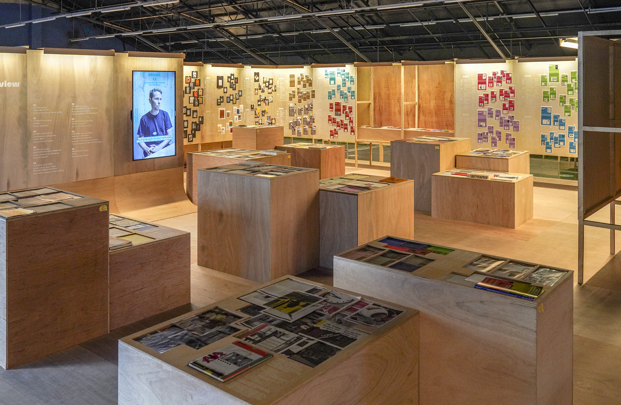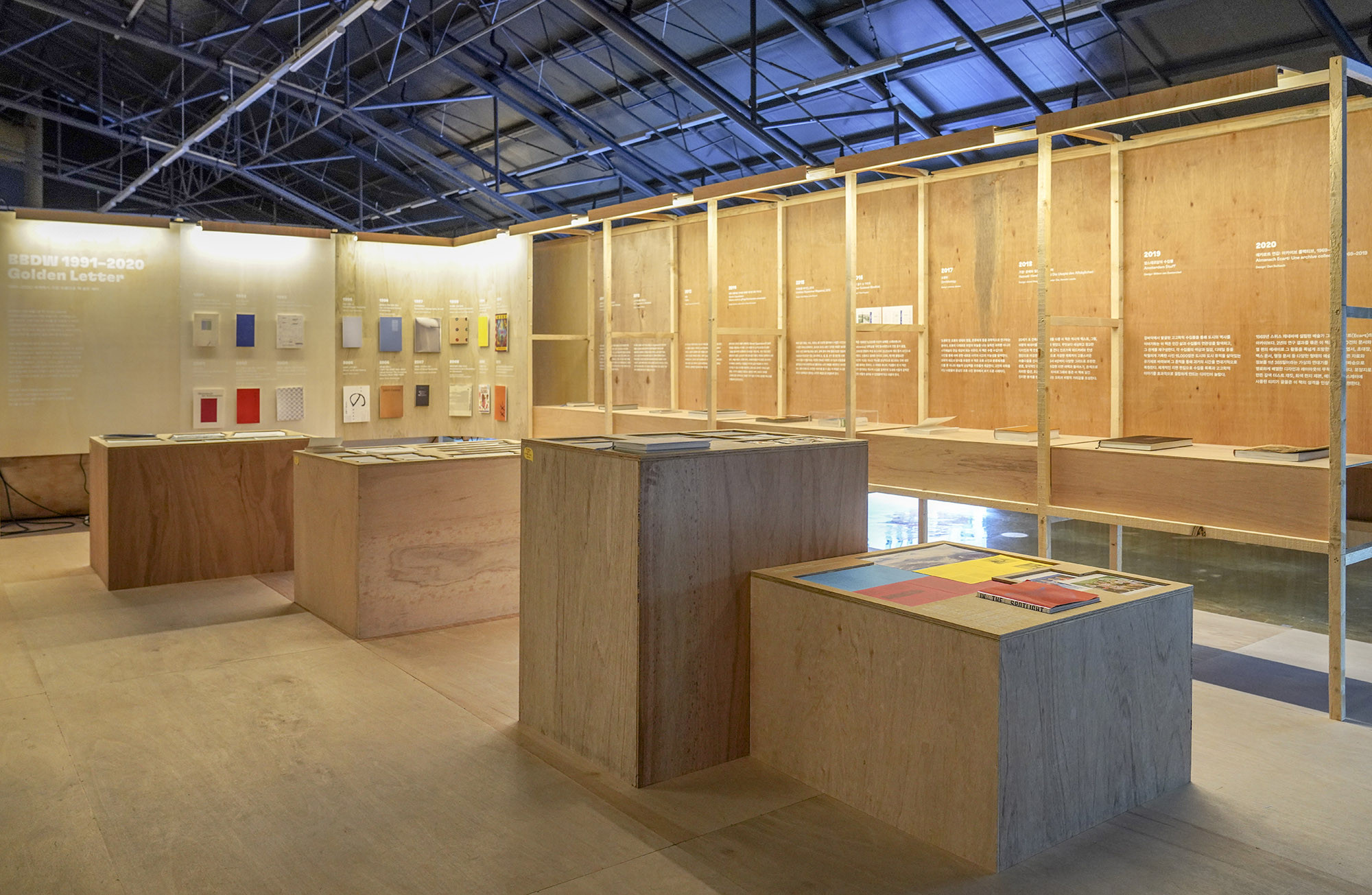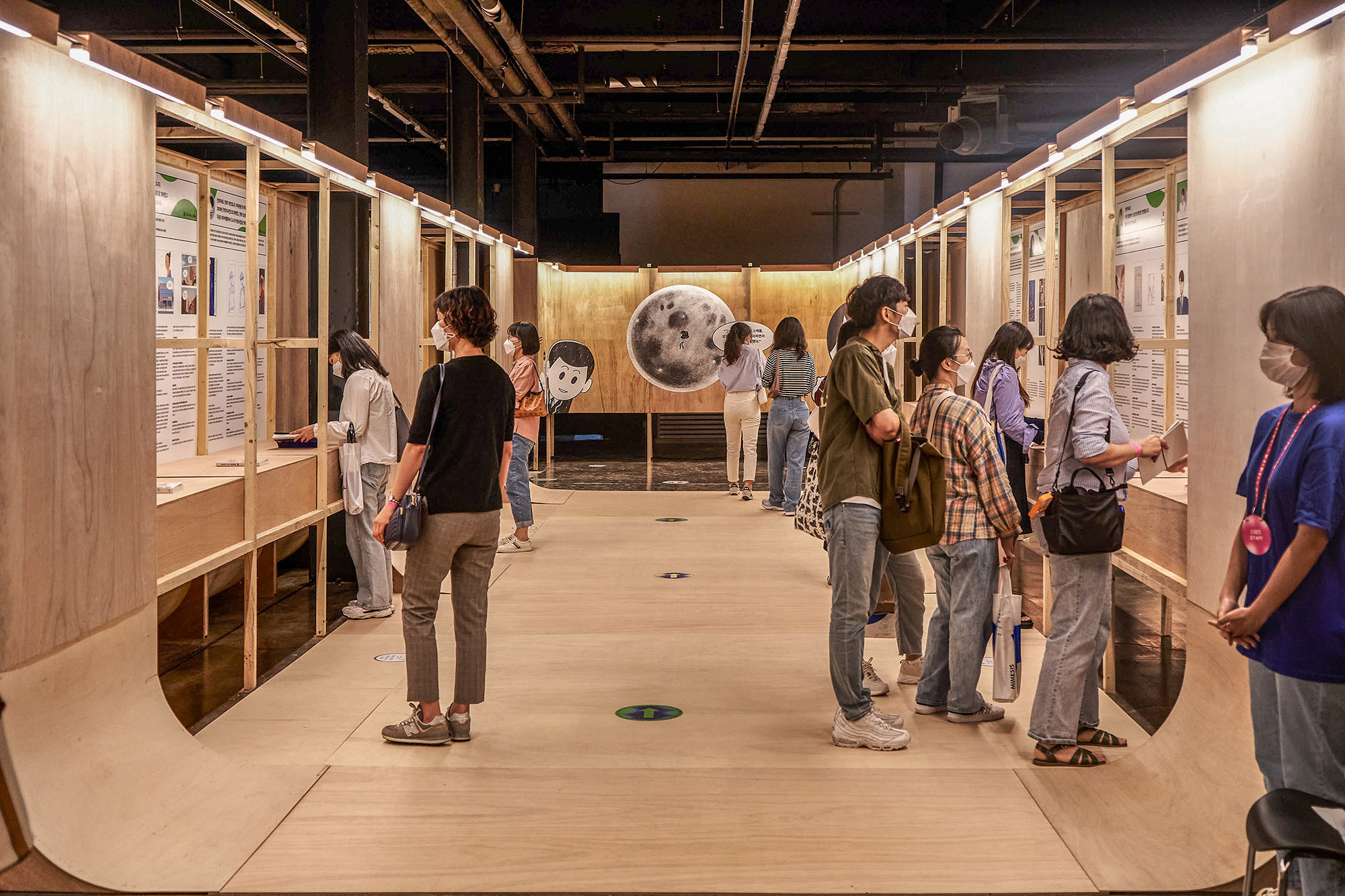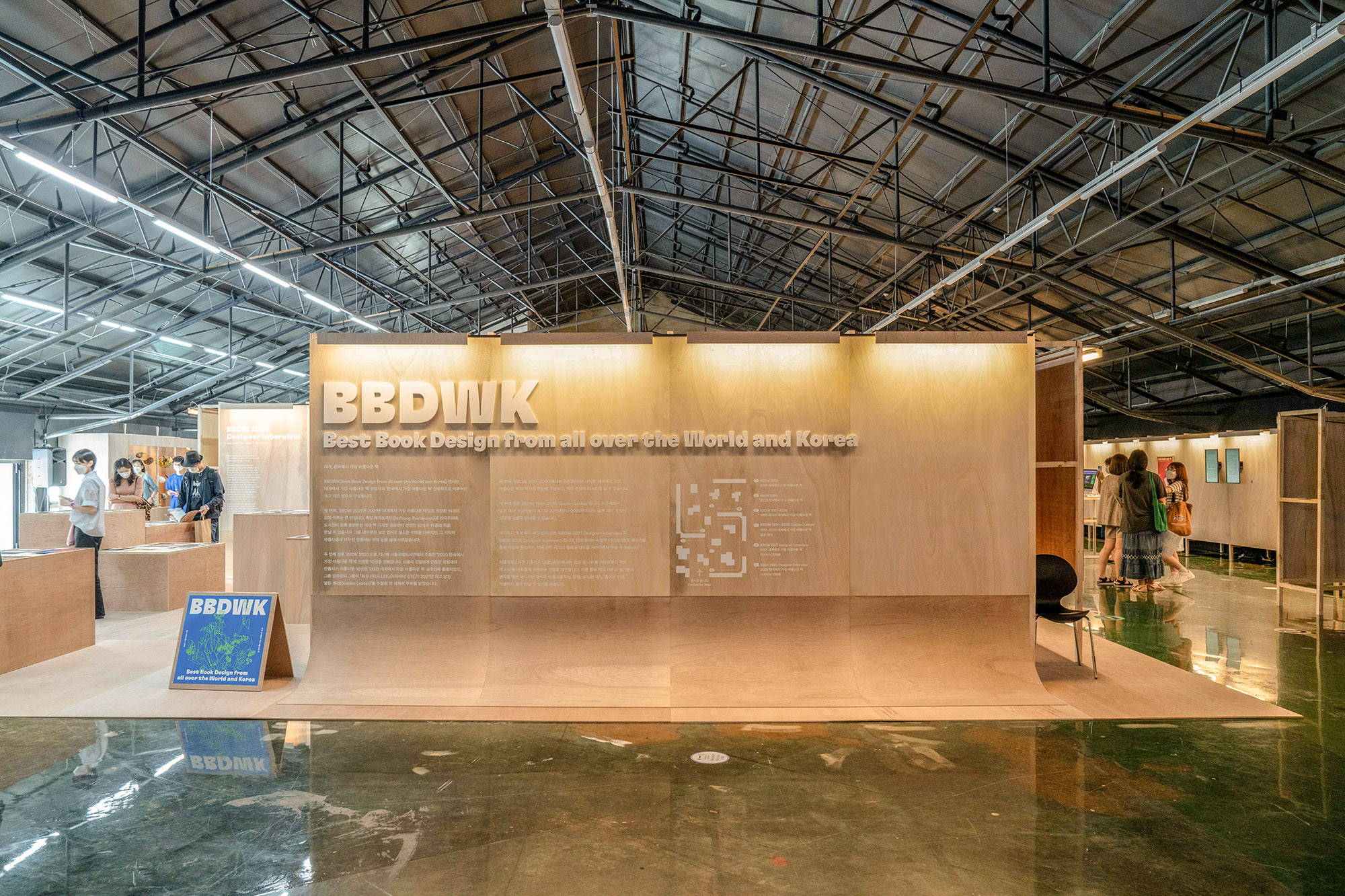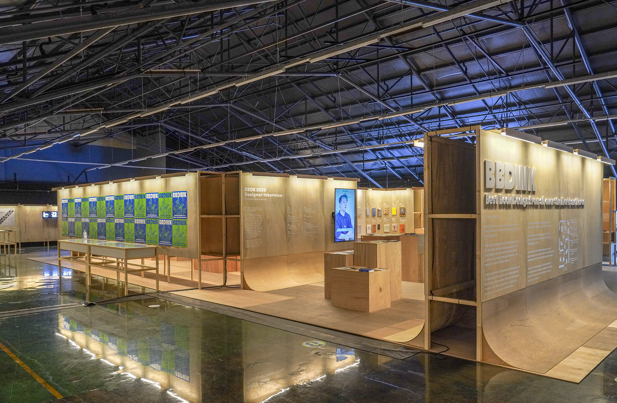 We designed the exhibition space for the Seoul International Book Fair held in 2021. 'The Korean Publishers Association' decided to host the event at 'SFACTORY' in Seongsu-dong instead of its previous venue at 'COEX'. The challenge was to create a larger space than in previous years with a limited budget. To overcome this, we simplified the design by using two types of materials and standardized all structures to a single size. By combining structures of the same size, we were able to reduce labor and material costs. We introduced various changes to prevent monotony that could arise from constructing long walls or rooms. However, using only right-angled walls posed a challenge in conveying the nuances of a book fair. To address this, we incorporated curved walls with an approximate radius of 450mm at the bottom, indirectly representing the essence of books through their physical form.