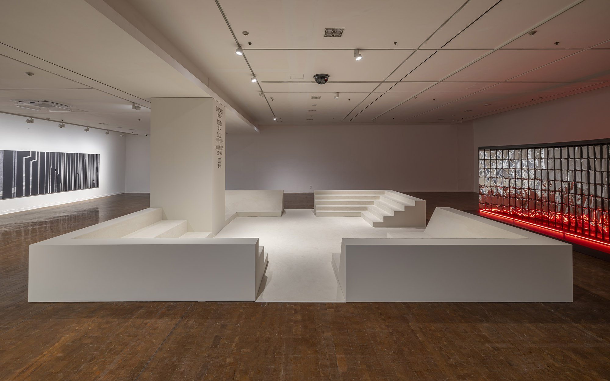 We designed the exhibition and also participated as an artist with a piece titled "Multipurpose Art Gallery." The contemporary public art museum has been recategorized as a venue for communal life sharing, with its functions broadening beyond the conventional scope of collection, exhibition, and education. Museum-goers are no longer solely focused on the museums’ scheduled programs; instead, they are anticipated to engage in a comprehensive experience that encompasses relaxation. This artwork serves as a multifunctional arena, facilitating a variety of activities, such as encouraging the audience to occupy seats of diverse designs, appreciate art as one would a landscape, engage in conversation, learn about art, and unwind. It acts as a conduit for fostering dialogues among professionals navigating the complex layers of the art scene, alongside elucidating the function and significance of public art museums.