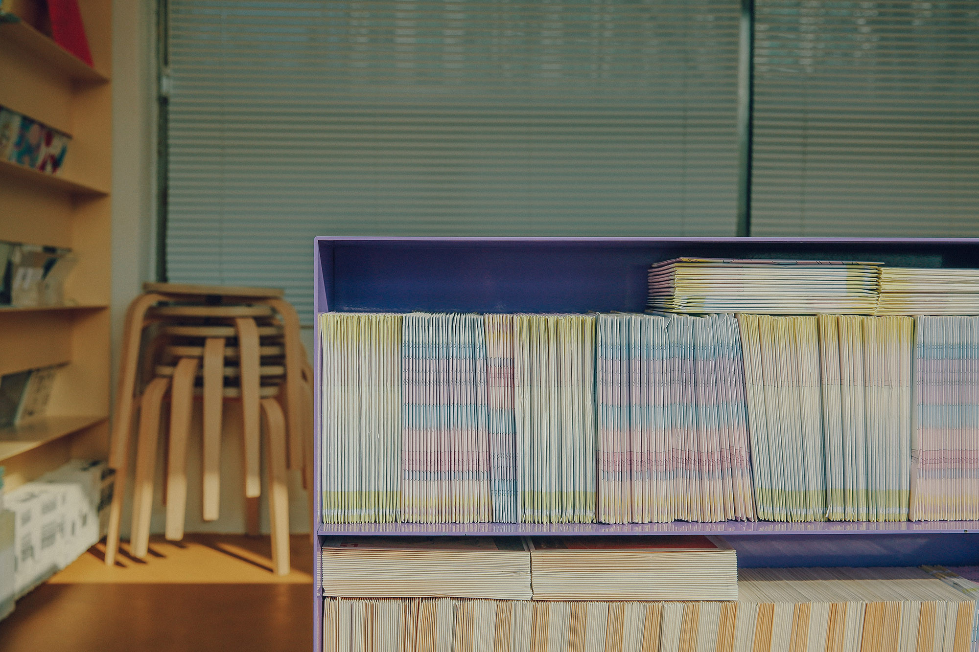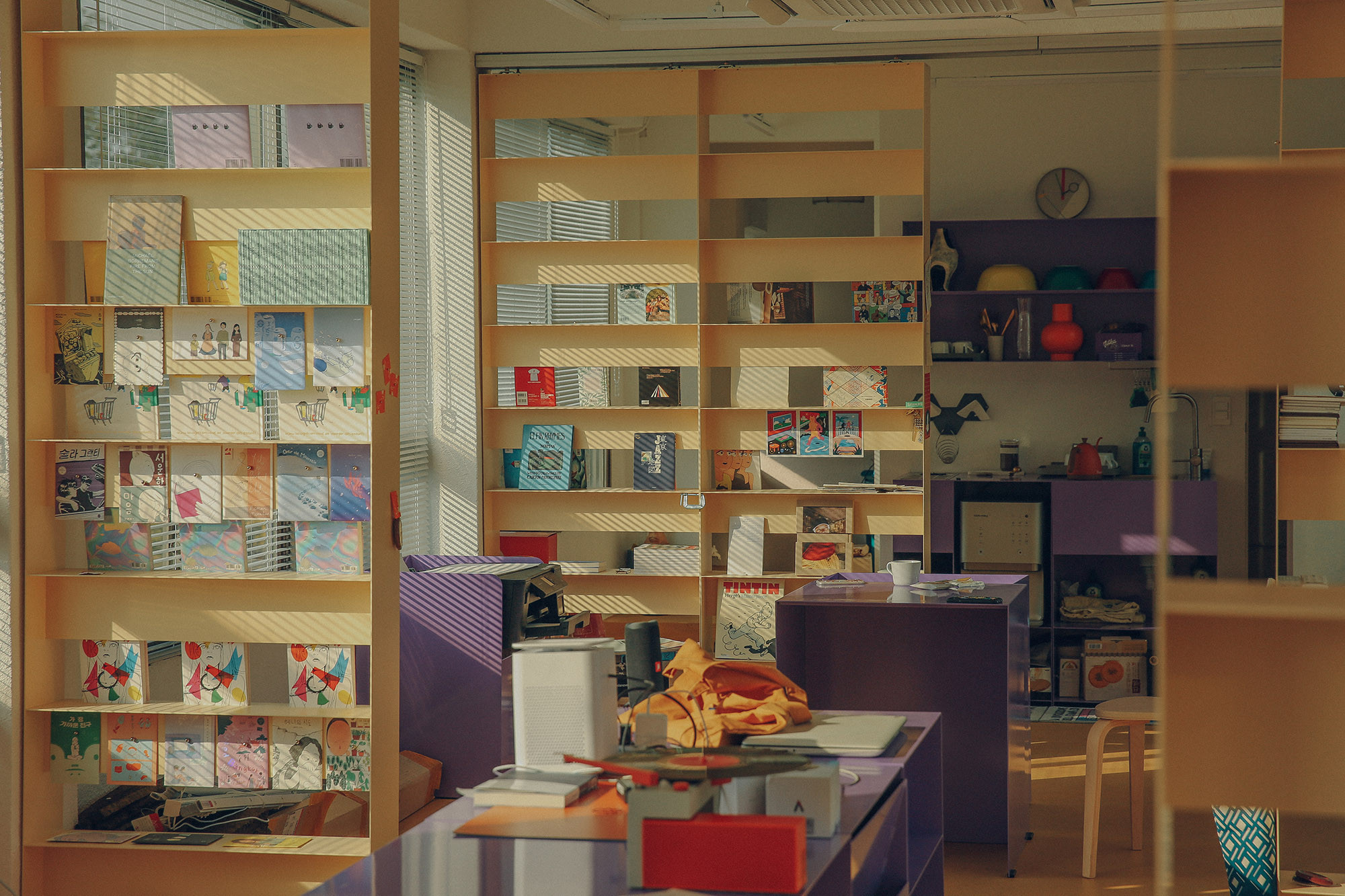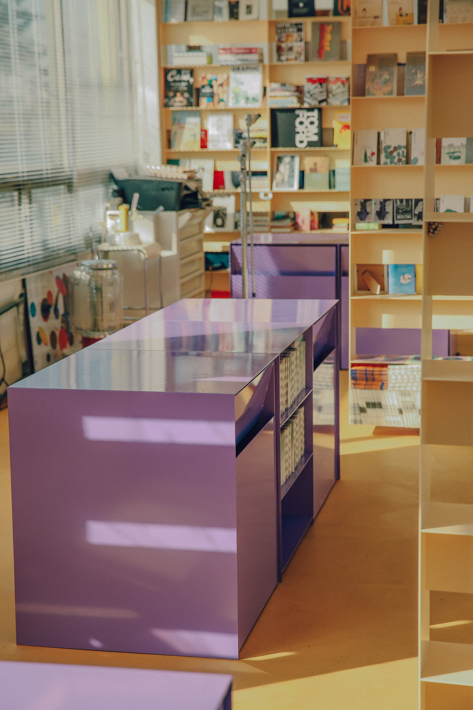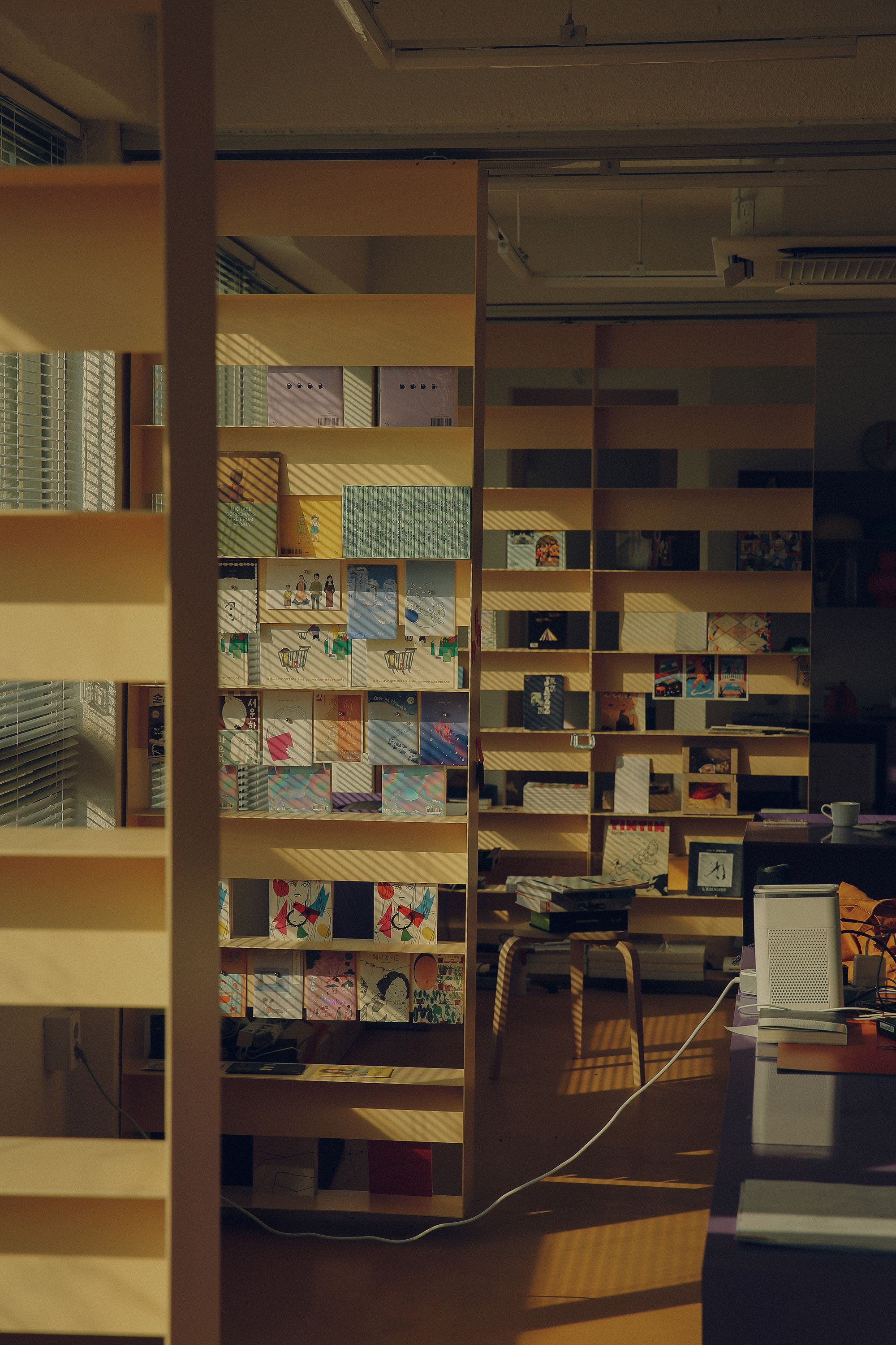 JJOKPRESS requested us to design a space approximately 4,000mm wide for a bookstore named SPINE. The space was located on the 2nd floor of a building with a narrow and elongated layout. Both walls were filled with floor-to-ceiling windows, leaving minimal space for bookshelves. We aimed to preserve the functionality of the windows and avoided obstructing them with walls or furniture. Fortunately, the space featured columns and beams positioned at 4,000mm intervals. With a total of 3 columns and beams dividing the windows, we utilized this structure by placing storage cabinets under the windows for books and items display, and hanging shelves under the beams. These shelves were mounted on rails, allowing them to move horizontally, providing flexibility in dividing and defining the space.