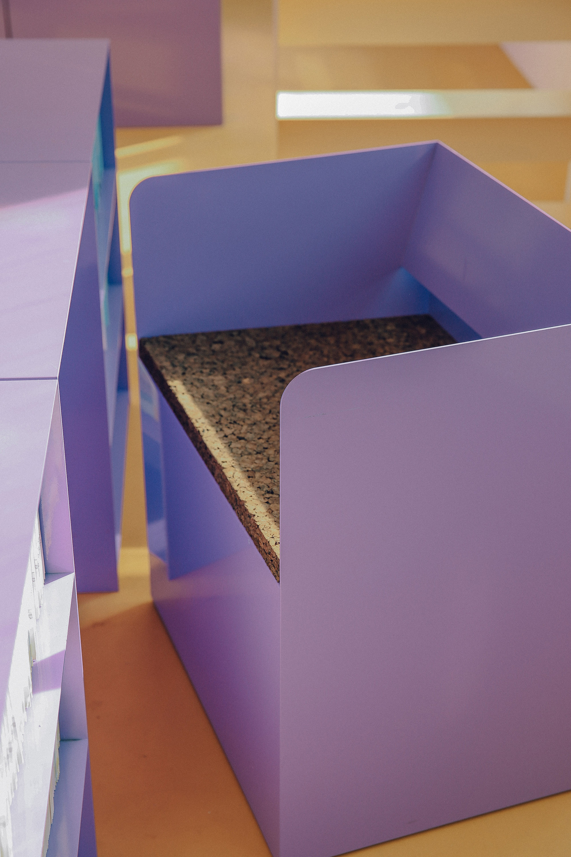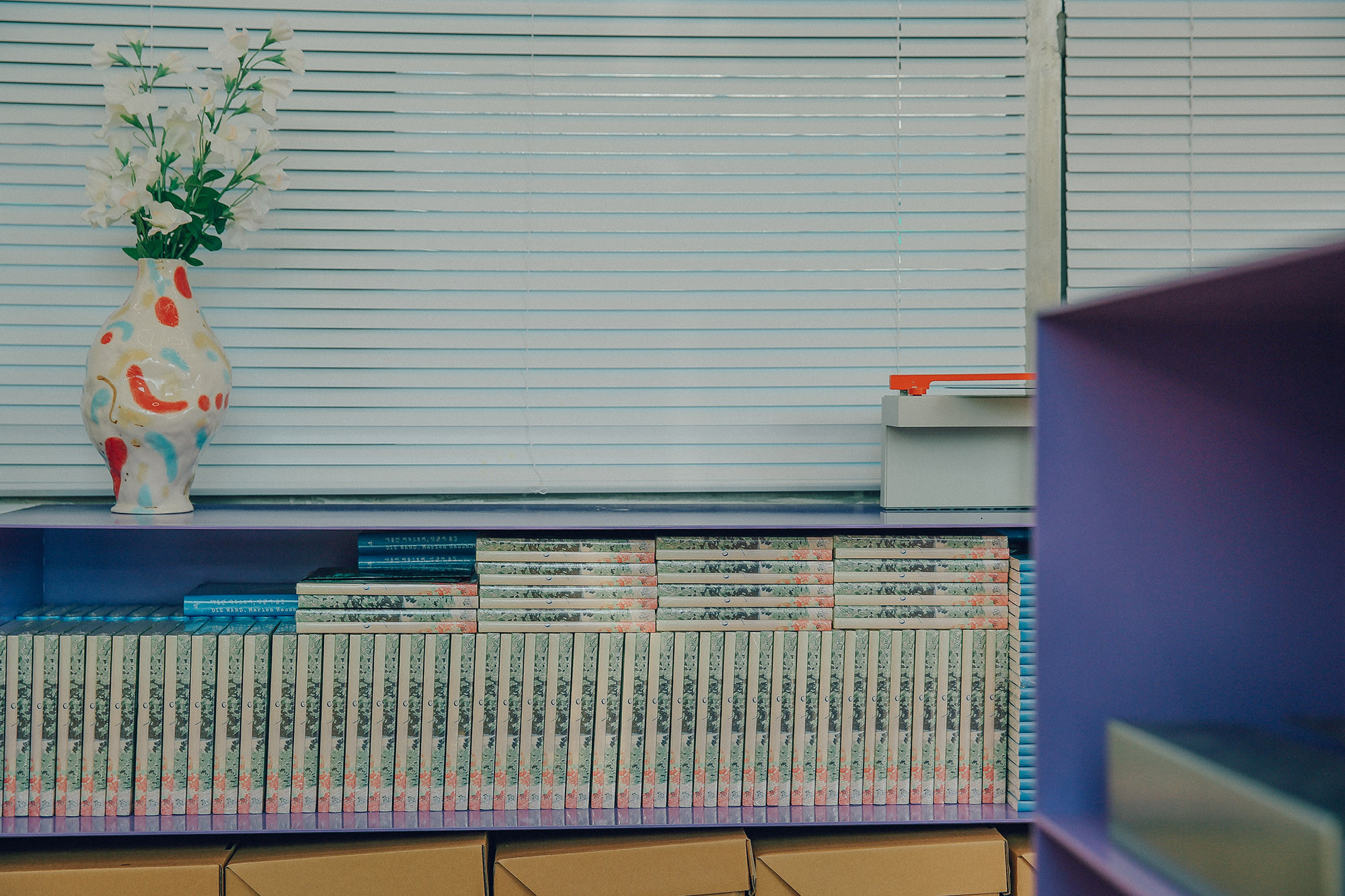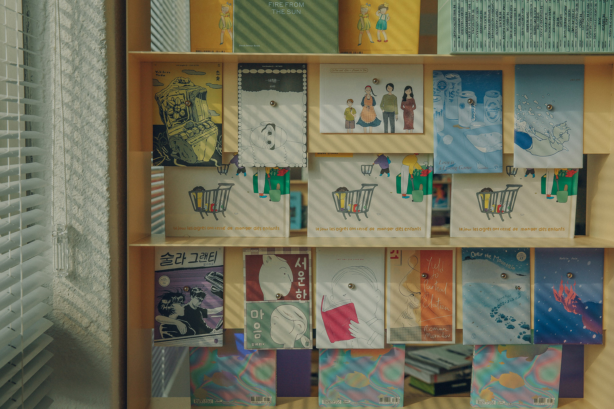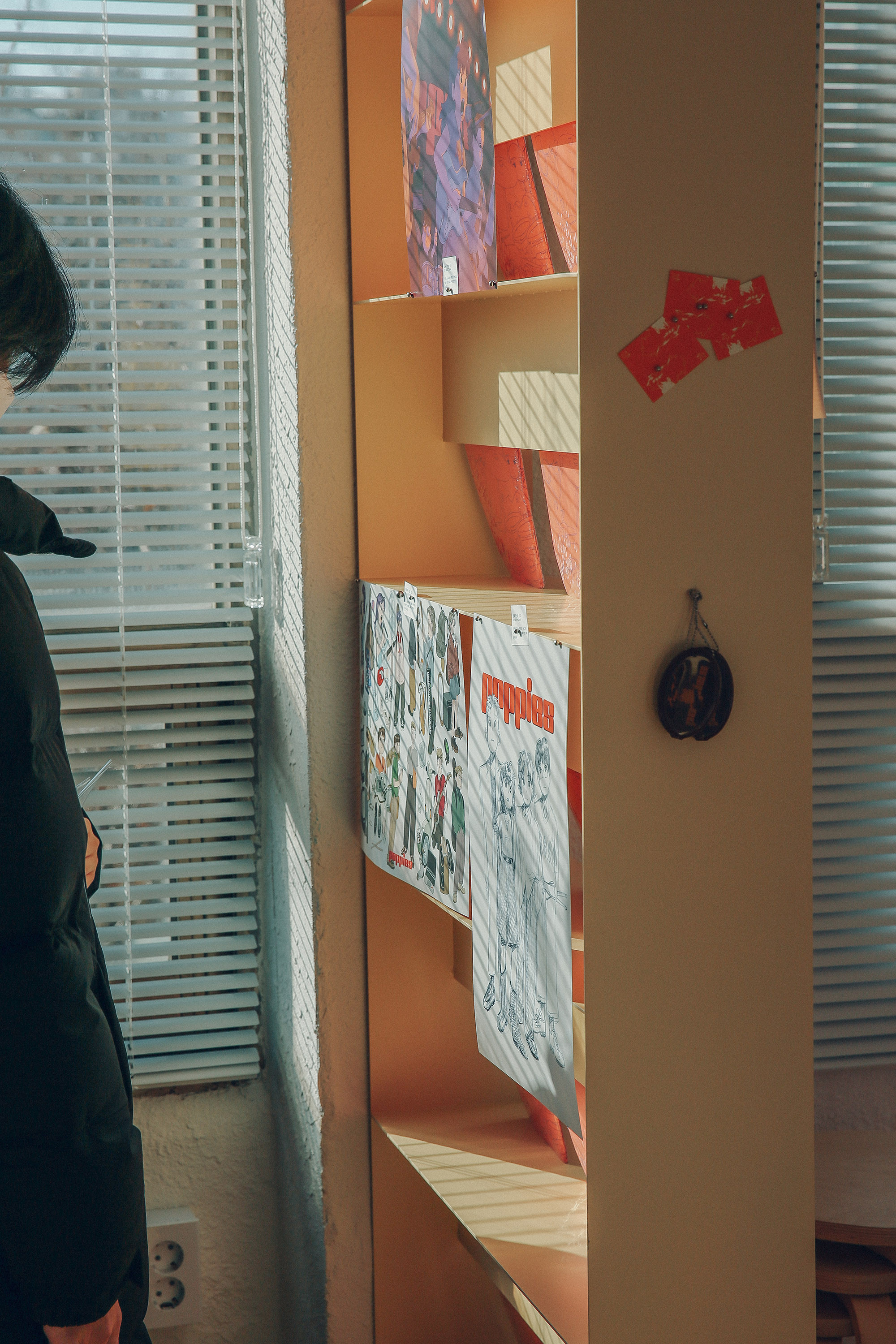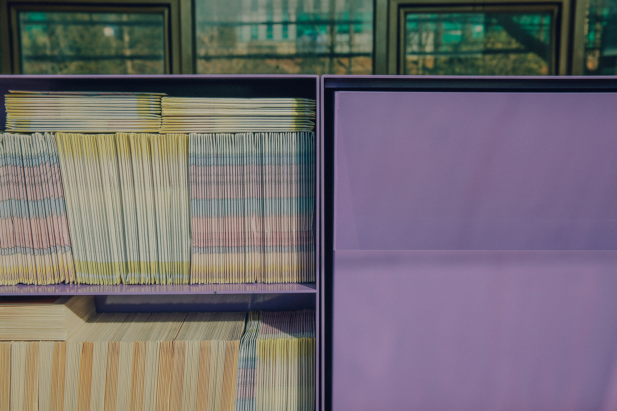 JJOKPRESS requested us to design a space approximately 4,000mm wide for a bookstore named SPINE. The space was located on the 2nd floor of a building with a narrow and elongated layout. Both walls were filled with floor-to-ceiling windows, leaving minimal space for bookshelves. We aimed to preserve the functionality of the windows and avoided obstructing them with walls or furniture. Fortunately, the space featured columns and beams positioned at 4,000mm intervals. With a total of 3 columns and beams dividing the windows, we utilized this structure by placing storage cabinets under the windows for books and items display, and hanging shelves under the beams. These shelves were mounted on rails, allowing them to move horizontally, providing flexibility in dividing and defining the space.
