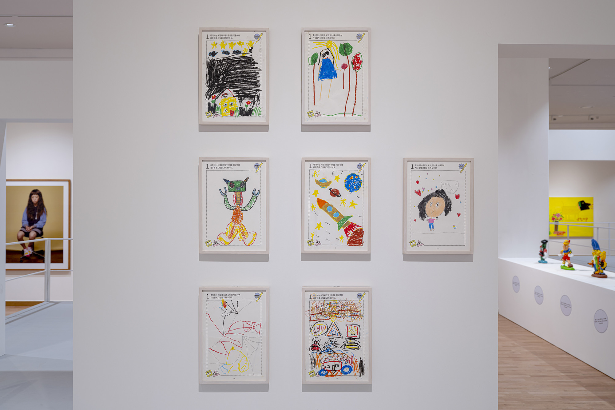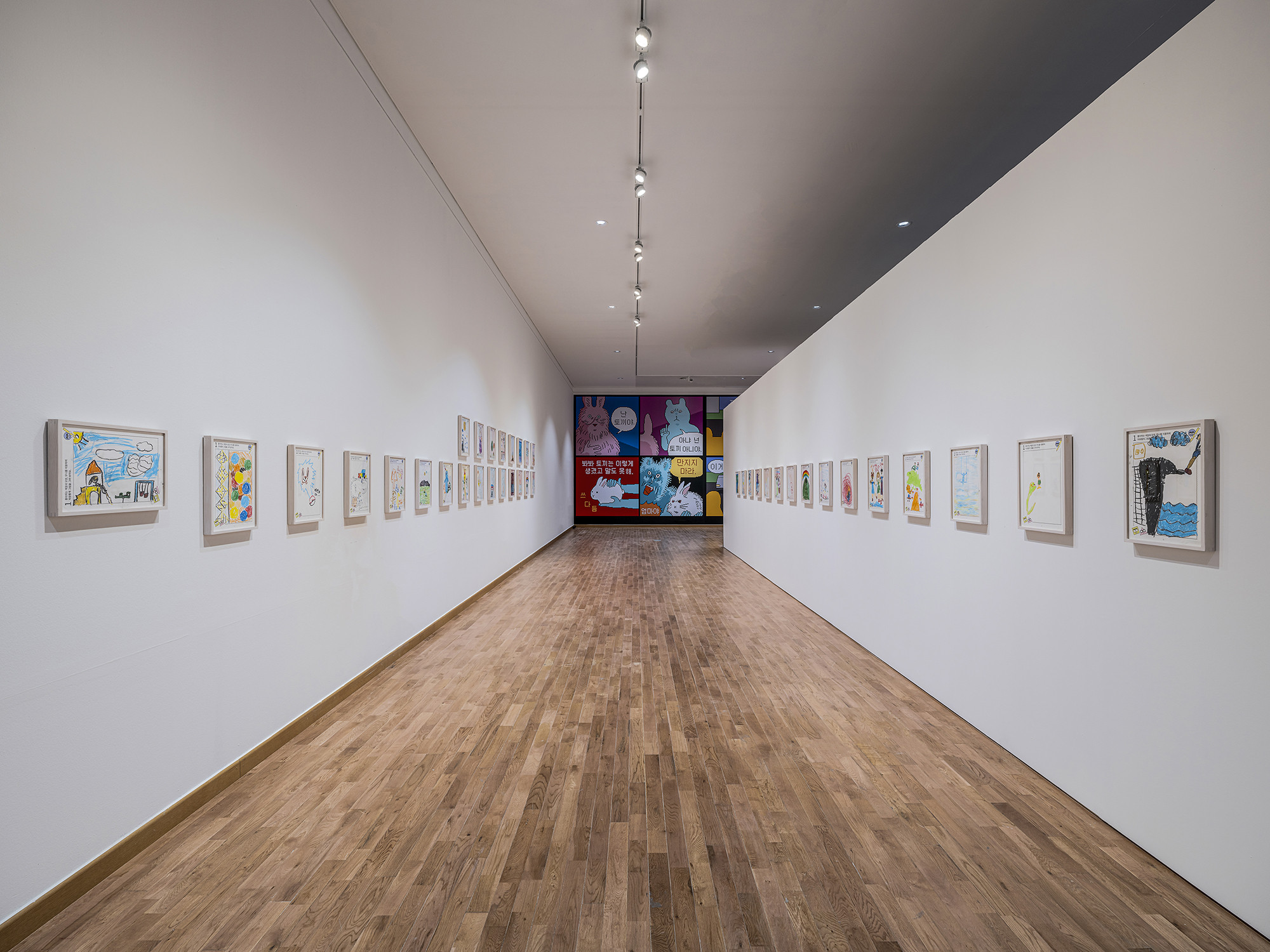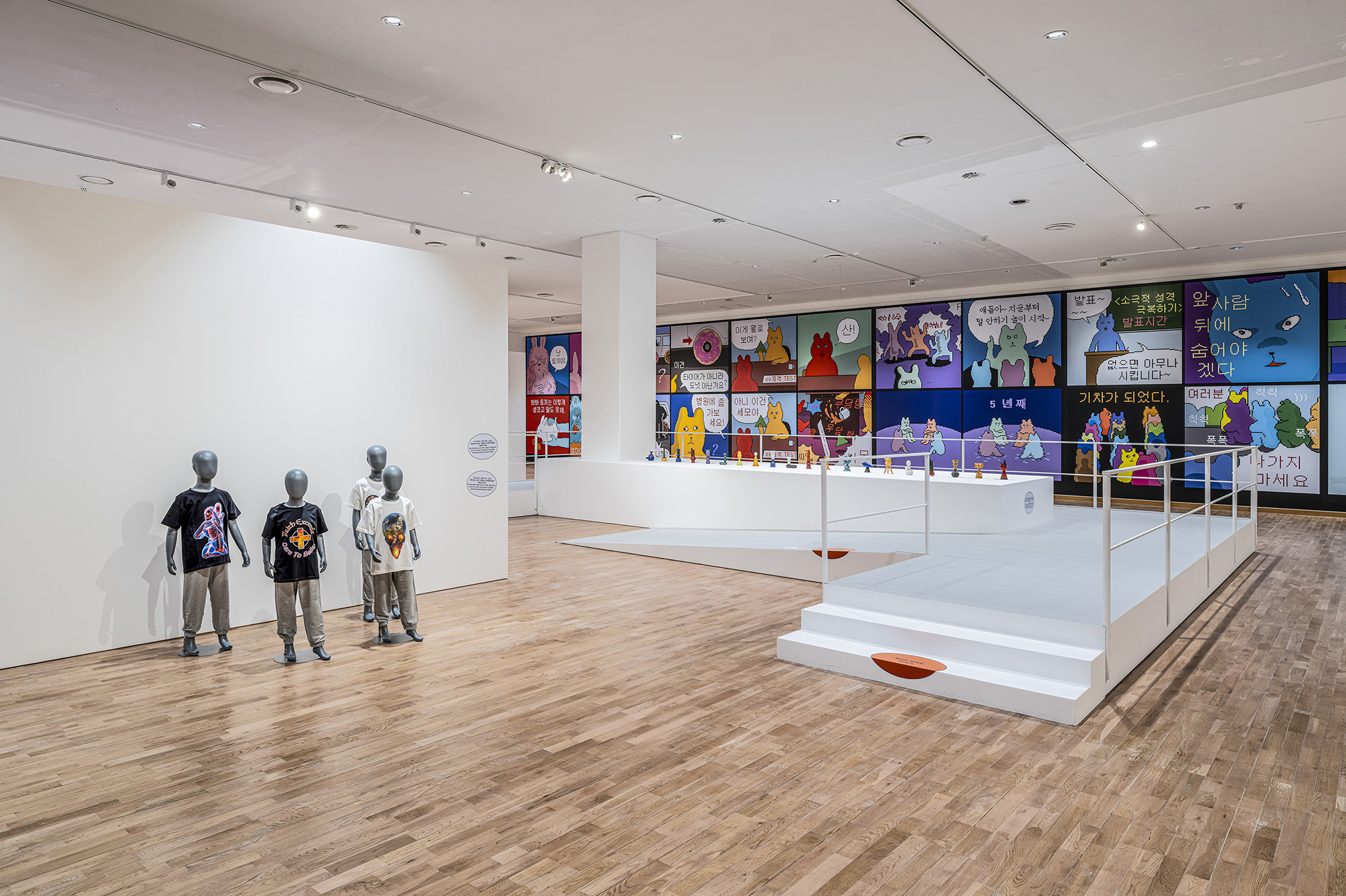 This project is for a children's exhibition at the Busan Museum of Contemporary Art. Instead of erecting walls and hanging paintings, we drew inspiration from elements typically found in playgrounds and reinterpreted them, placing these elements in a linear arrangement.
