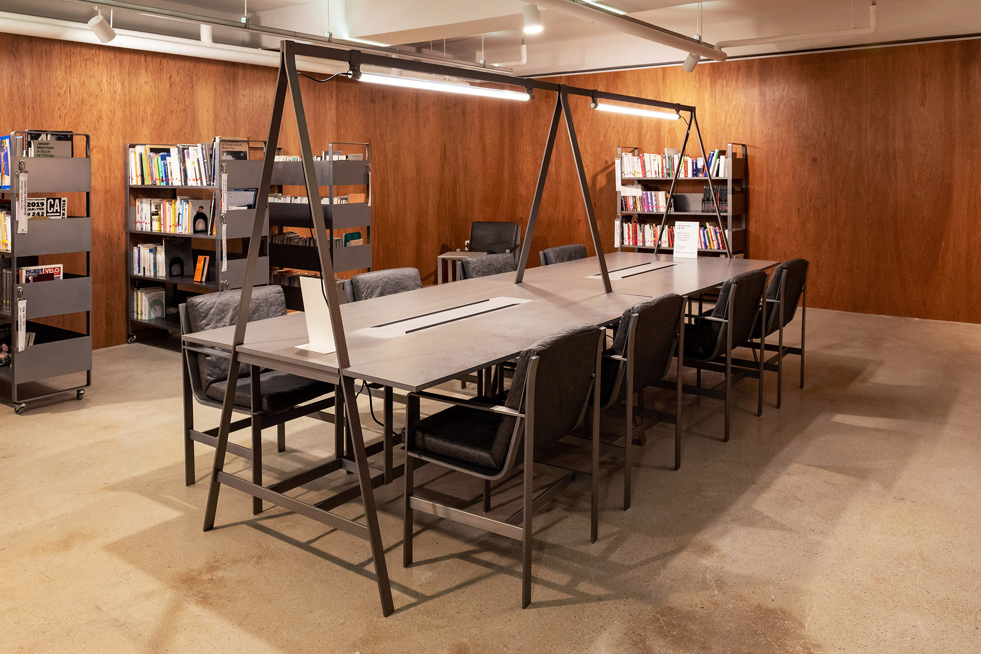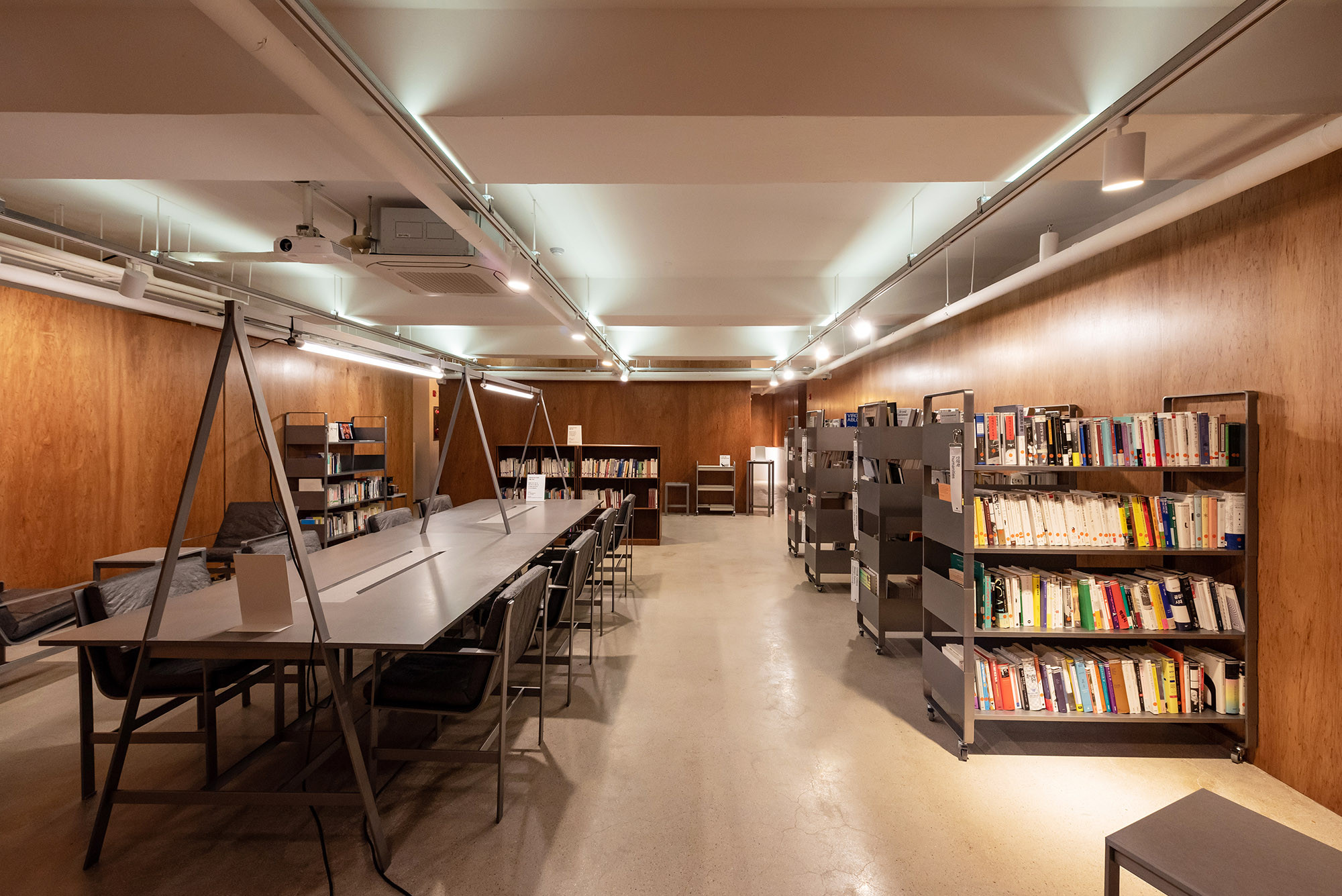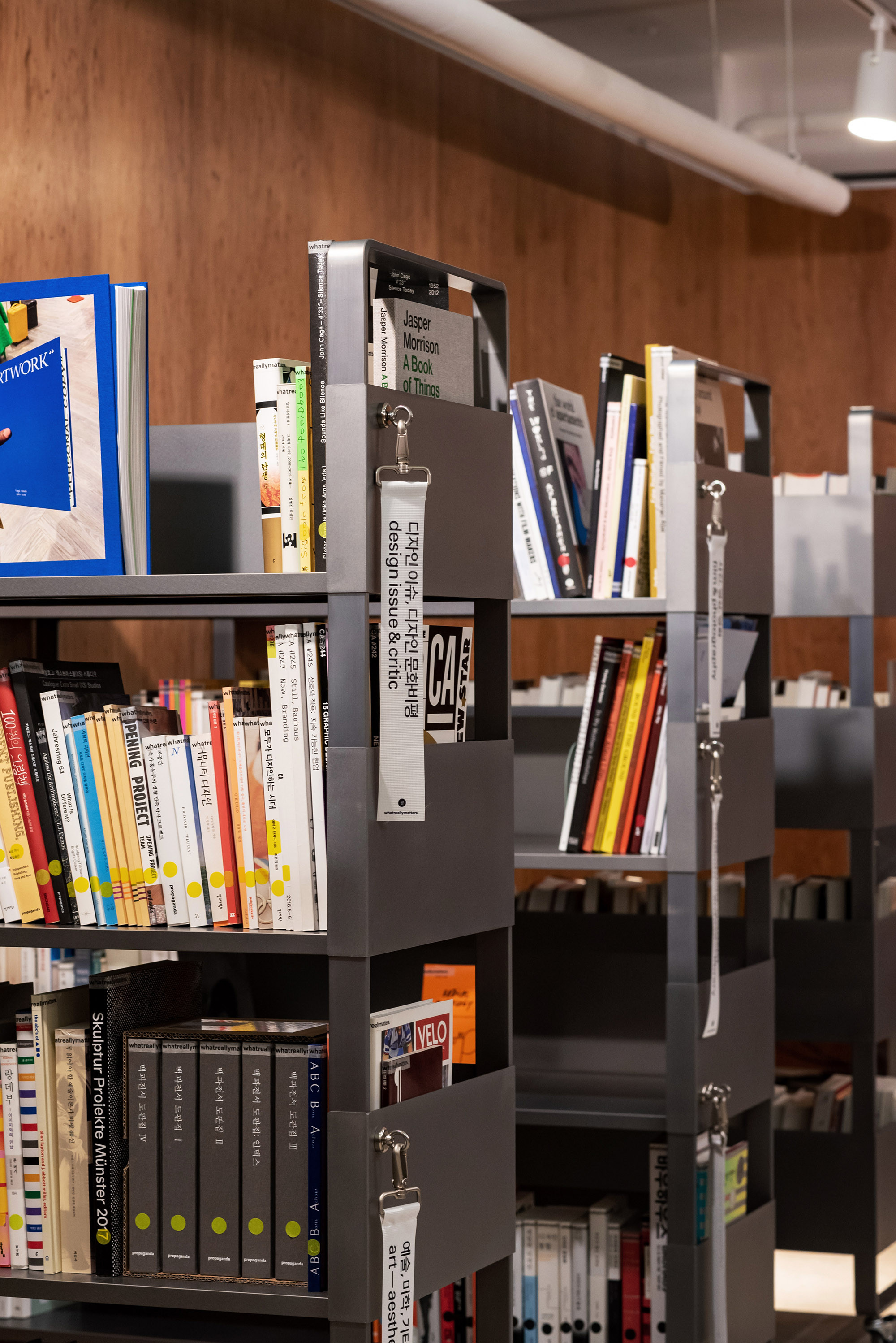 WRM's reference room is a special space that stimulates the creativity of designers, focusing on books in the fields of visual culture, publishing culture, and humanities, including graphic design and photography. Although the space could have been beautifully decorated using inexpensive furniture, WRM specifically commissioned furniture design to ensure that various types of furniture harmoniously coexist with a consistent design language. Requests were made for basic furniture designs such as bookshelves, sofas, armchairs, regular chairs, and large desks with bright lighting to create a small library. This space is designed to be utilized as a small library while also being able to transform into a lecture hall by moving desks and bookshelves. Furthermore, the sofa cushions were meticulously crafted using Tyvek fabric to provide a texture similar to paper, enhancing the experience of feeling like being surrounded by books.